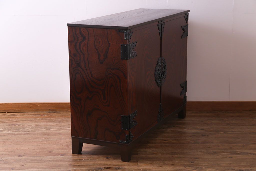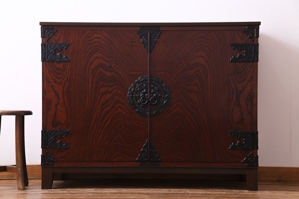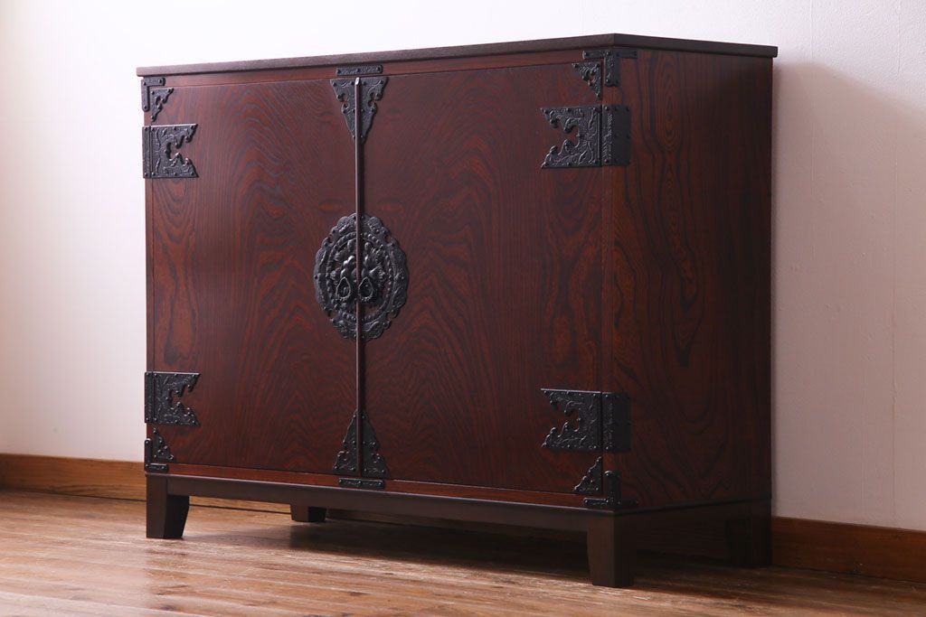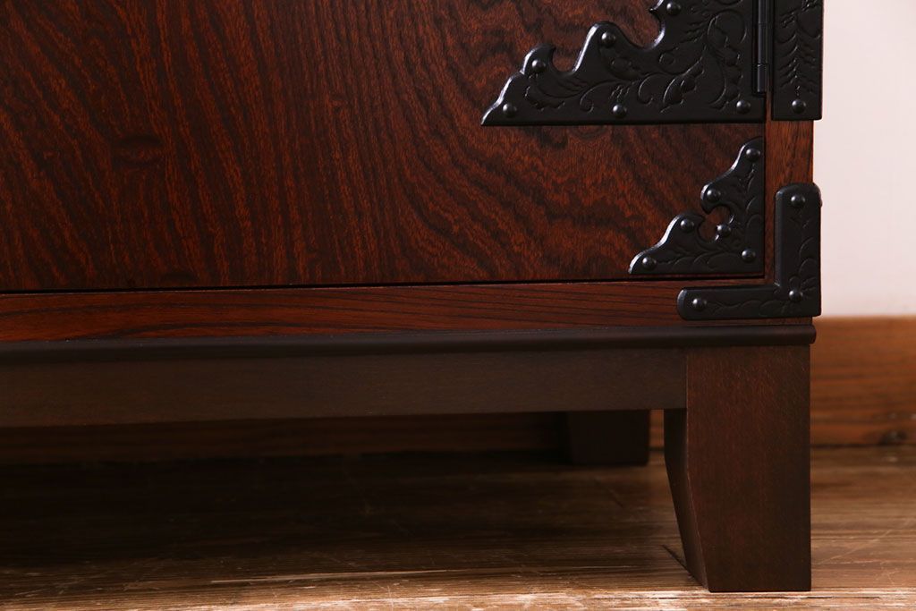 荘厳な佇まいが魅力的な伝統民芸家具、岩谷堂箪笥のローボードです。ダイナミックな木目と南部鉄器金具が目を惹く伝統美あふれる逸品です。当店で、フローリングのお部屋にも取り入れやすいように脚を取り付け、強度が増すように栗材の天板を付けました。扉内には衣装盆と引き出しが付いており、和服収納はもちろん、洋服をしまうチェストとしてもおすすめです。和モダンスタイルなど、落ち着いた和の空間づくりにいかがでしょうか。