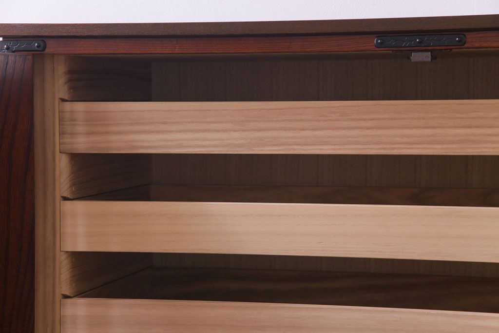 奥行がたっぷりとあり、収納力もばっちりな使い勝手の良い逸品です。シャツやニット、半袖など、服の種類ごとに4杯の引き出しを使い分ければ、整理整頓もしやすいですよ。靴下やストールなどの小物の収納場所として、丁度良いサイズの引き出しも3杯付いて便利です。扉、引き出しともにスムーズに動きます。