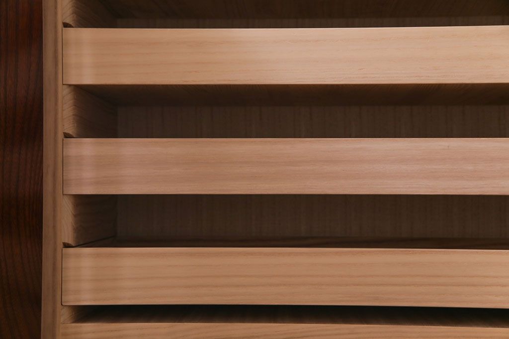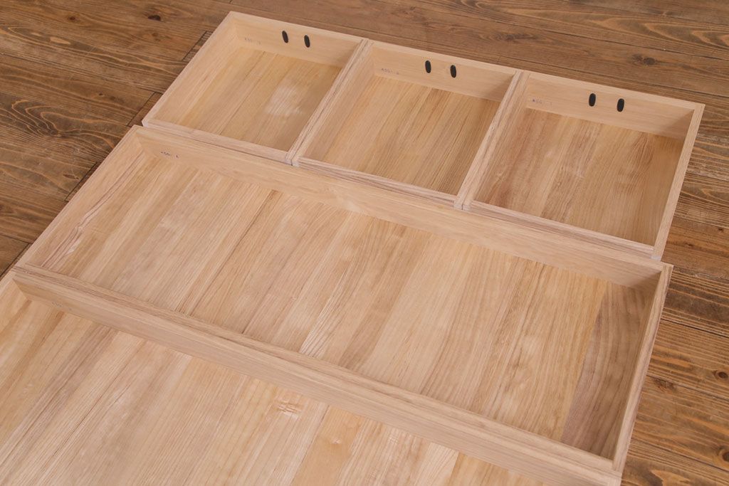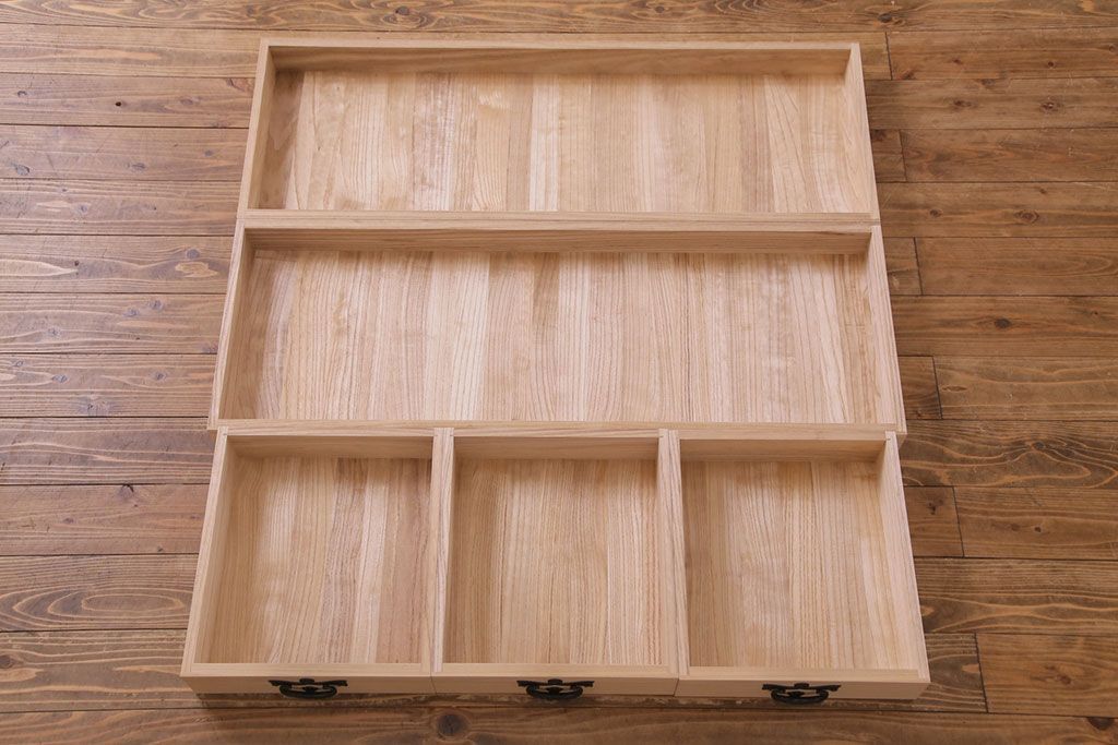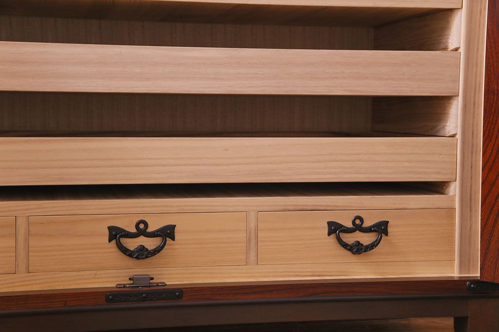 - 扉を開けると衣装盆と引き出しがございます。衣装盆と聞くと、和服に適しているのかなと感じますが、和服はもちろん洋服の収納にもおすすめです。衣装盆は深さが浅いため、洋服を探したい時にもさっと見つけられて便利です。3杯の引き出しは、小物の整理整頓にぴったりですね。