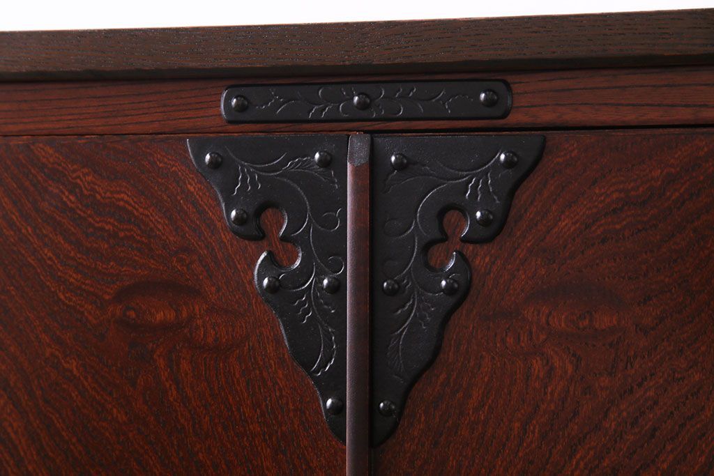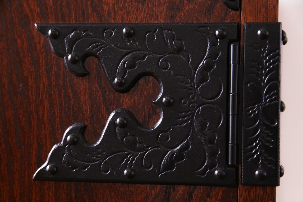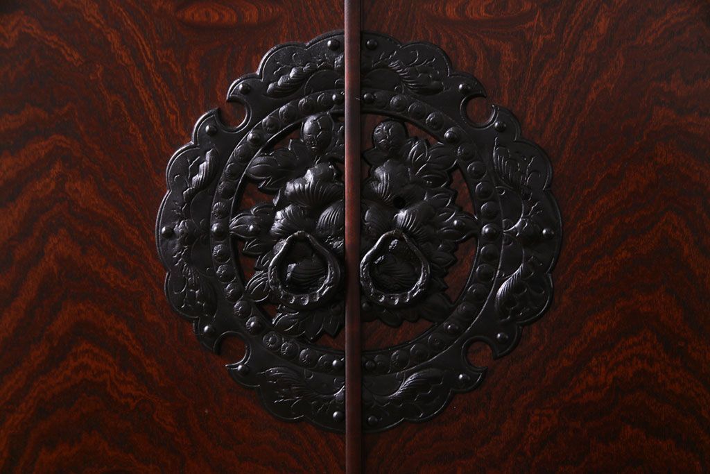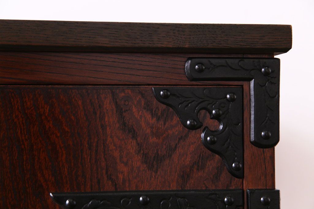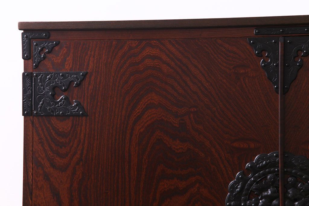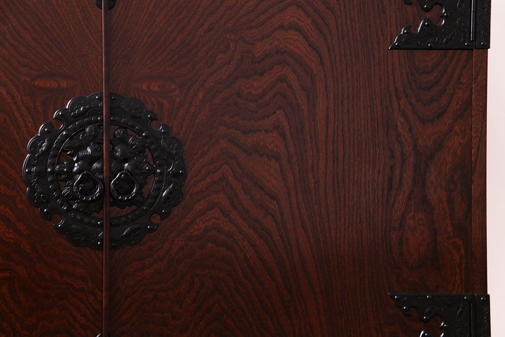 - なんといってもまず目が行くのは、存在感のある金具です。赤みがかった上品な木の色に、漆黒の南部鉄器金具が際立って、思わずはっとする豪華さです。力強い木目が和の渋さを感じさせるとともに、どこか気品さも漂わせる情緒あふれる逸品です。上質な和の空間づくりにぴったりのお品ですよ。