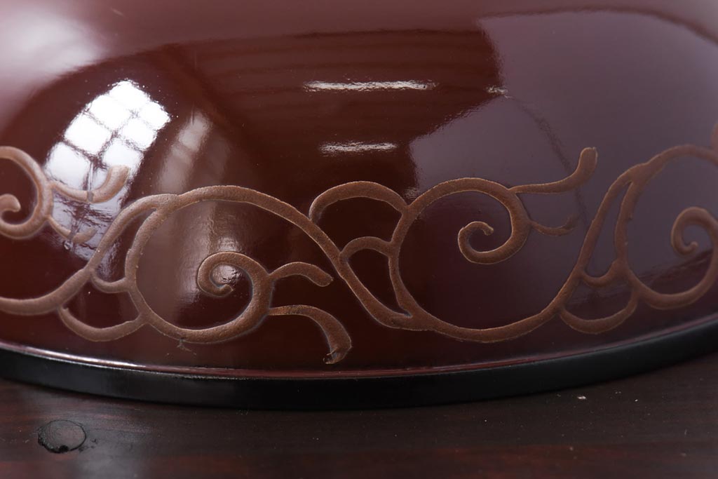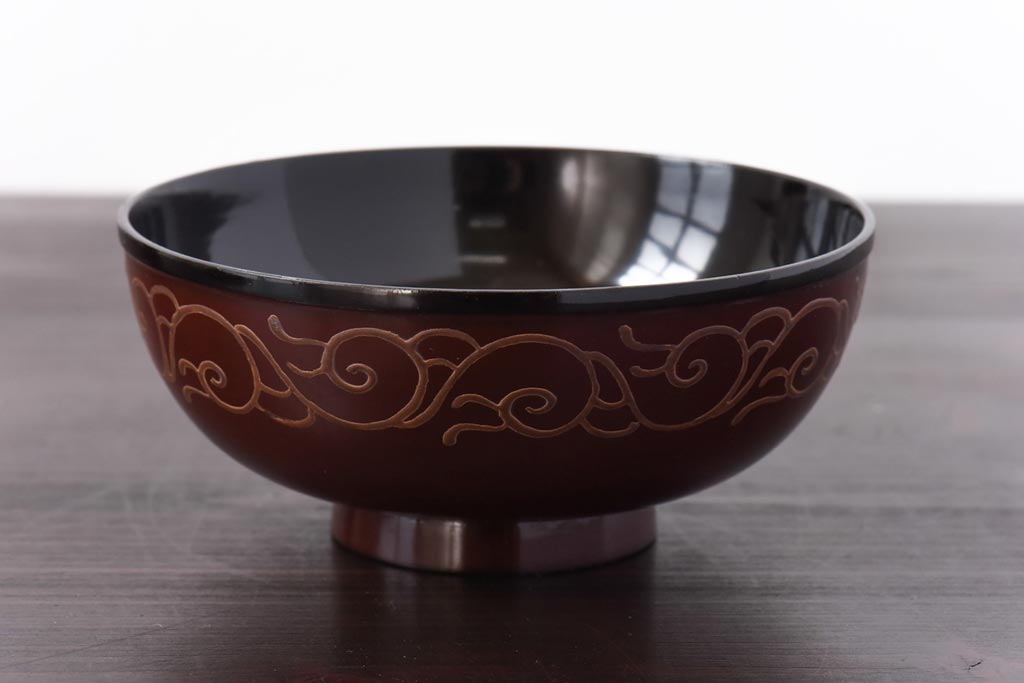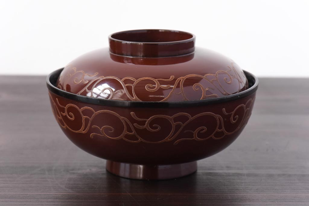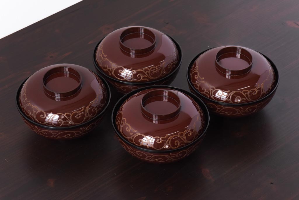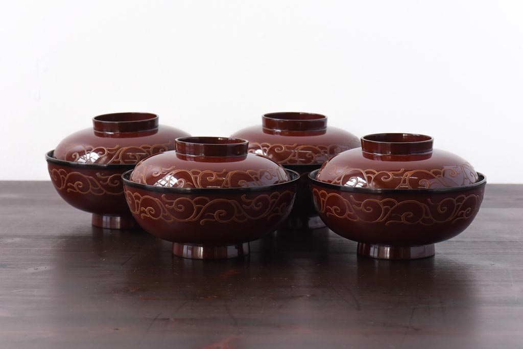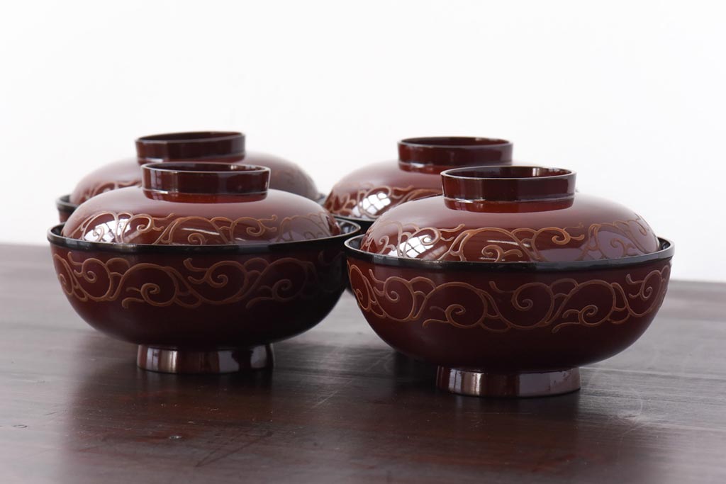 和製アンティーク アジアンな図柄が目を引く蓋付き木製椀(漆器、和食器)4客セット