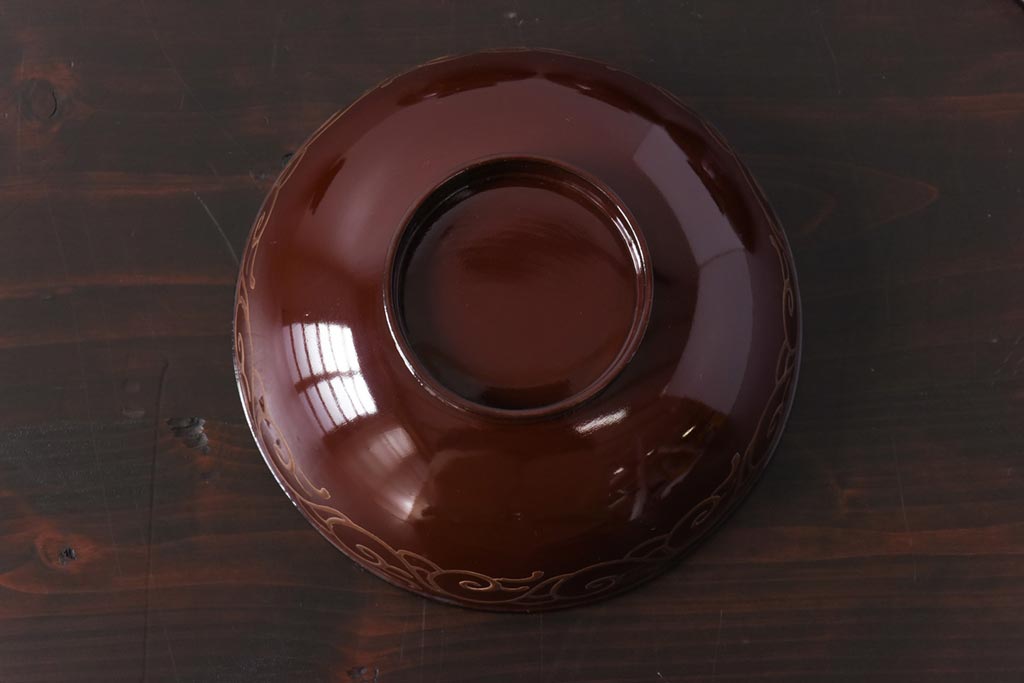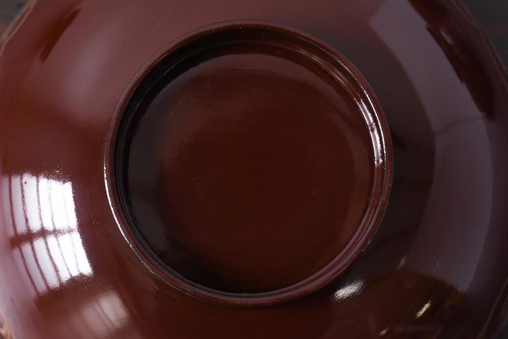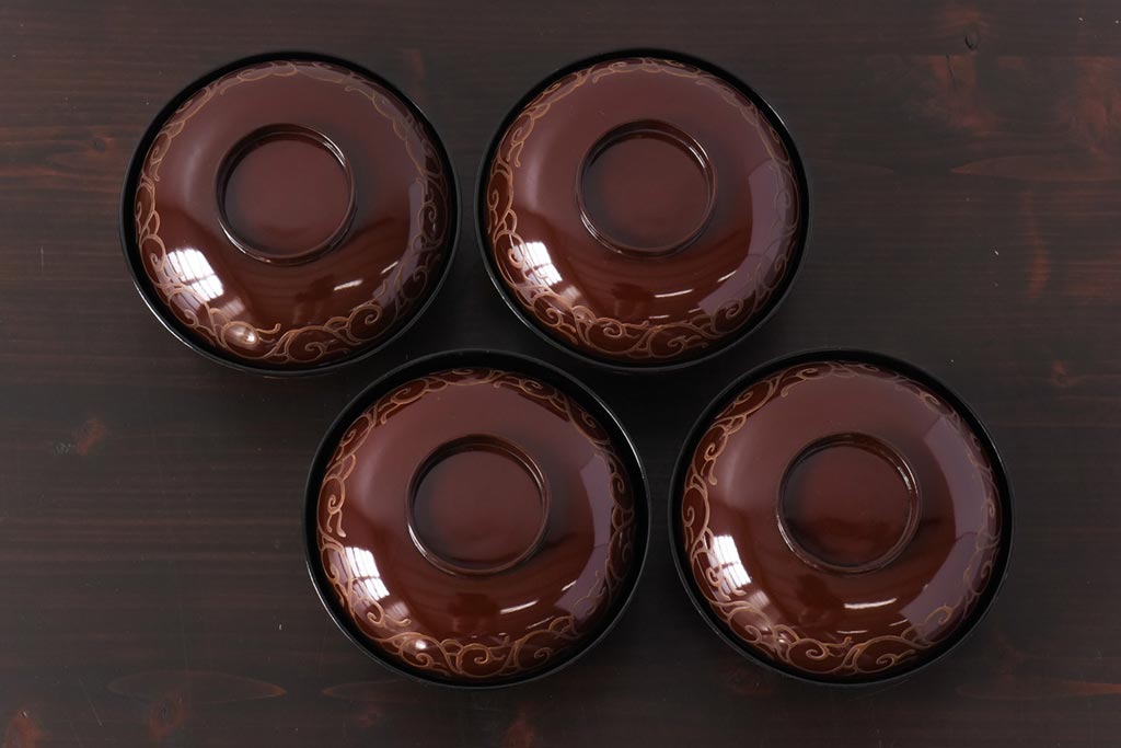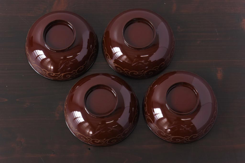 ラフジュ工房> 和食器・茶道具> お椀・茶碗 > 和製アンティーク アジアンな図柄が目を引く蓋付き木製椀(漆器、和食器)4客セット