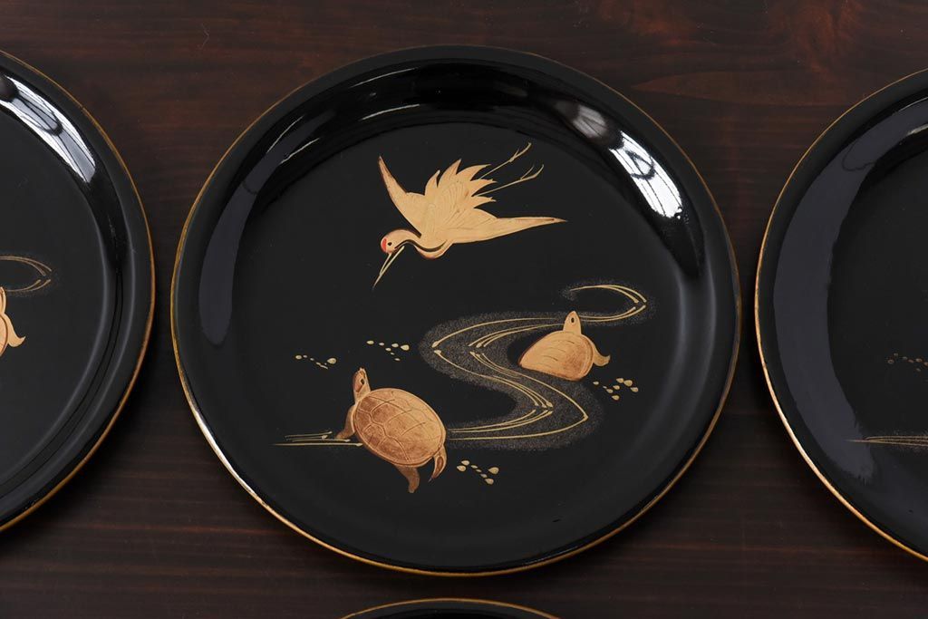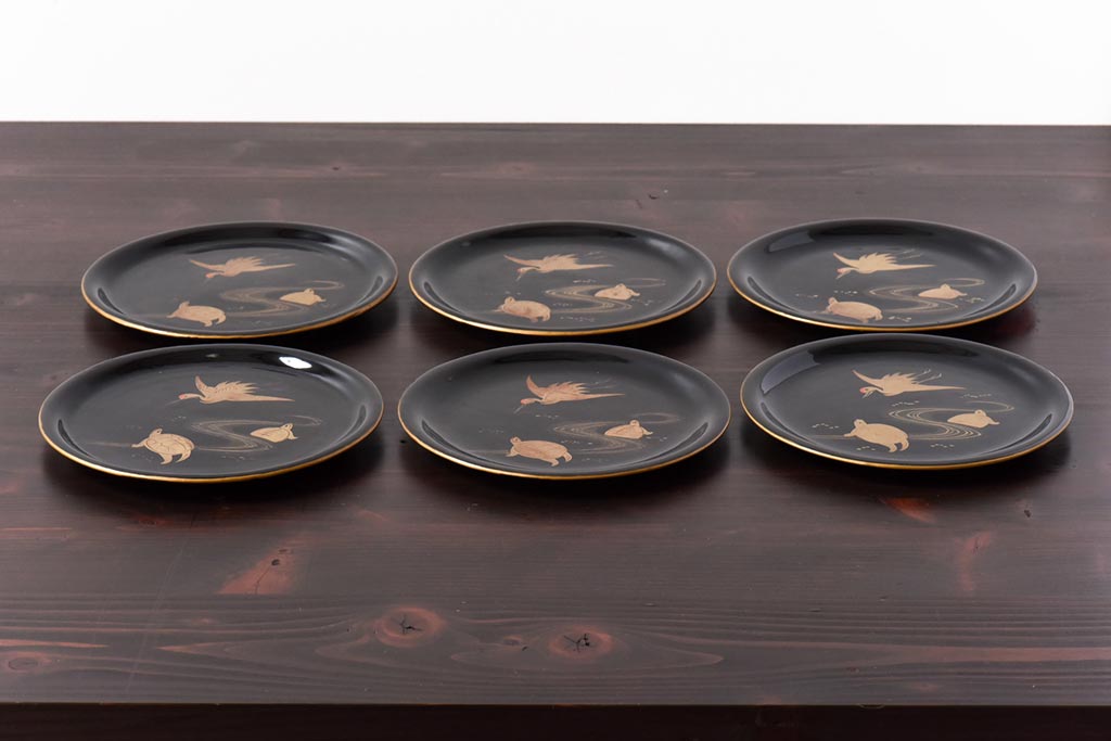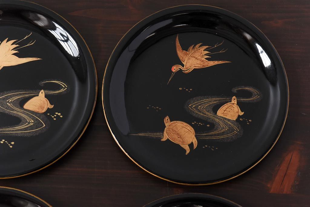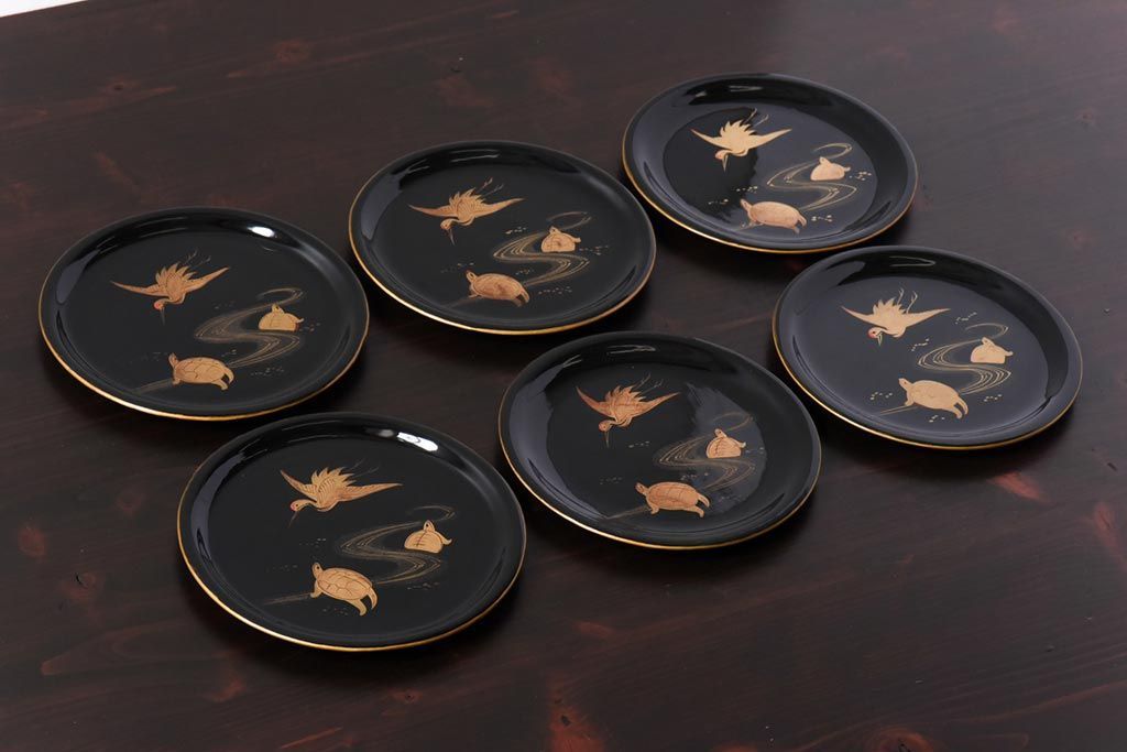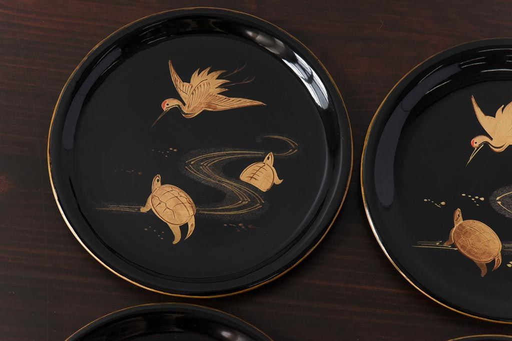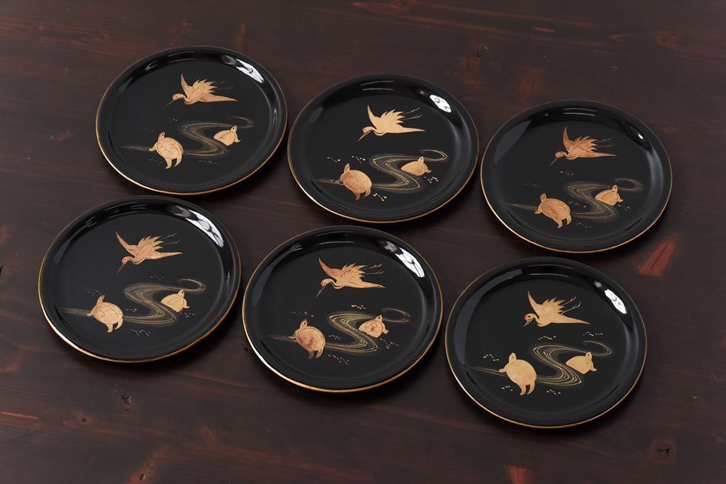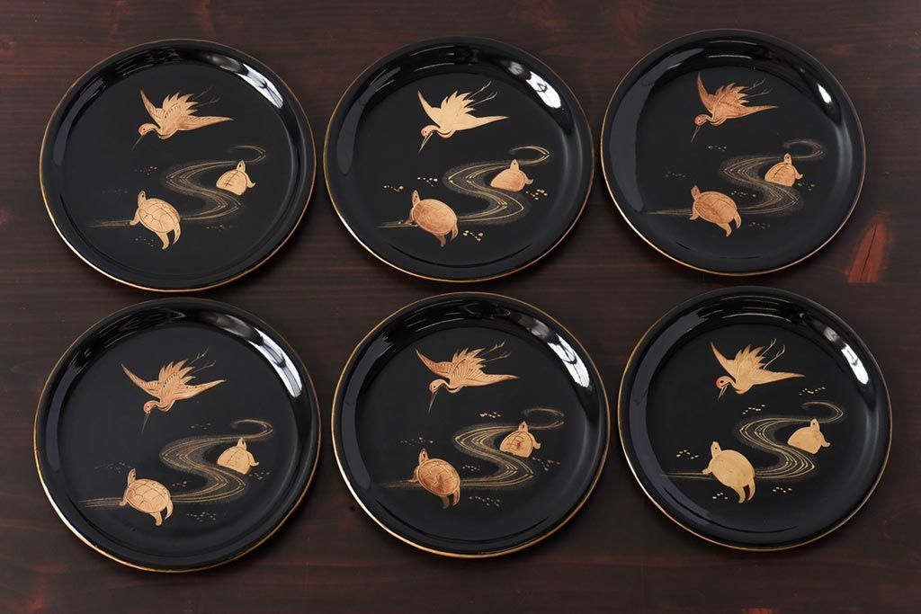 ラフジュ工房> 骨董・美術品> 骨董-漆器 > 和製アンティーク 鶴と亀の図 縁起の良い図柄が魅力的な木製皿(漆器、和食器)6枚セット(2)