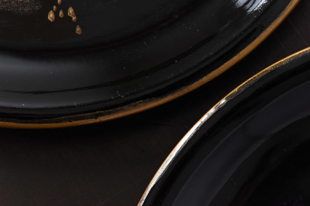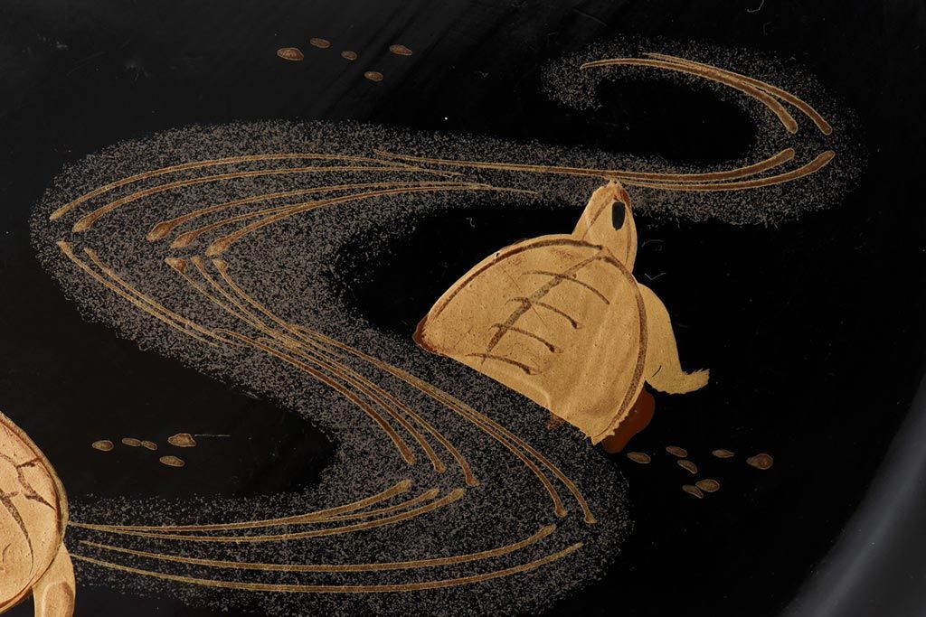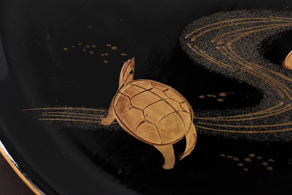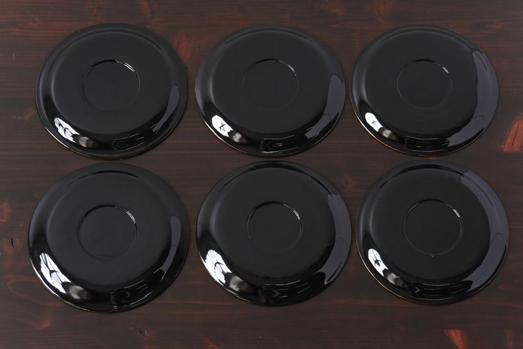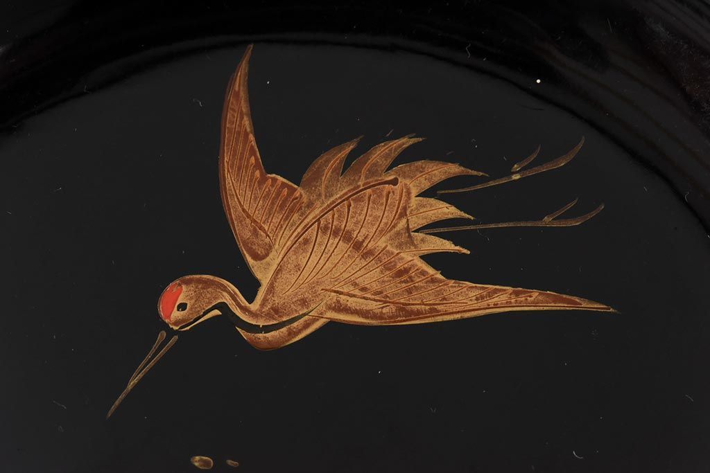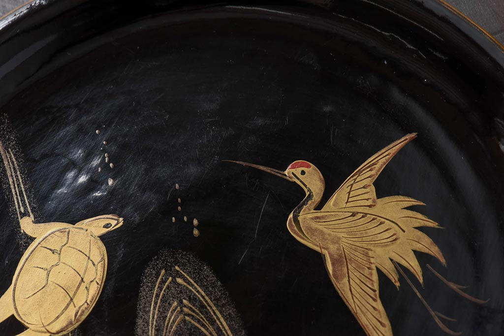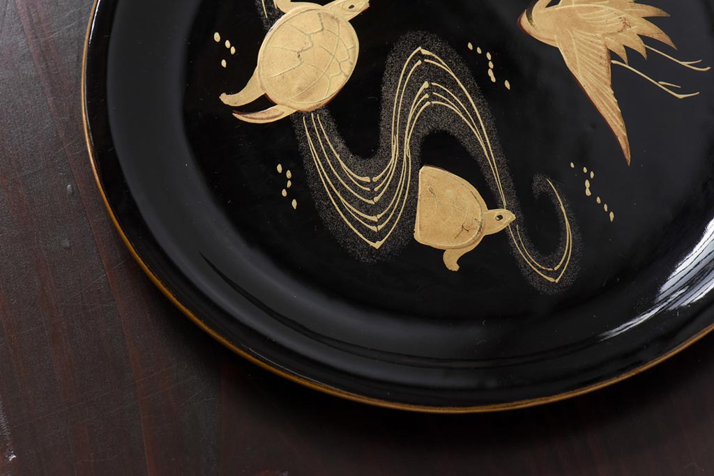 ラフジュ工房> 骨董・美術品> 骨董-漆器 > 和製アンティーク 鶴と亀の図 縁起の良い図柄が魅力的な木製皿(漆器、和食器)6枚セット(2)