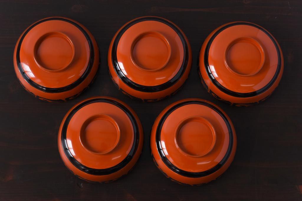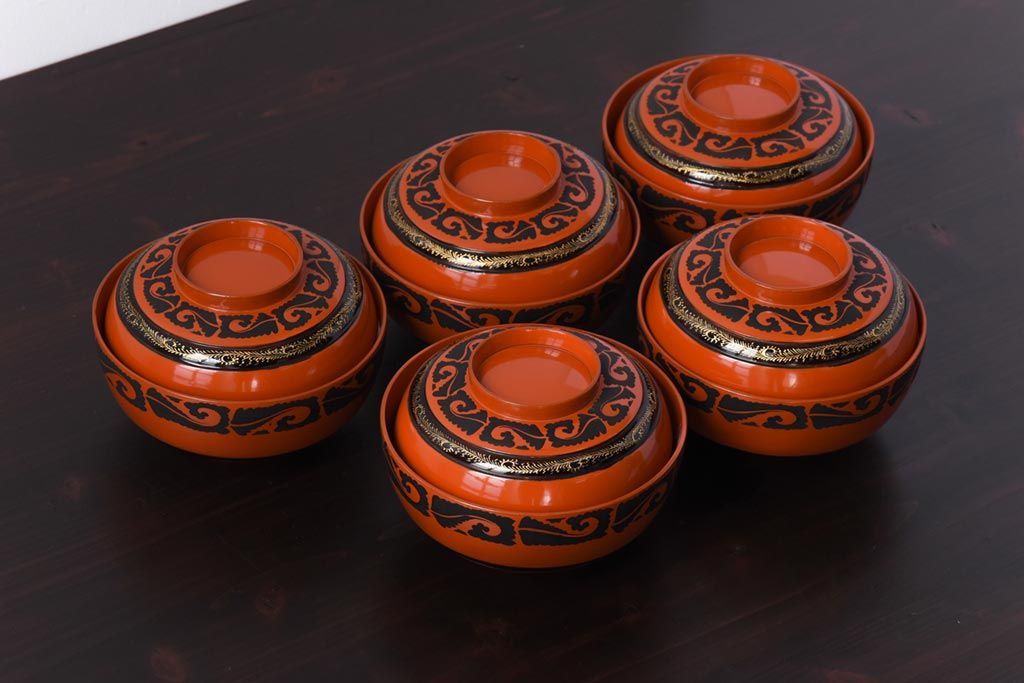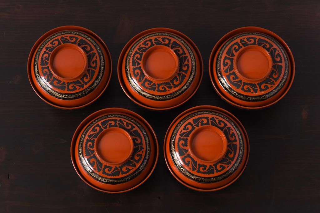 和製アンティーク 沈金蒔絵 波模様がユニークな蓋付き木製椀(漆器、和食器)5客セット(2)
