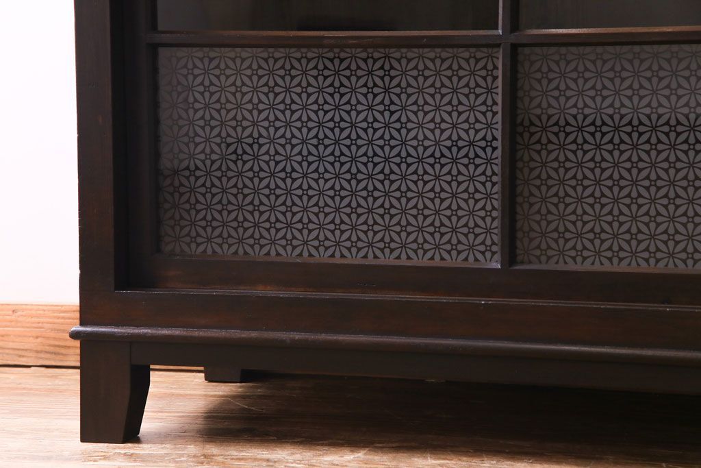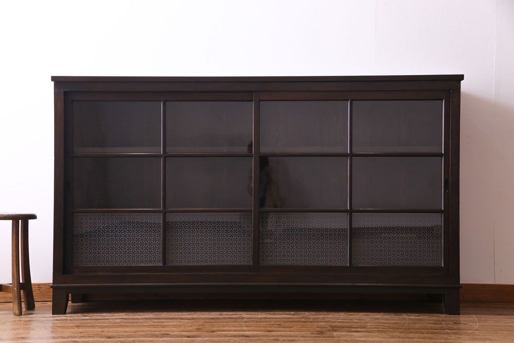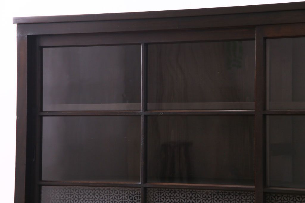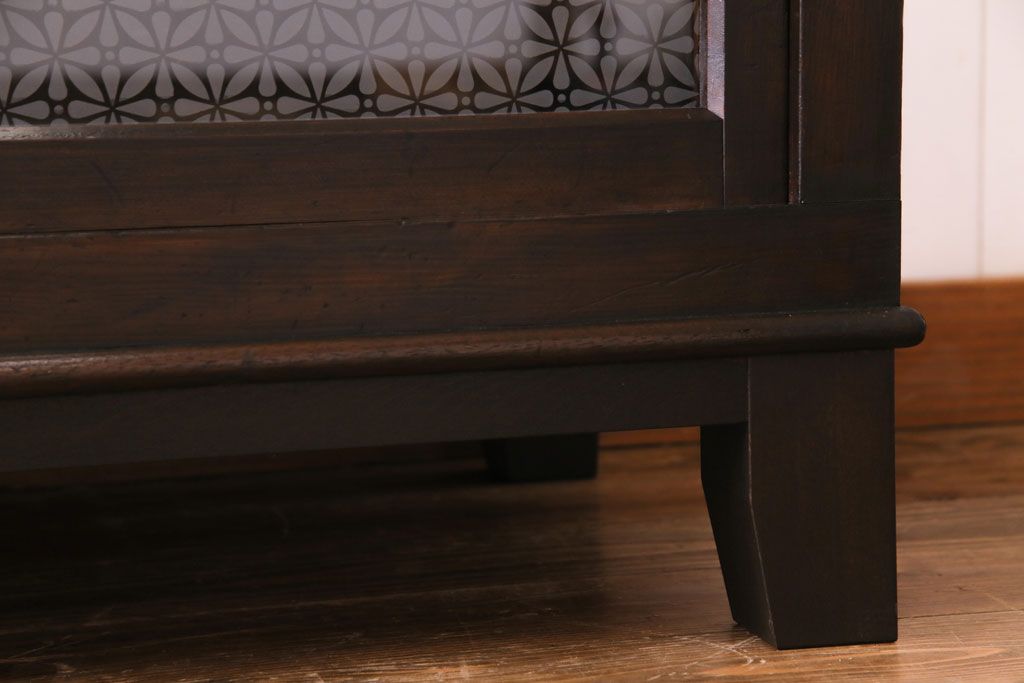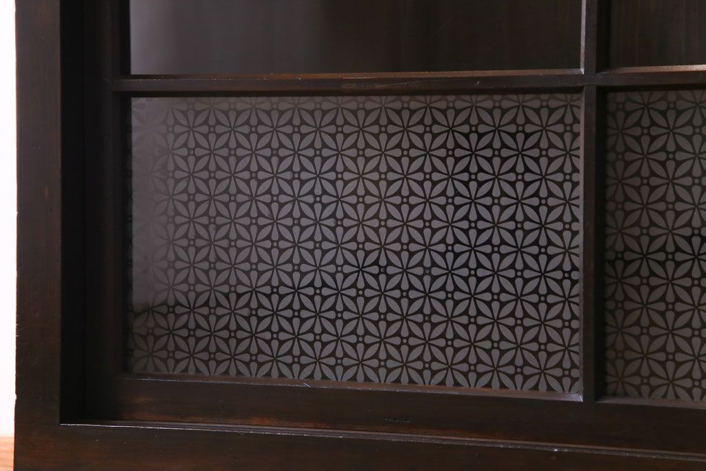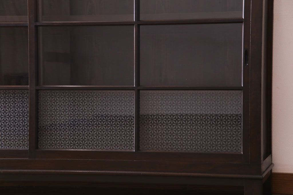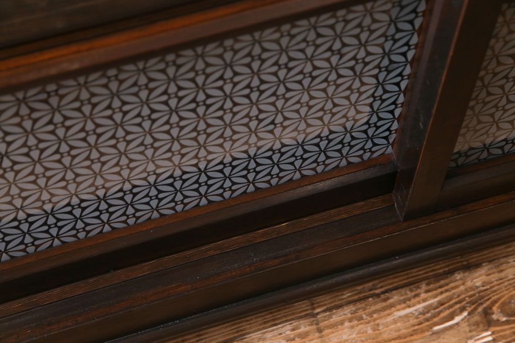 大正昭和初期 ラフジュ工房オリジナル 花菱模様ガラス入り レトロな雰囲気溢れるアンティークのガラス戸棚(食器棚、収納棚)(1)