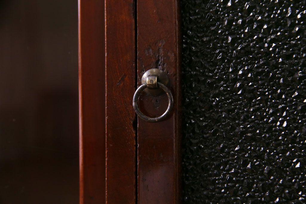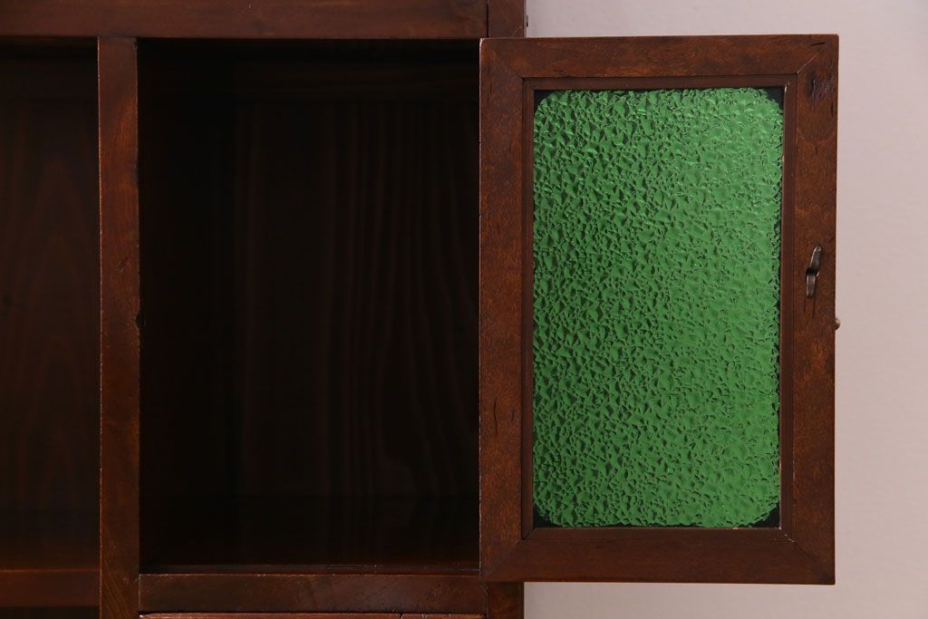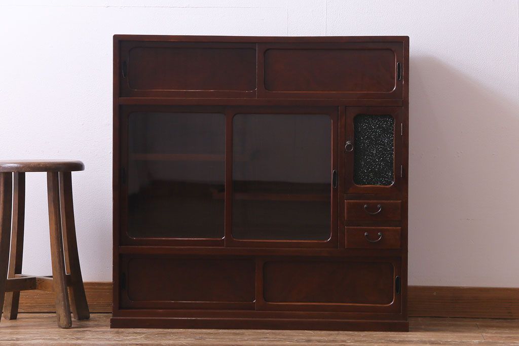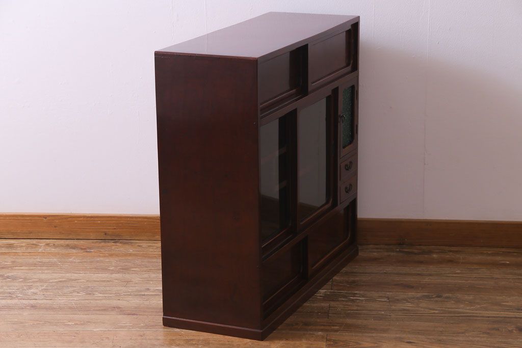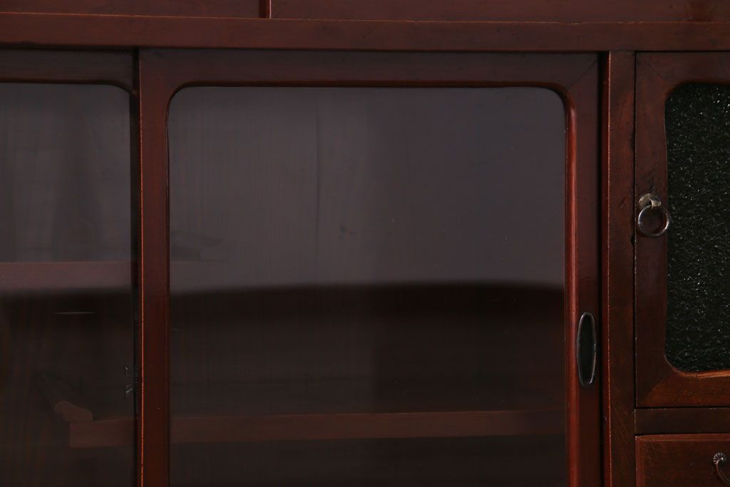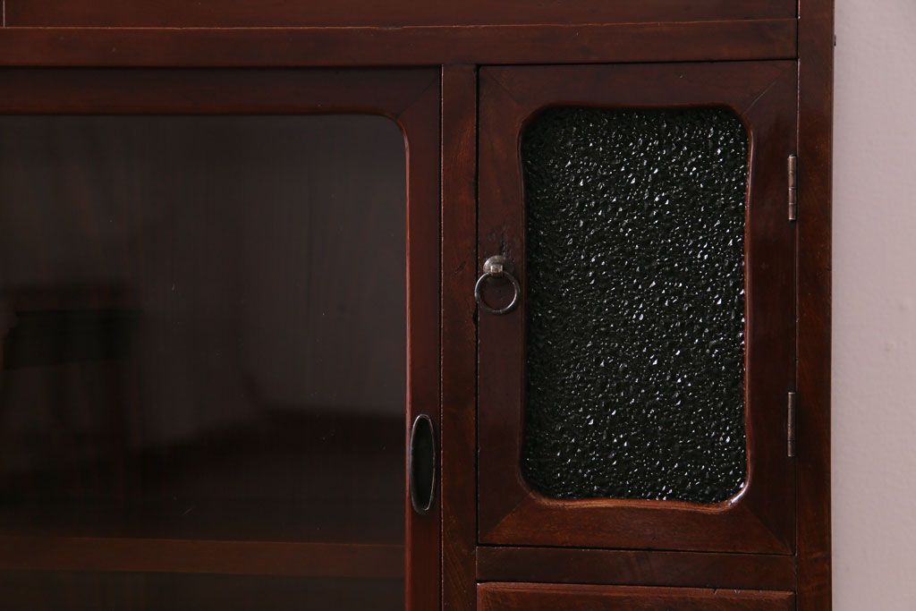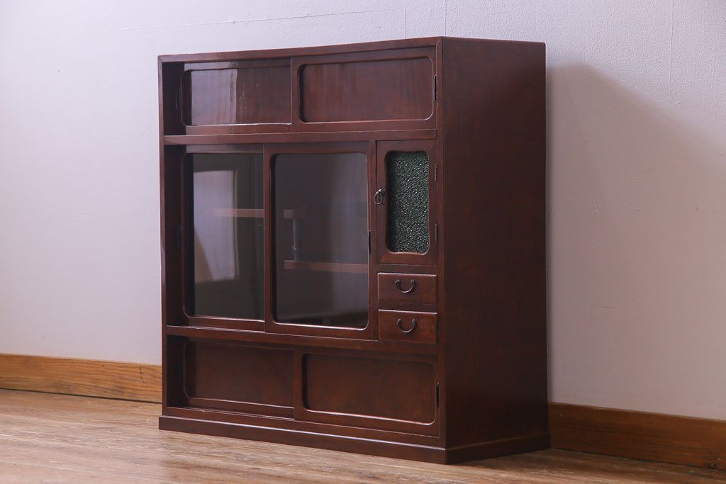 アンティーク家具 和製アンティーク 上手物 三方ケヤキ材 つややかな漆塗りと当時物色ガラスが魅力の戸棚(飾り棚、収納棚、茶棚)