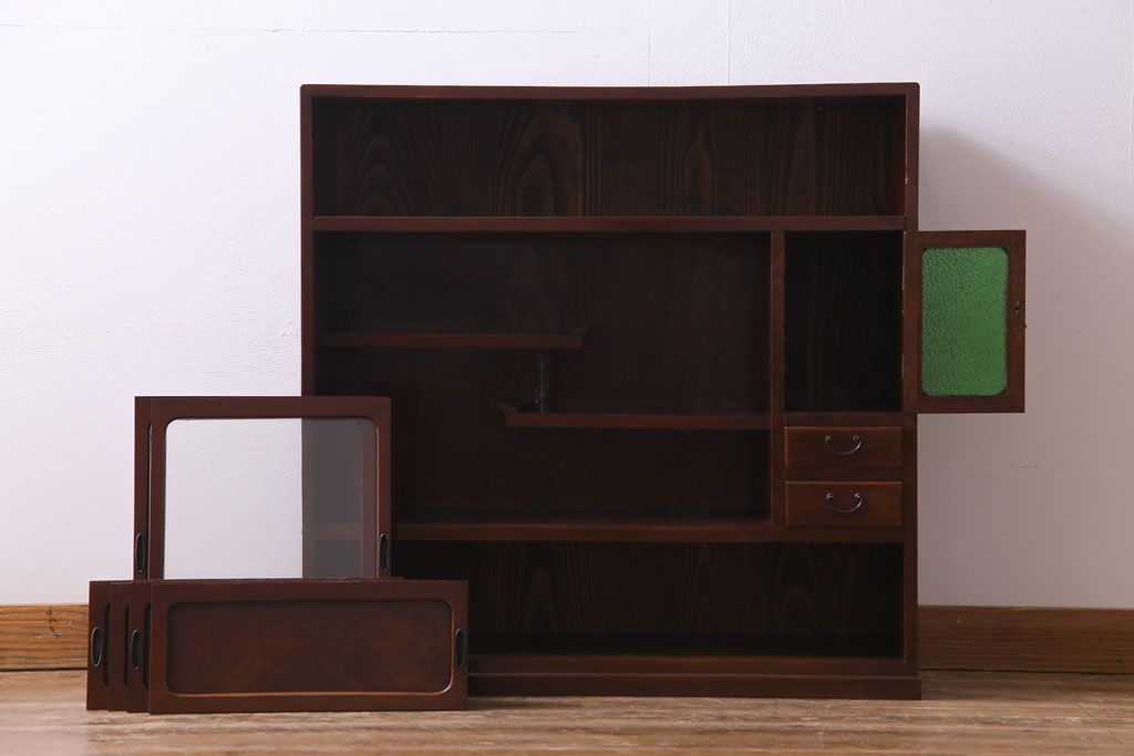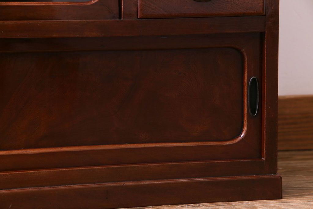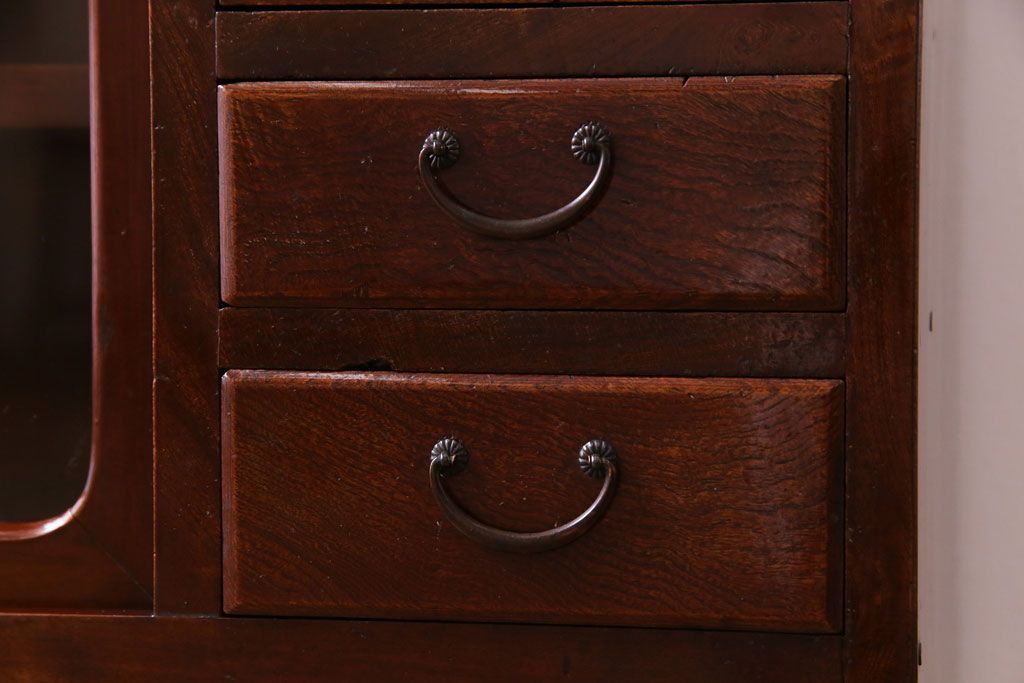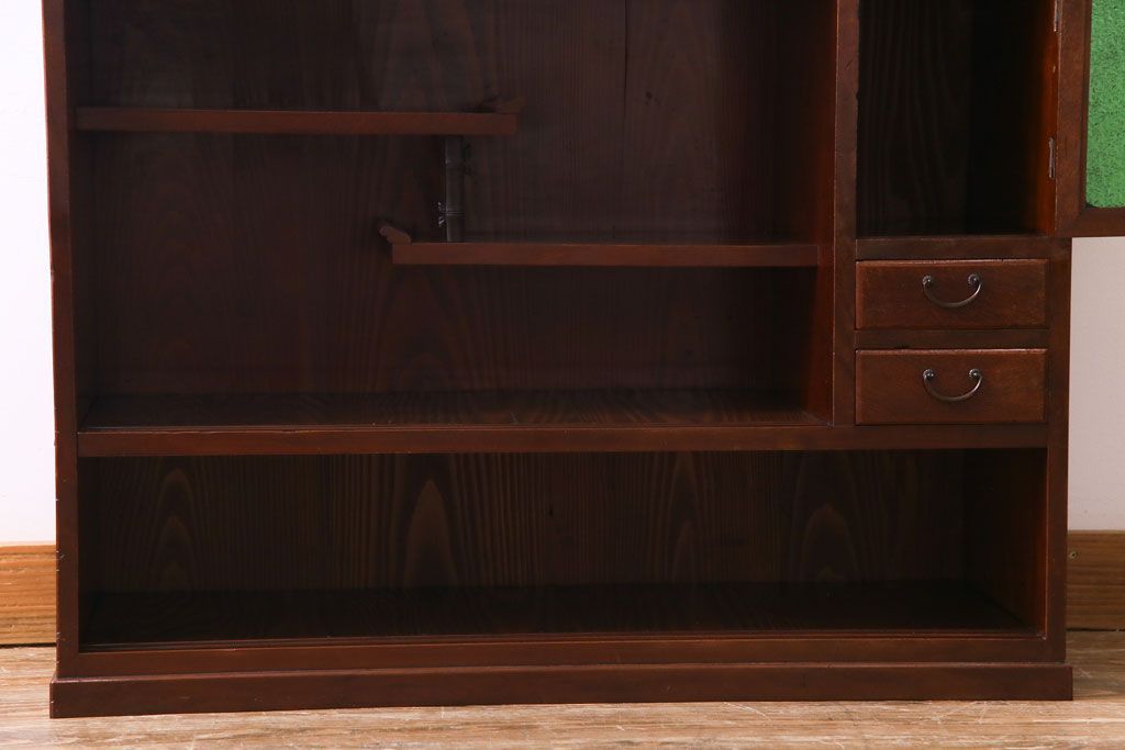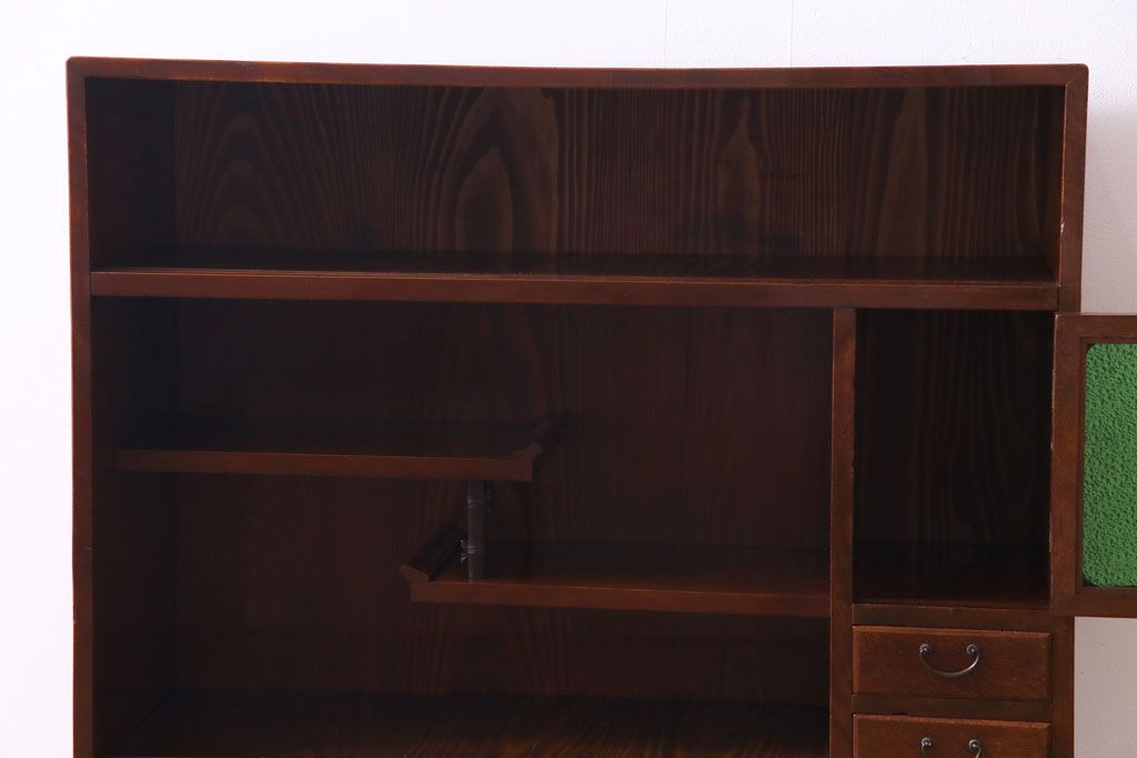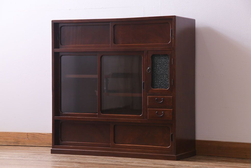 アンティーク家具 和製アンティーク 上手物 三方ケヤキ材 つややかな漆塗りと当時物色ガラスが魅力の戸棚(飾り棚、収納棚、茶棚)