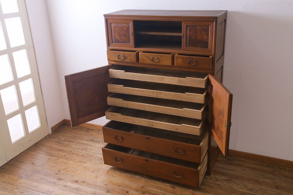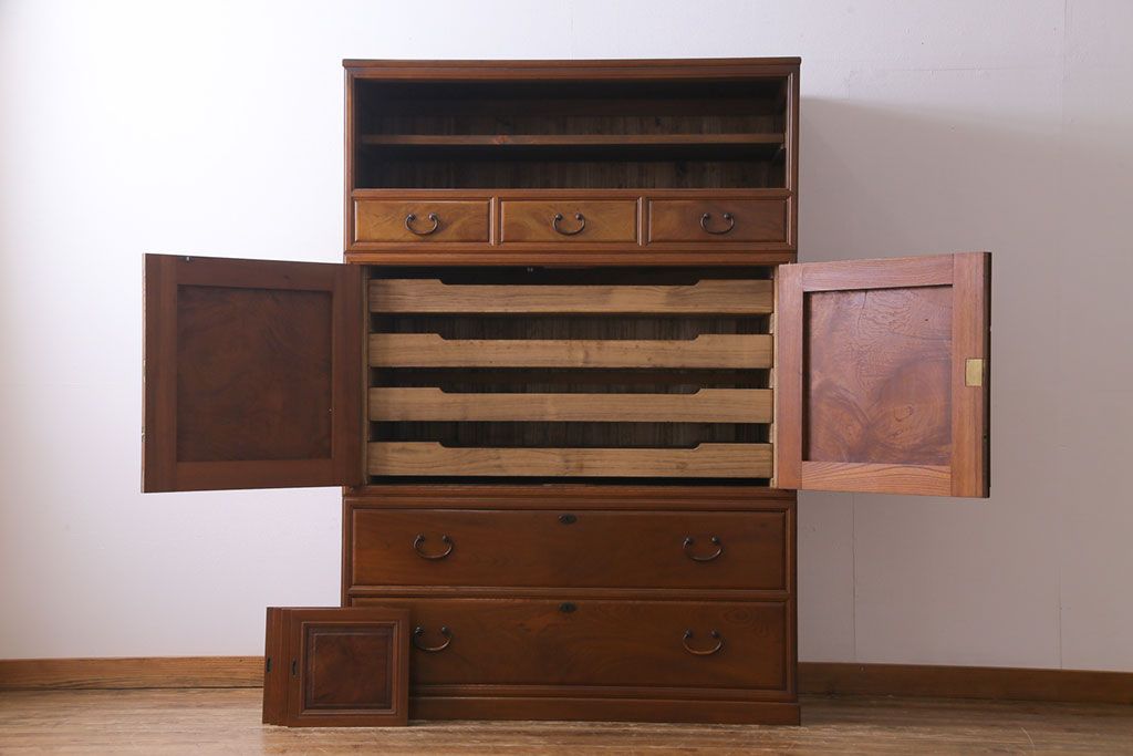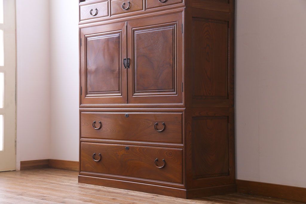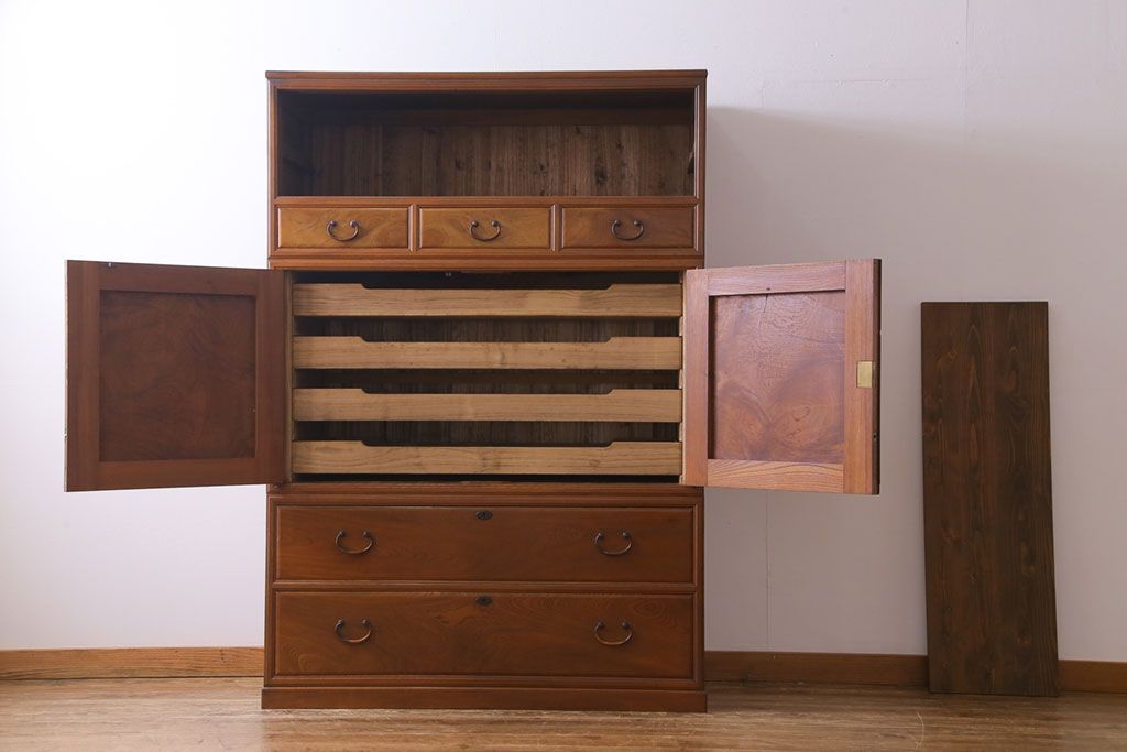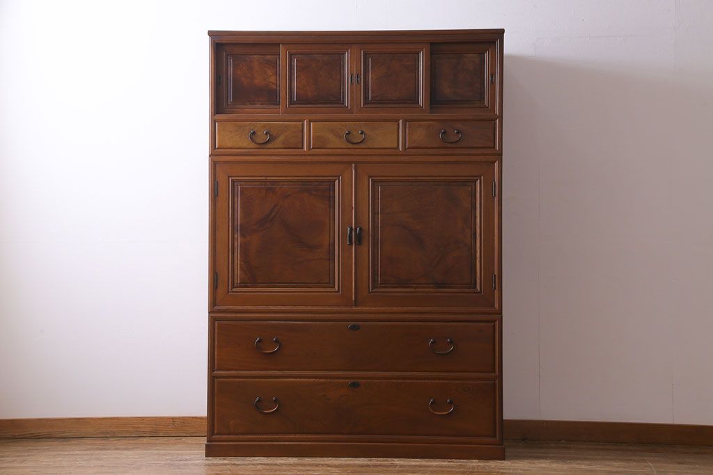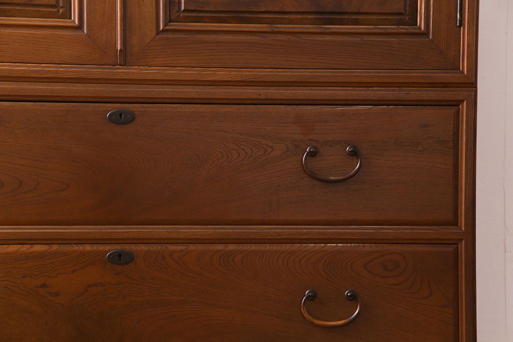 アンティーク家具 上手物 銅金具 三方ケヤキ無垢材 玉杢が美しい上手物の重ね箪笥(衣装箪笥、引き出し)