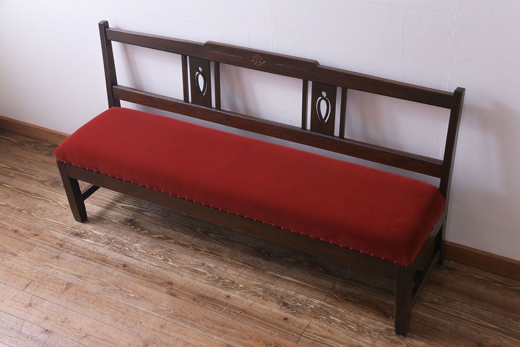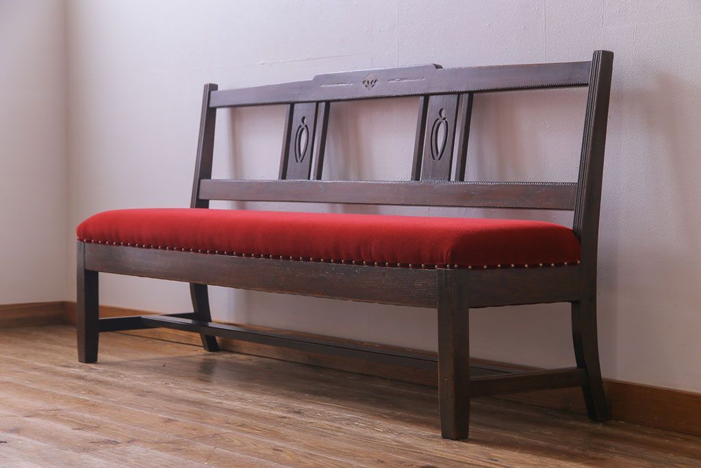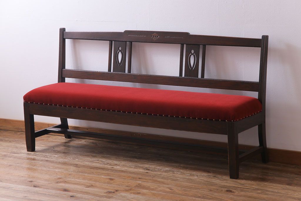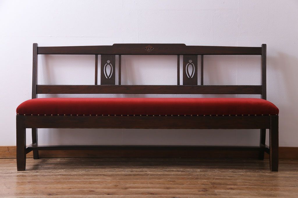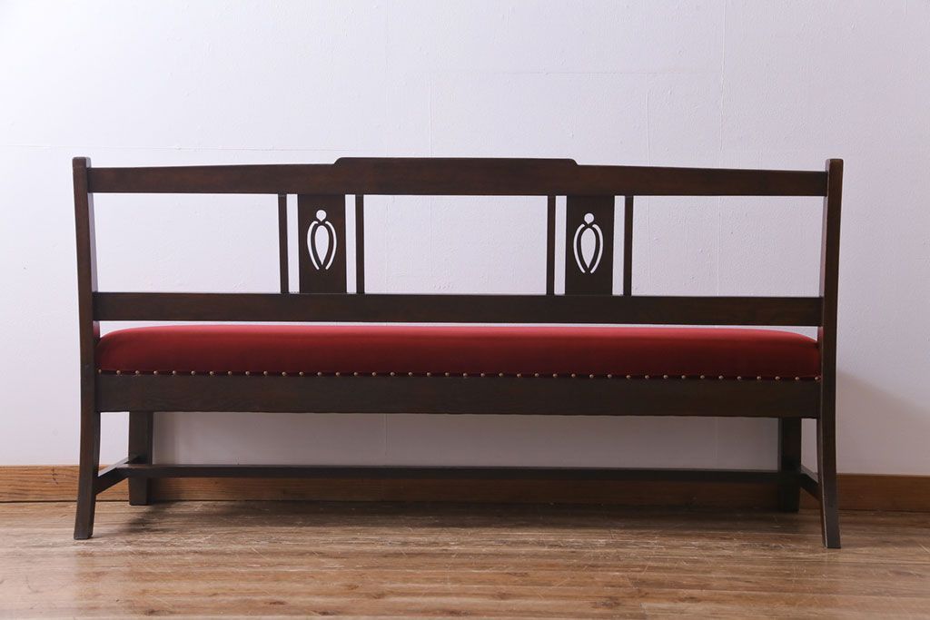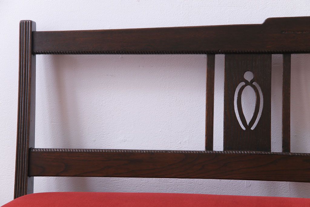 ラフジュ工房> 椅子・ベンチ> ベンチ > アンティーク家具 大正ロマン オーク材 象嵌入り 透かし彫りが上品な木製ソファベンチ(3人掛けソファ)