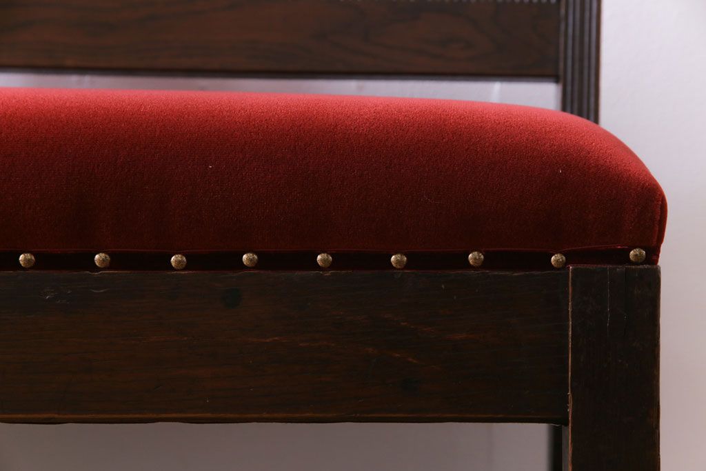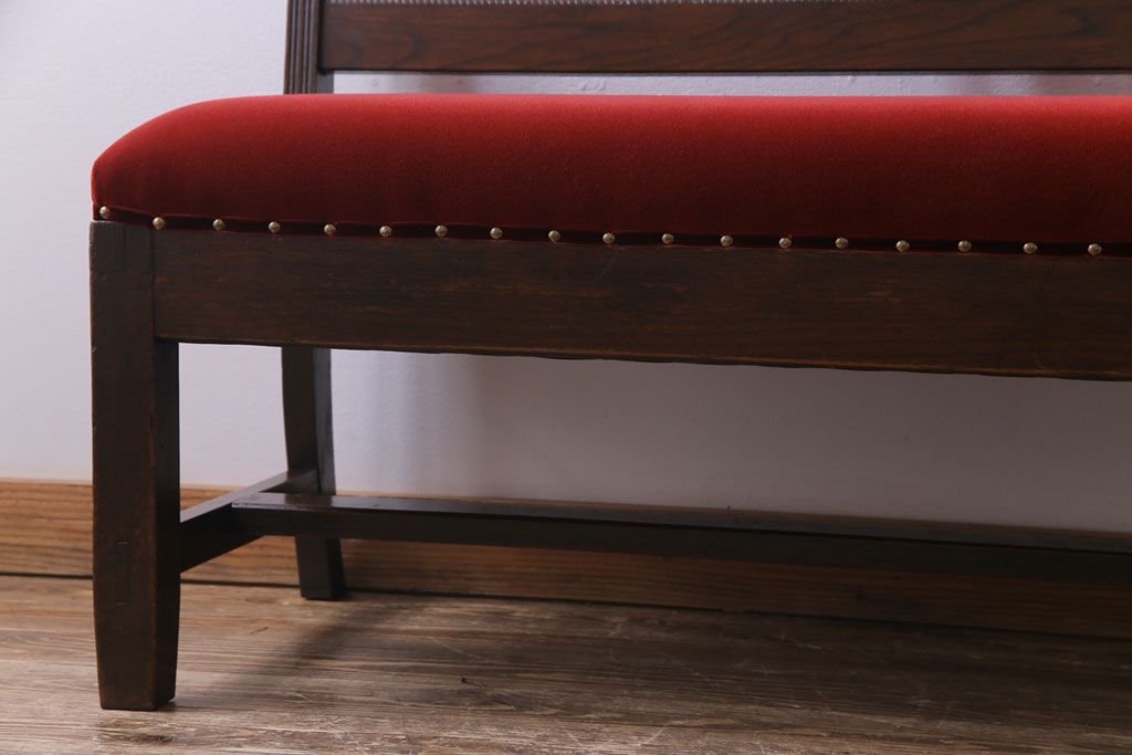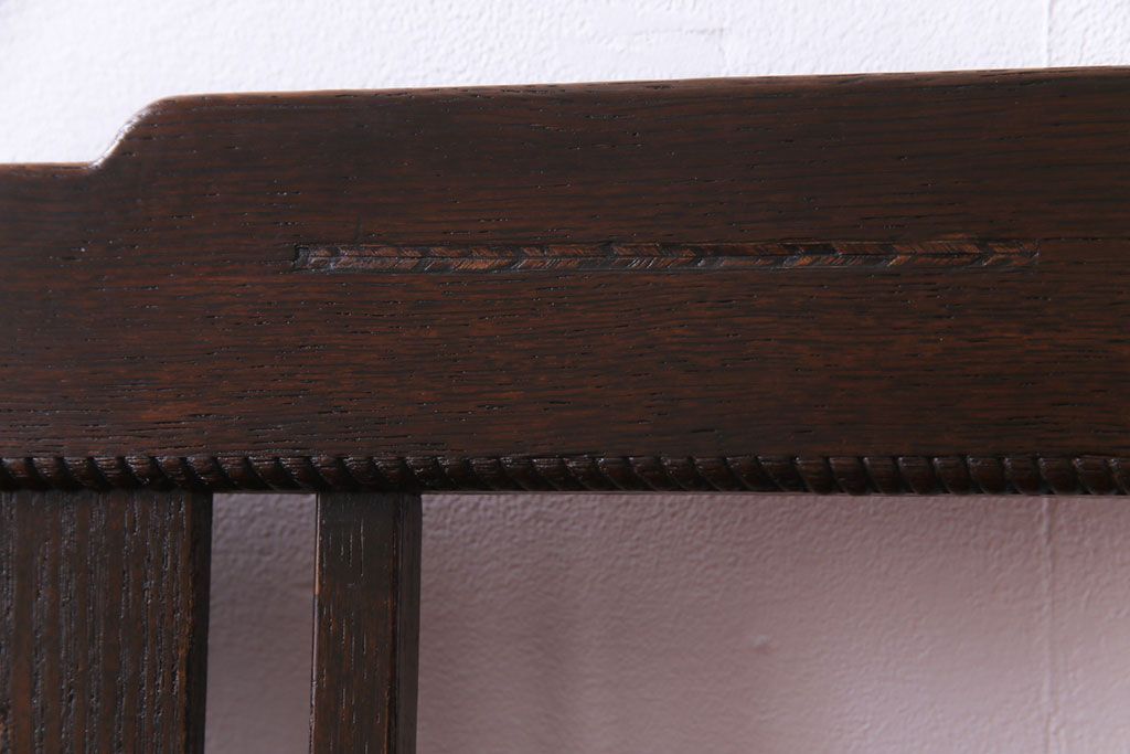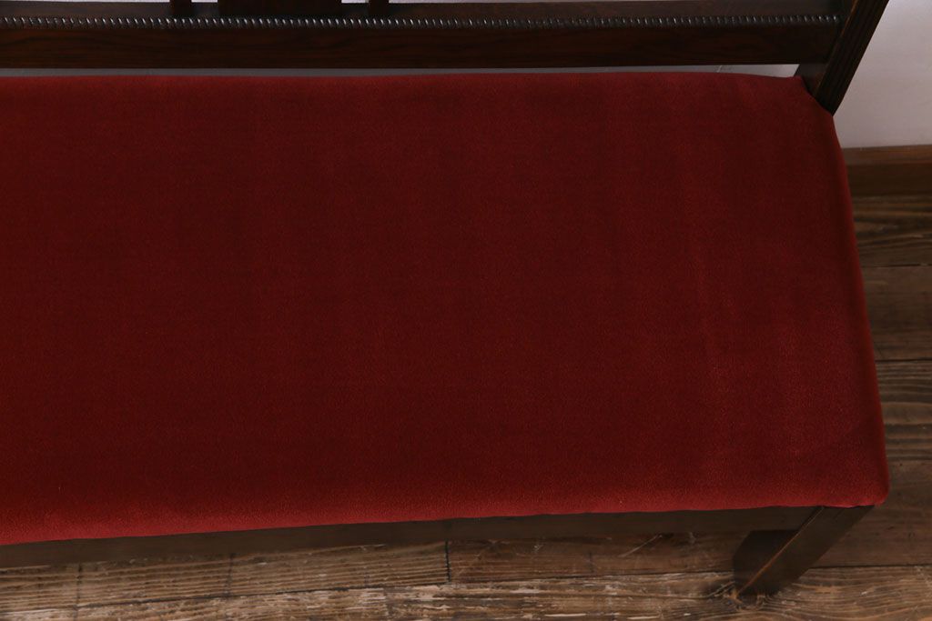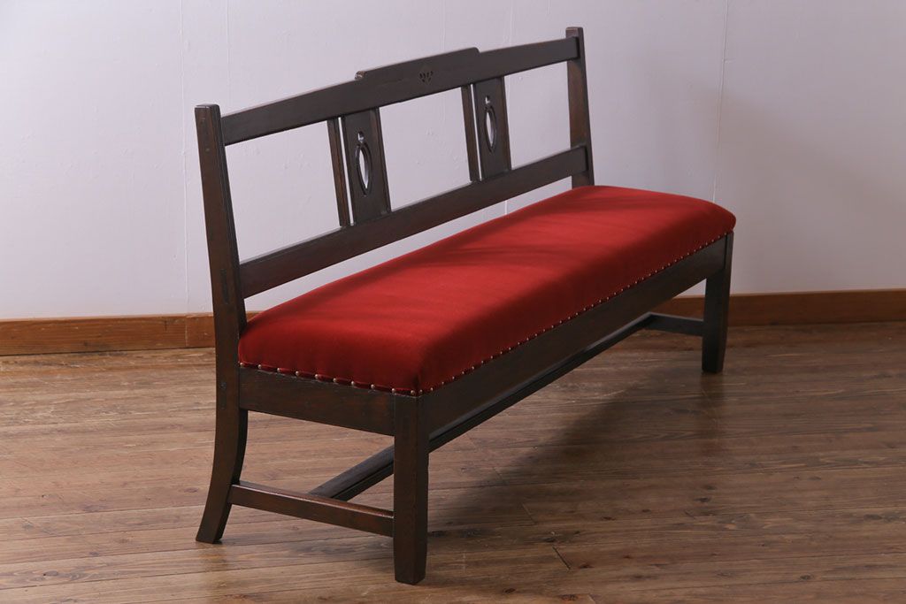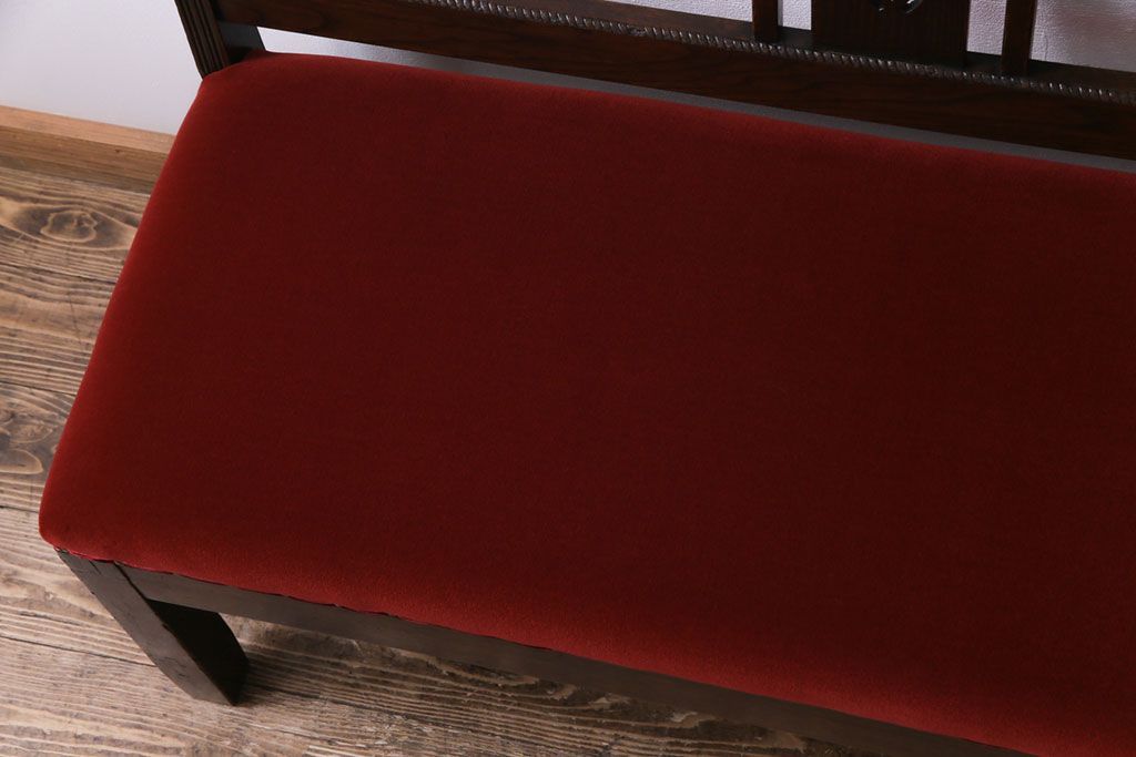 ラフジュ工房> 椅子・ベンチ> ベンチ > アンティーク家具 大正ロマン オーク材 象嵌入り 透かし彫りが上品な木製ソファベンチ(3人掛けソファ)