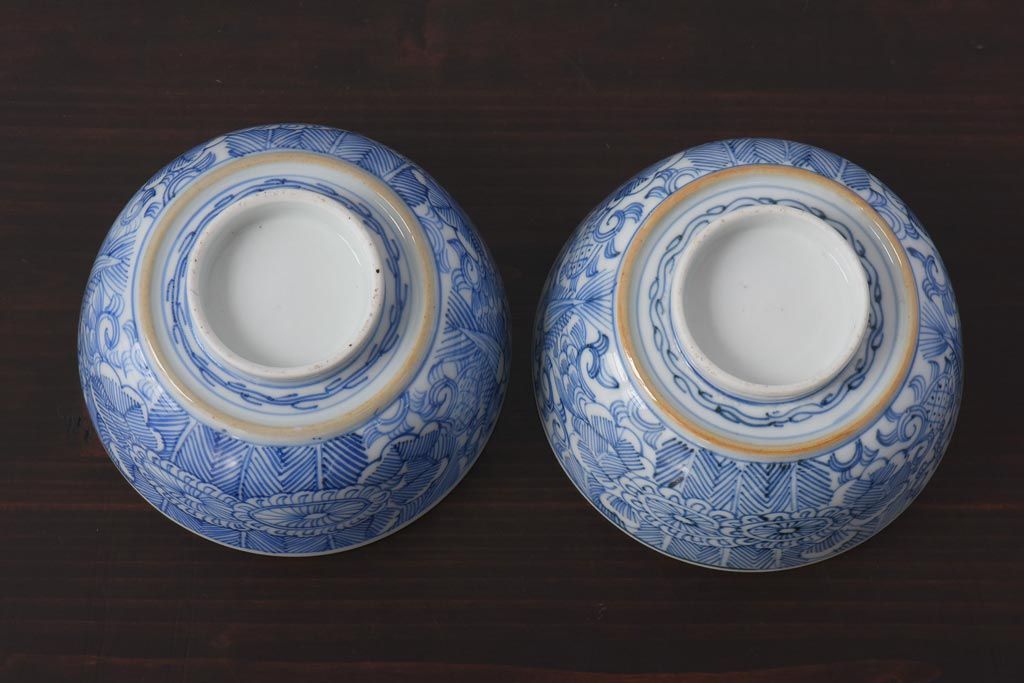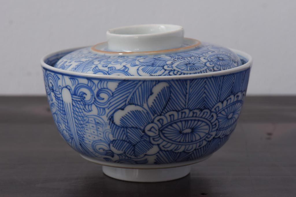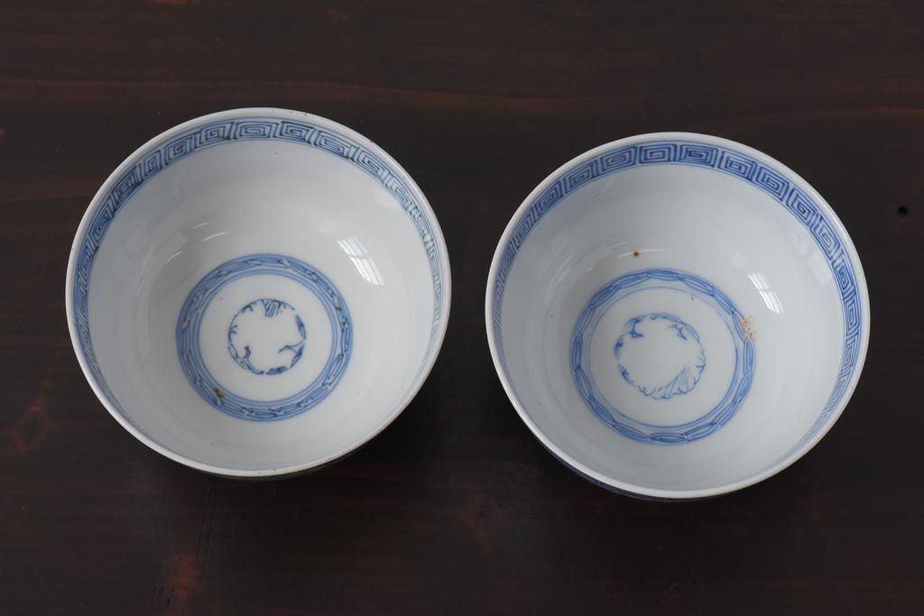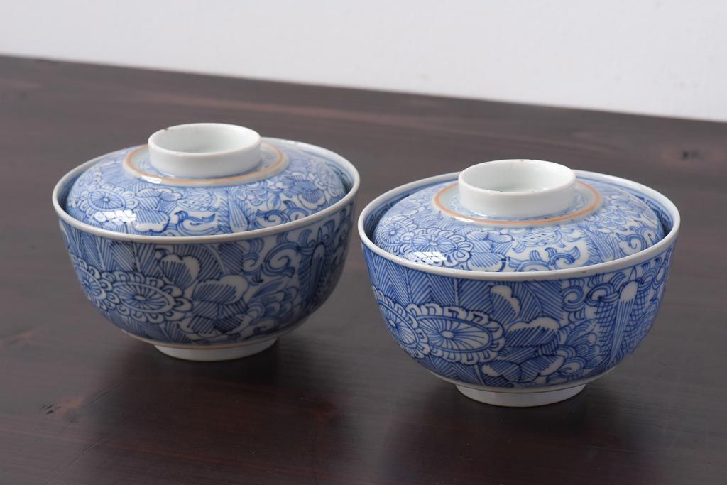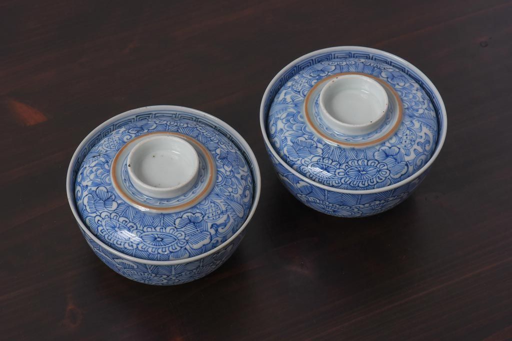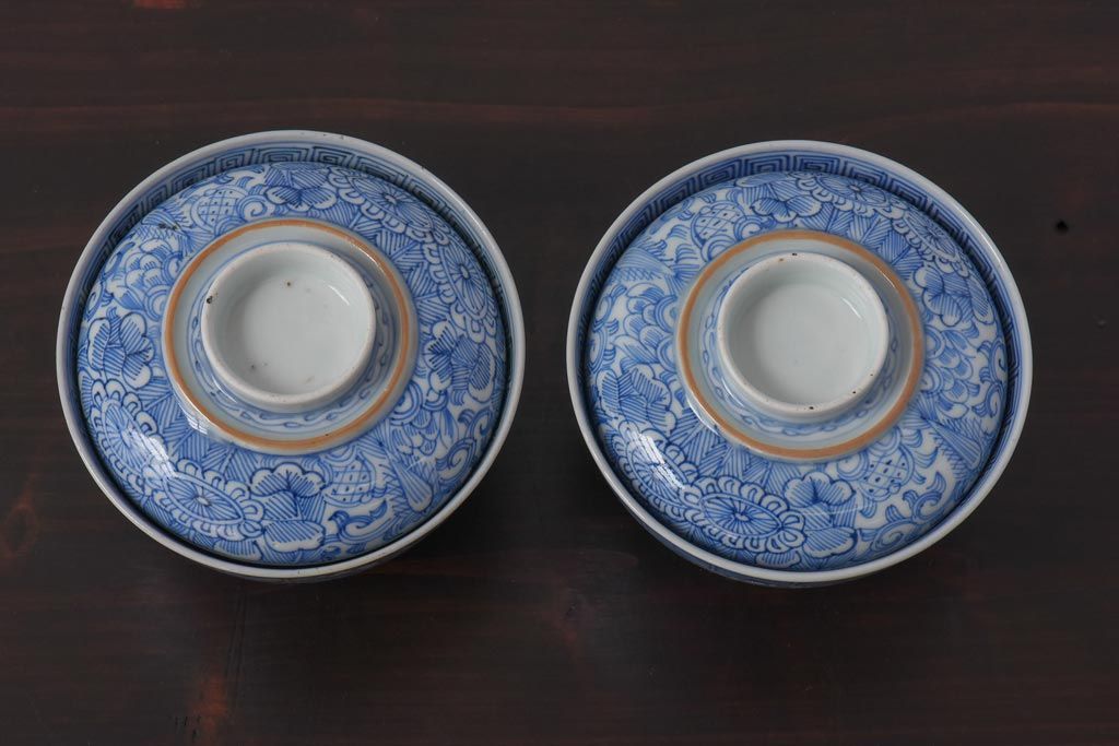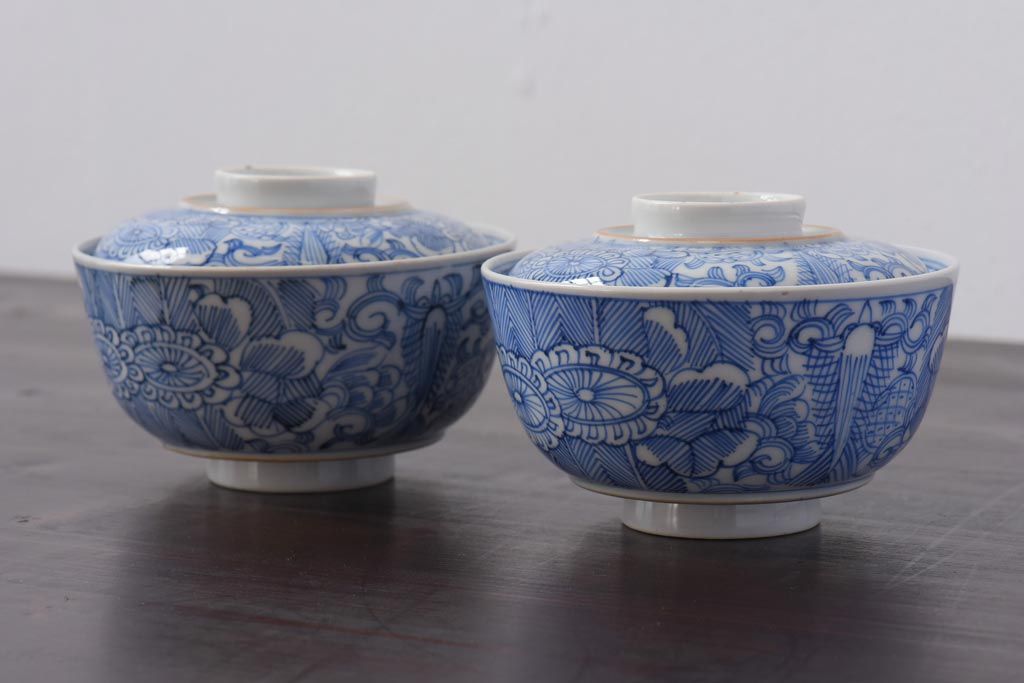 ラフジュ工房> 和食器・茶道具 > 古民具・骨董 幕末明治期 線描染付 細かな図柄が味わい深い蓋付茶碗(和食器)2客セット(2)