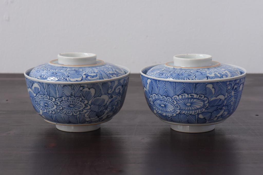 ラフジュ工房> 和食器・茶道具> お椀・茶碗 > 古民具・骨董 幕末明治期 線描染付 細かな図柄が味わい深い蓋付茶碗(和食器)2客セット(2)