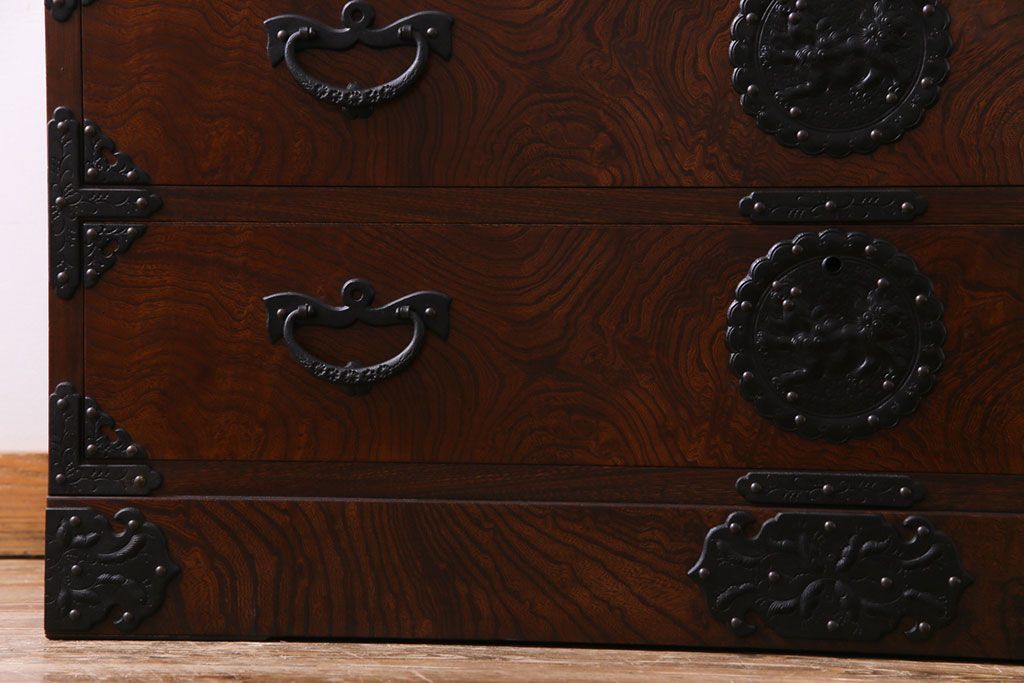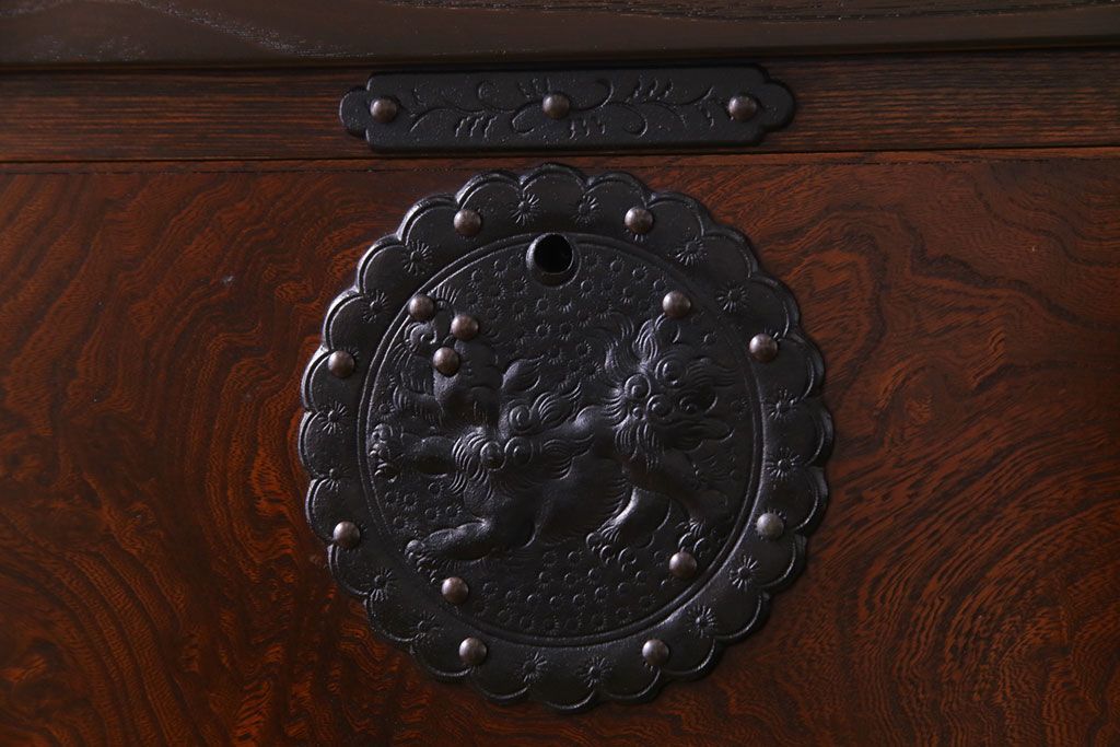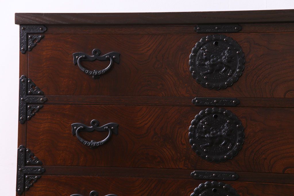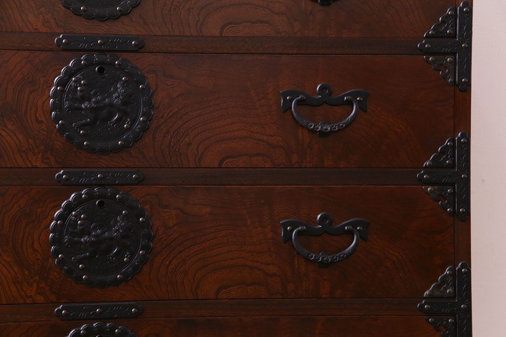中古 岩谷堂箪笥 天板リメイク 唐獅子の金具が魅力の衣装箪笥(チェスト、整理ダンス)