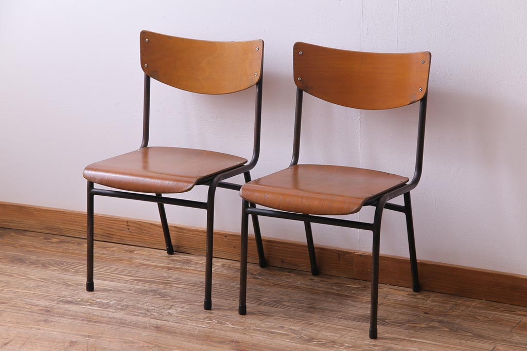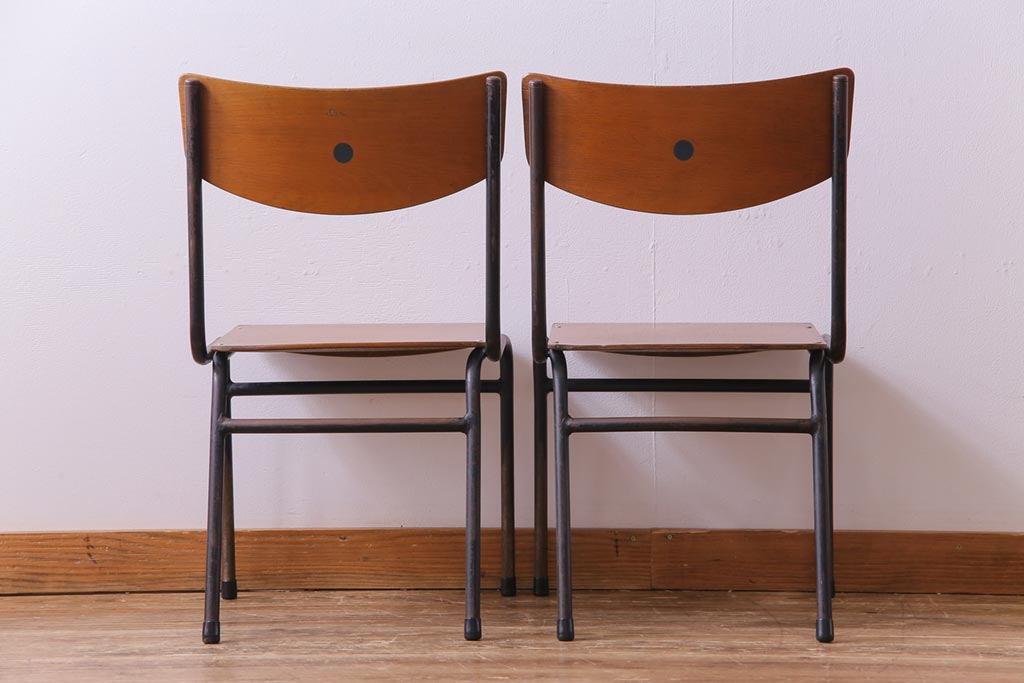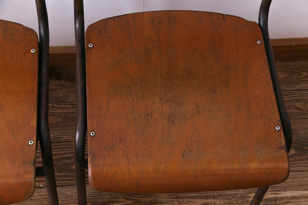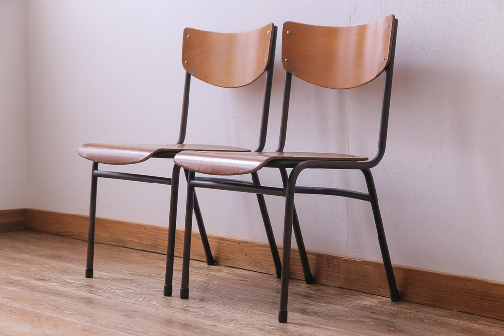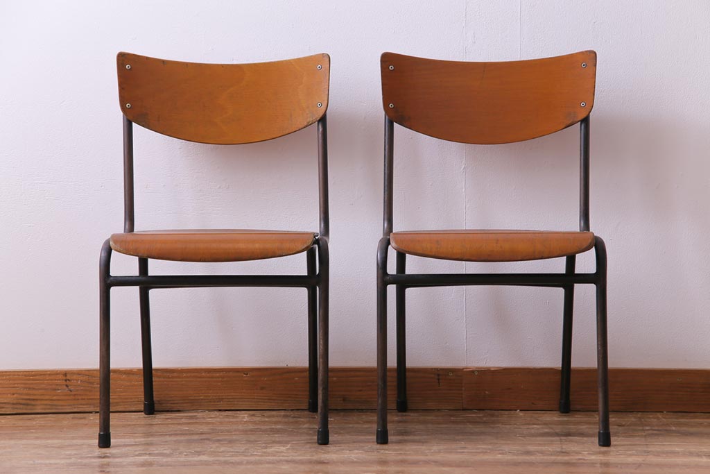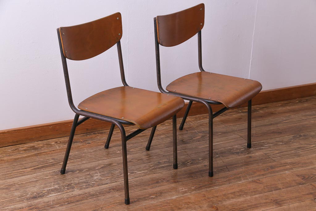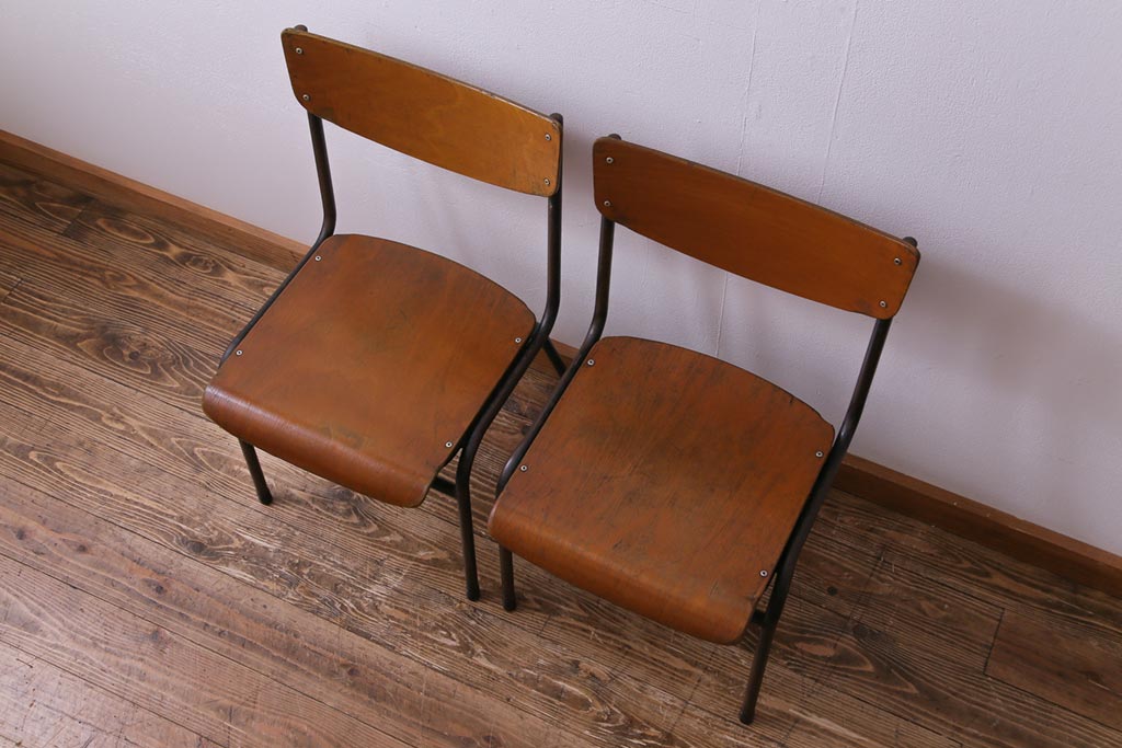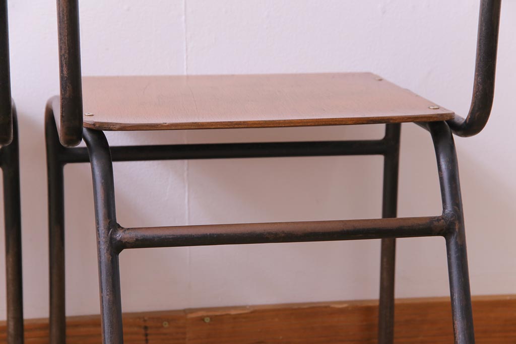 ヴィンテージ家具 ヨーロッパビンテージ レトロな佇まいのスクールチェア(キッズチェア、鉄脚チェア、椅子)2脚セット(1)