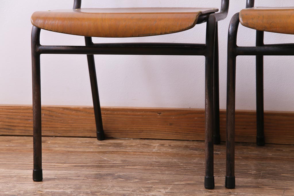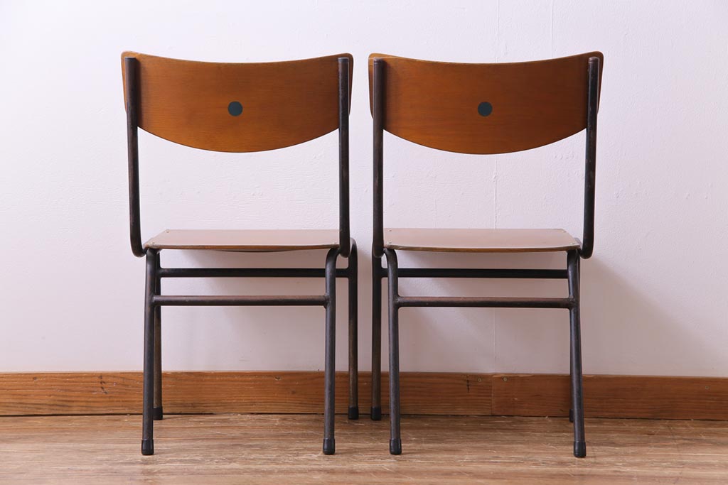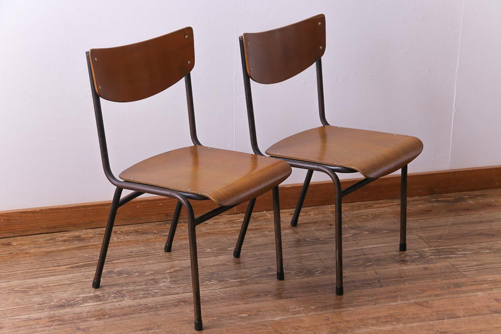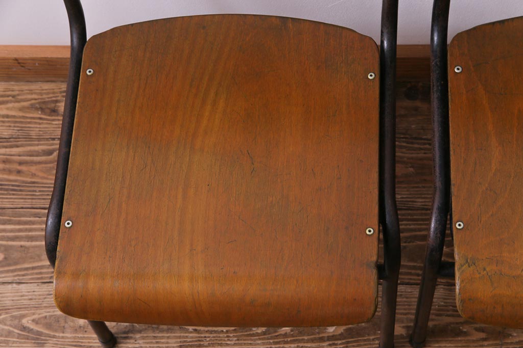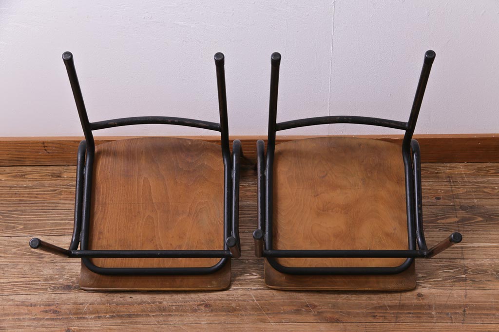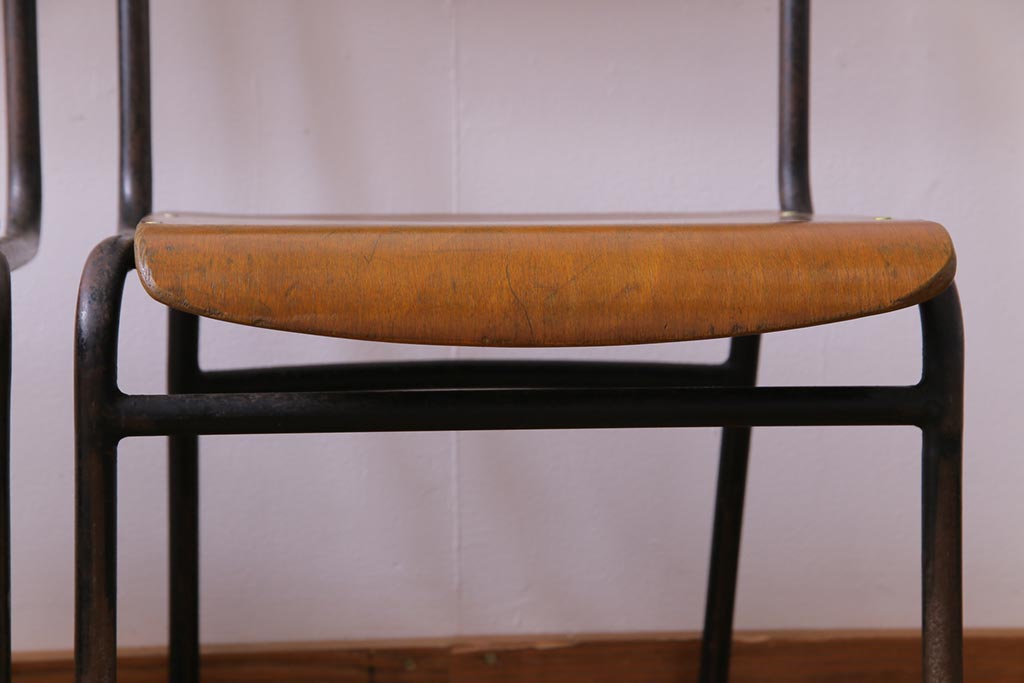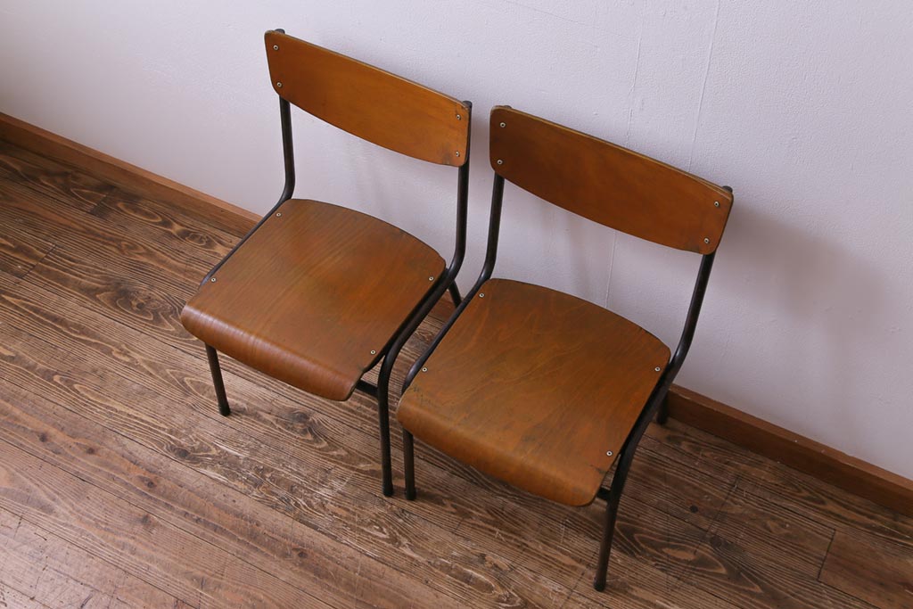 ヴィンテージ家具 ヨーロッパビンテージ レトロな佇まいのスクールチェア(キッズチェア、鉄脚チェア、椅子)2脚セット(2)