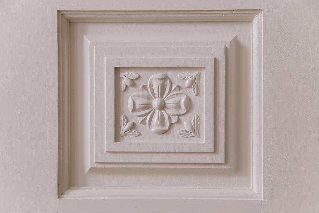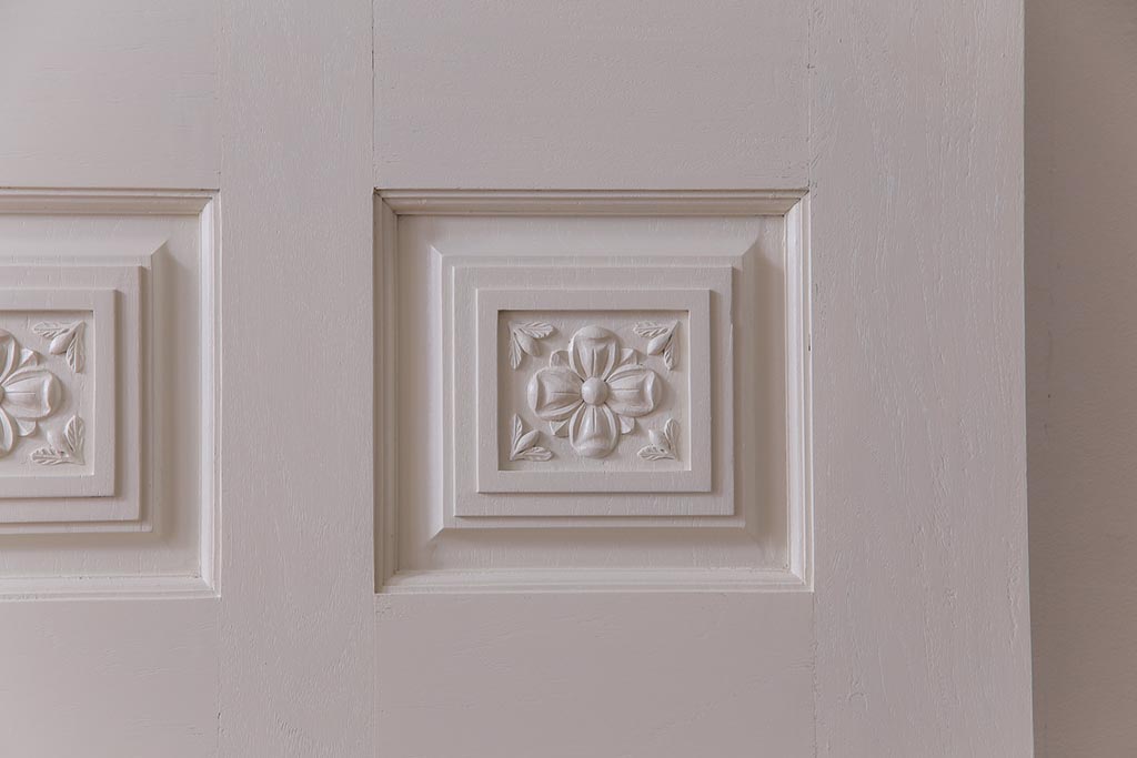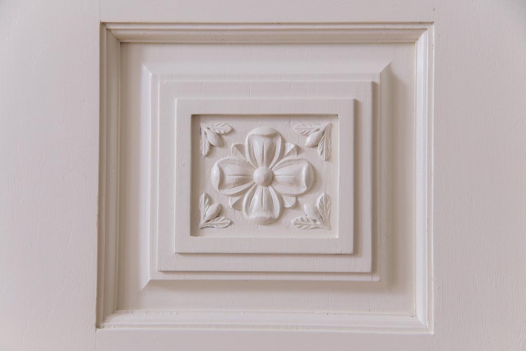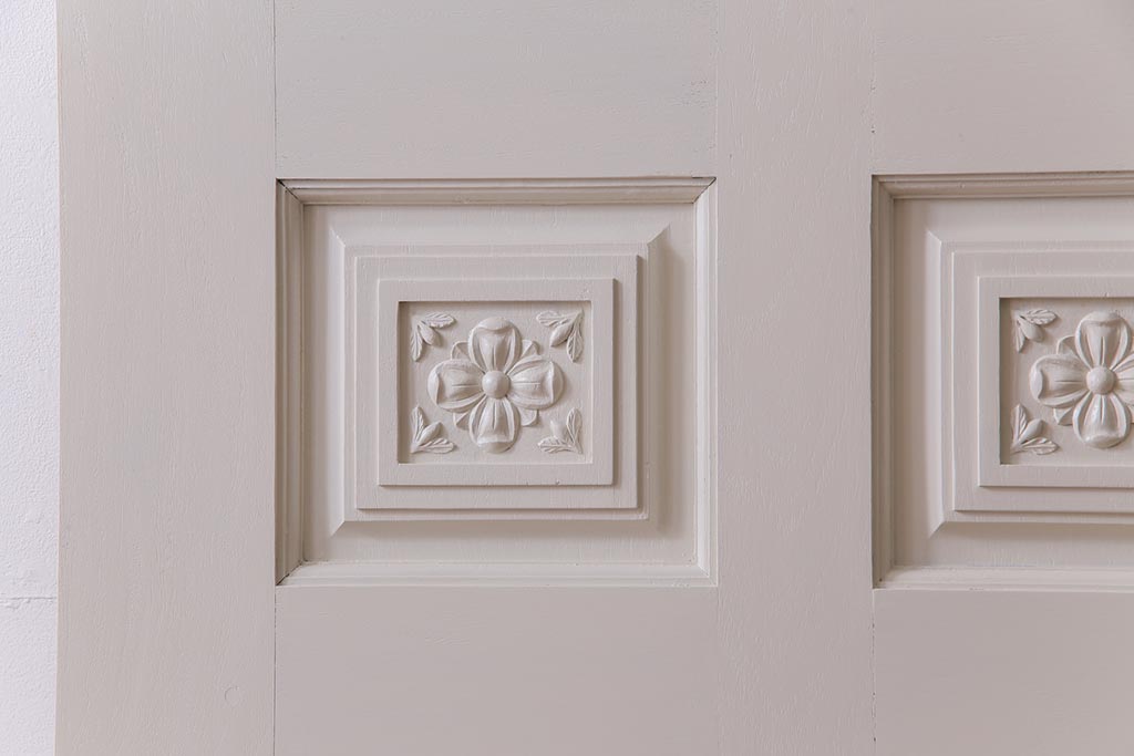 ペイント建具 花梨無垢材 可愛らしいレリーフが魅力のアンティークドア(扉)です。
