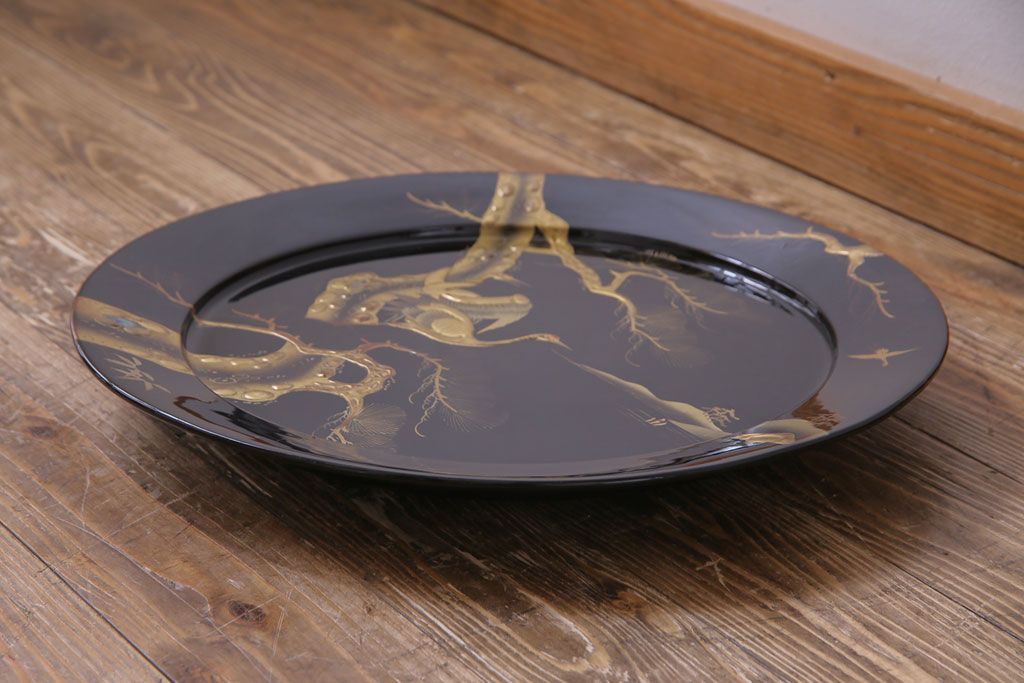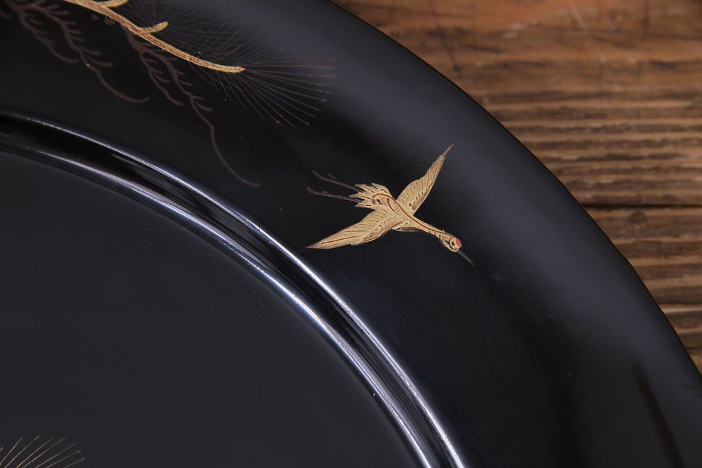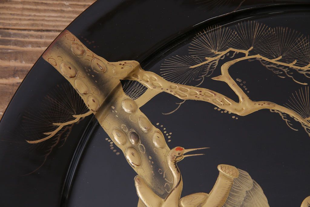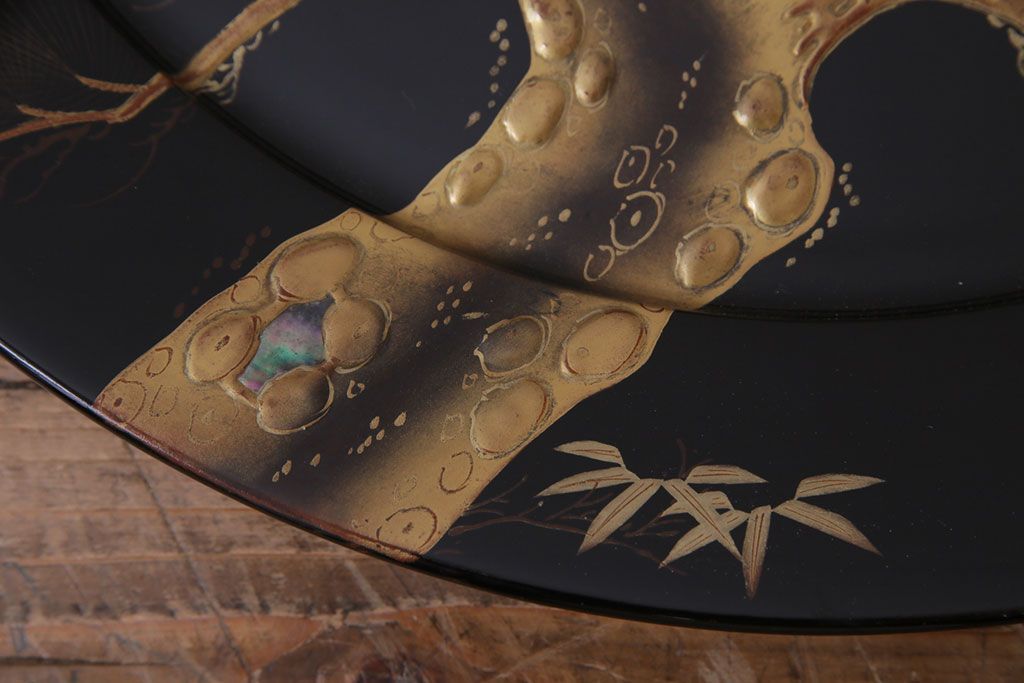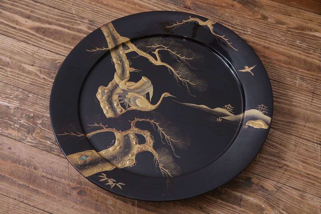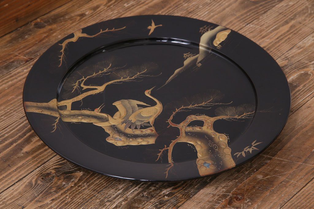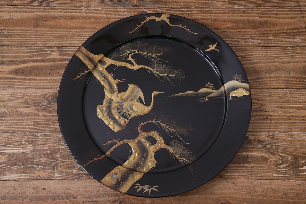 アンティーク雑貨 和製アンティーク 螺鈿入り 鶴・松の図 金彩高蒔絵木製大皿(漆器、和食器)