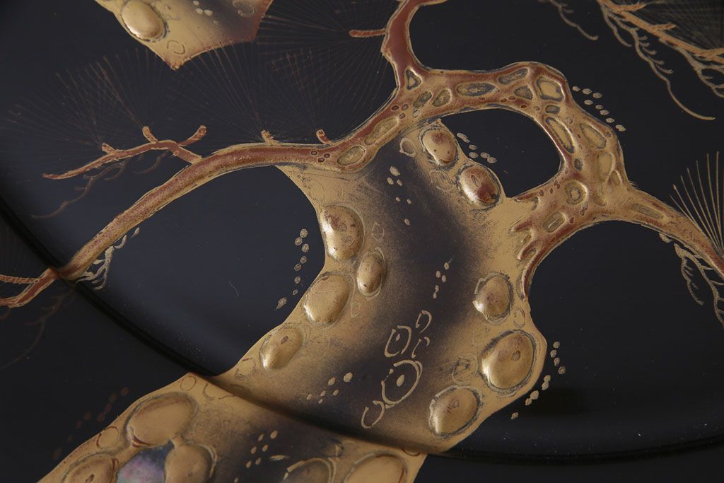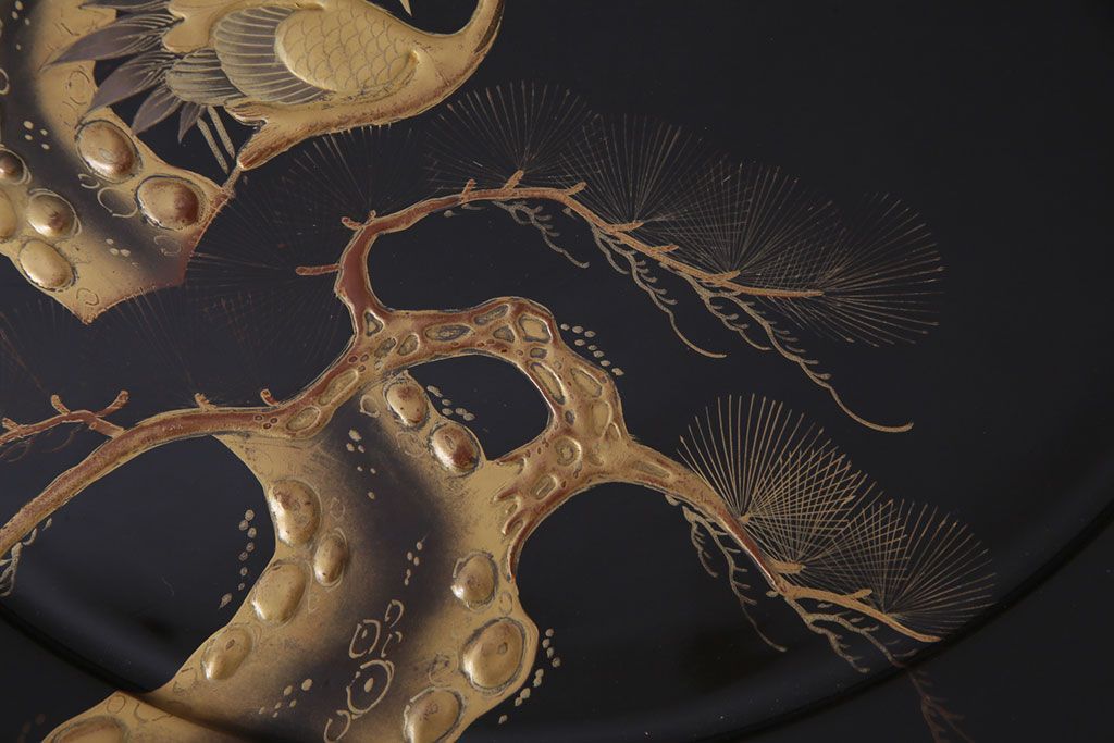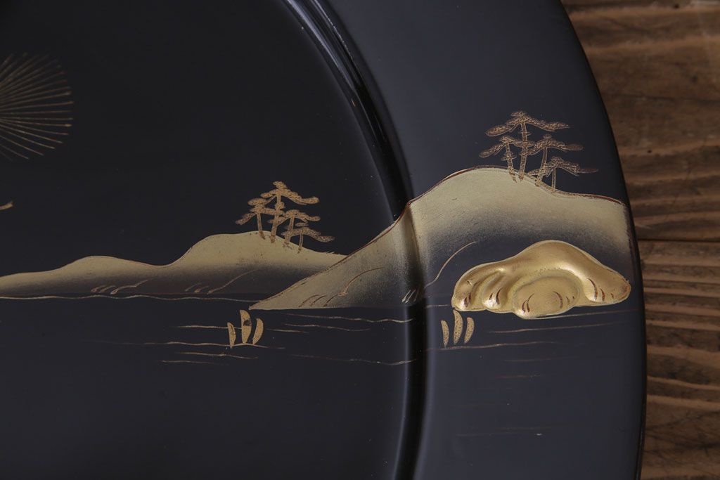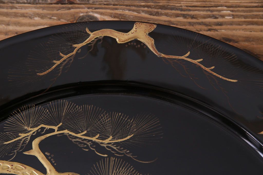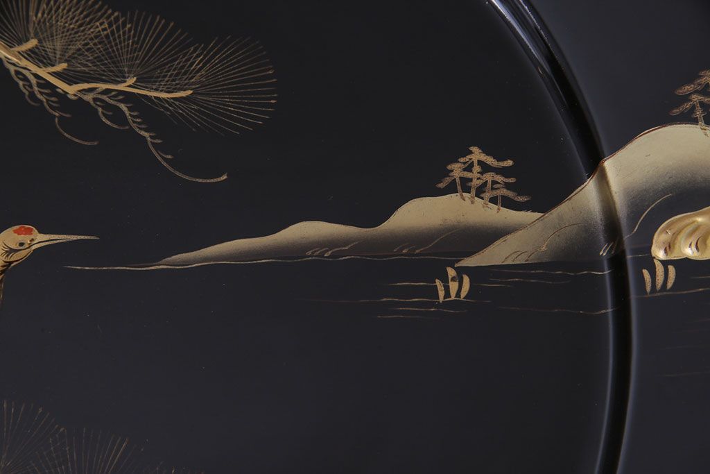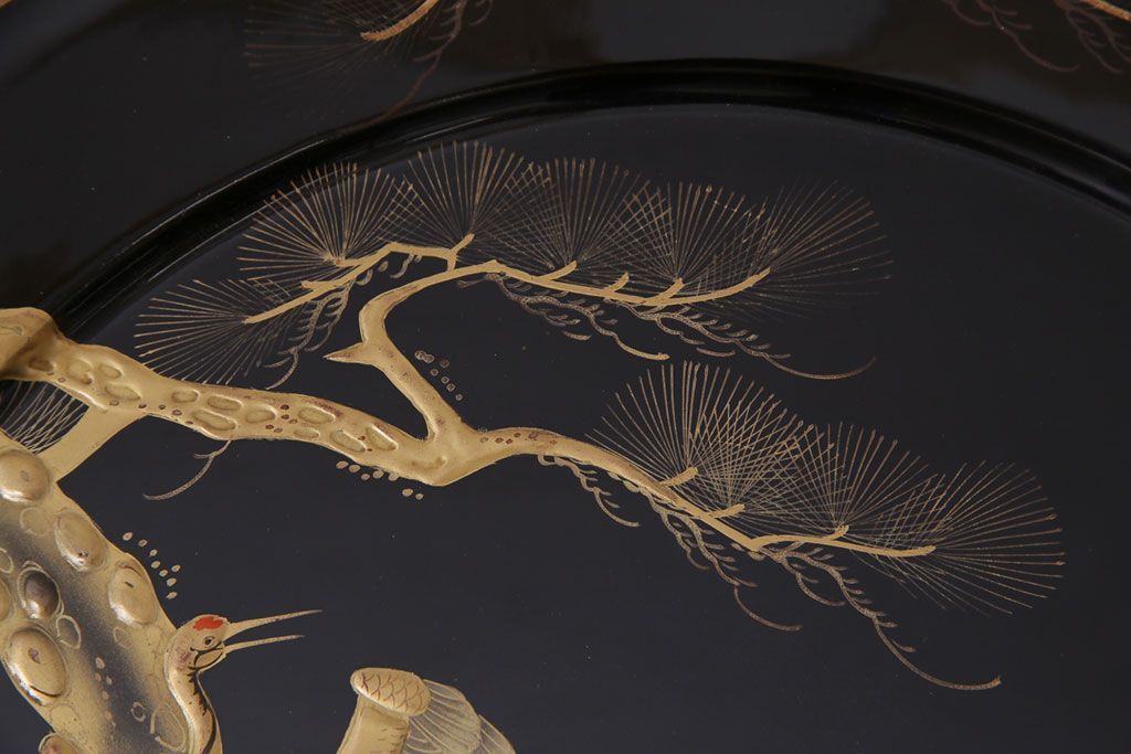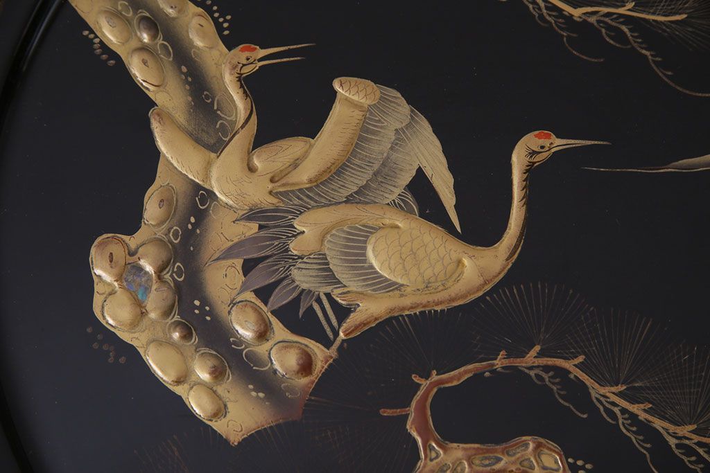 アンティーク雑貨 和製アンティーク 螺鈿入り 鶴・松の図 金彩高蒔絵木製大皿(漆器、和食器)