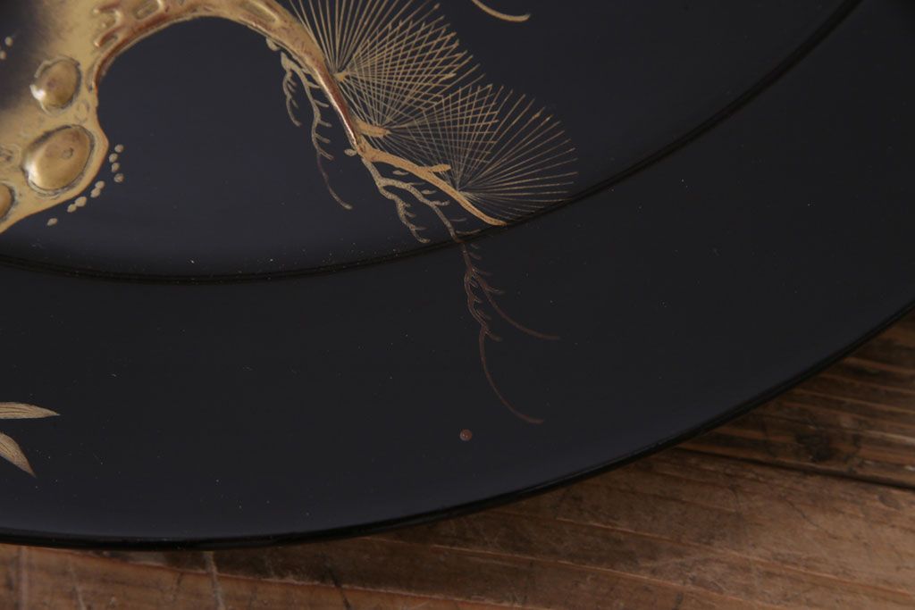 ラフジュ工房> 骨董・美術品> 骨董-漆器 > アンティーク雑貨 和製アンティーク 螺鈿入り 鶴・松の図 金彩高蒔絵木製大皿(漆器、和食器)