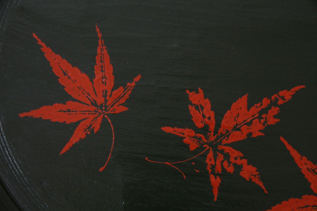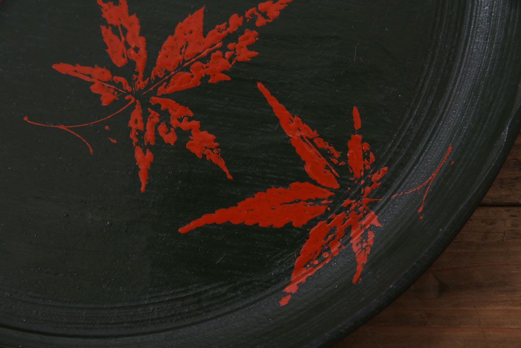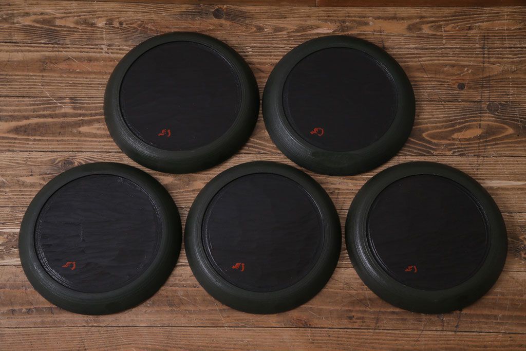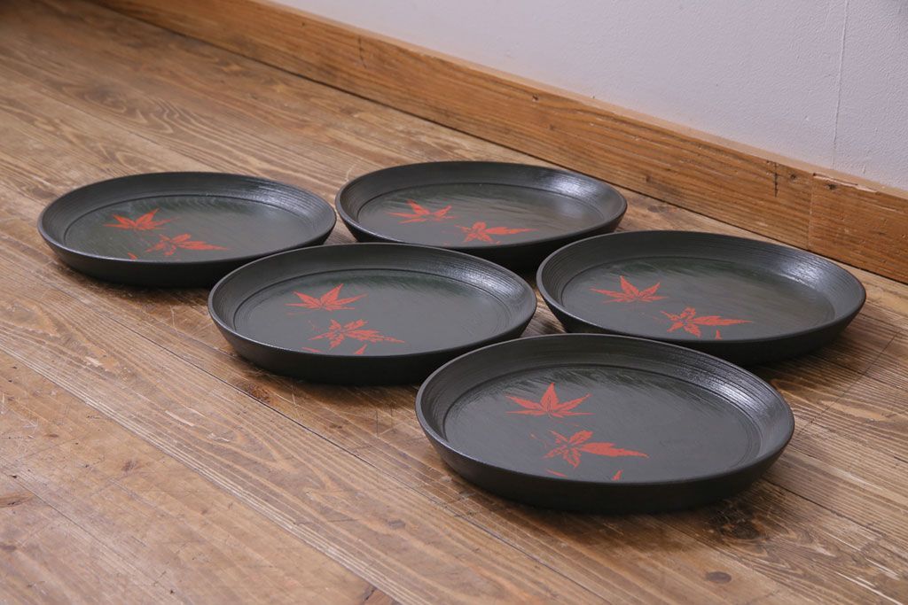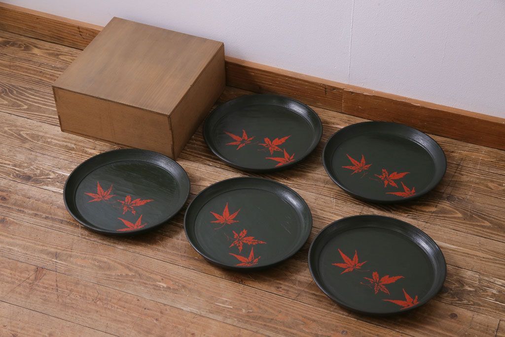 ラフジュ工房> 骨董・美術品> 骨董-漆器 > 和製アンティーク 紅葉の図 共箱付き青漆丸型膳(お盆、漆器)5枚セット