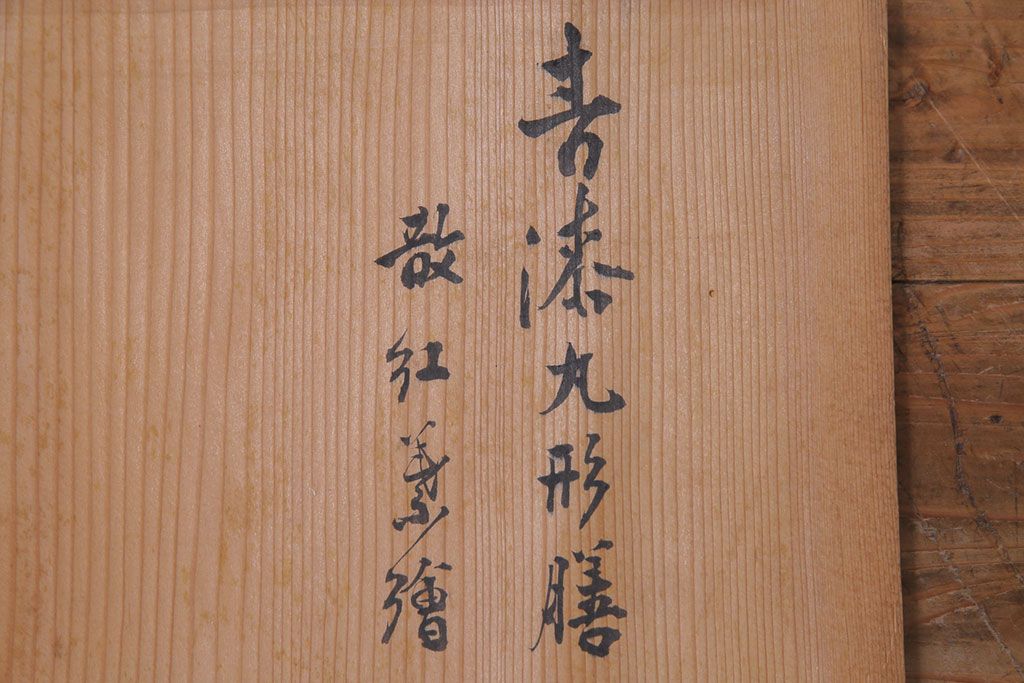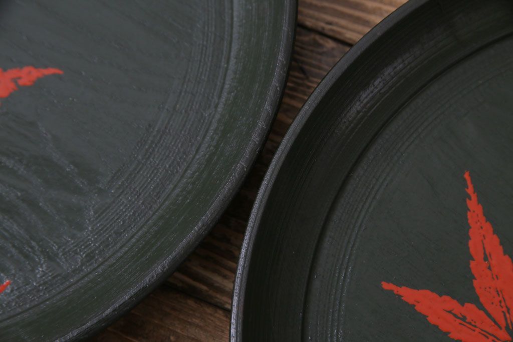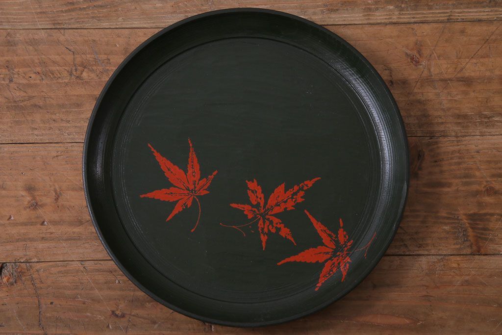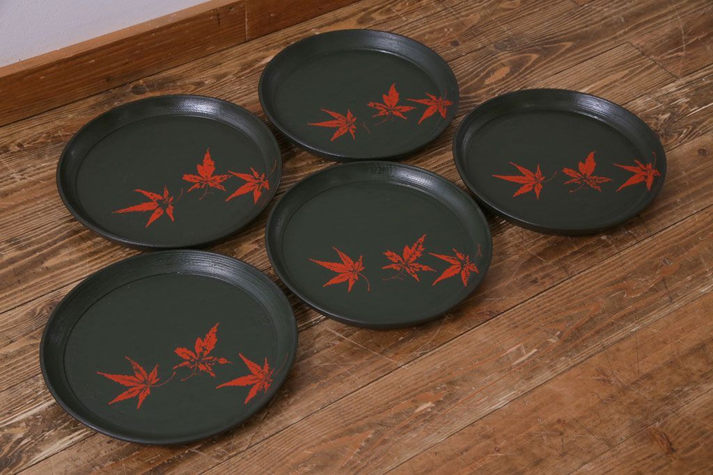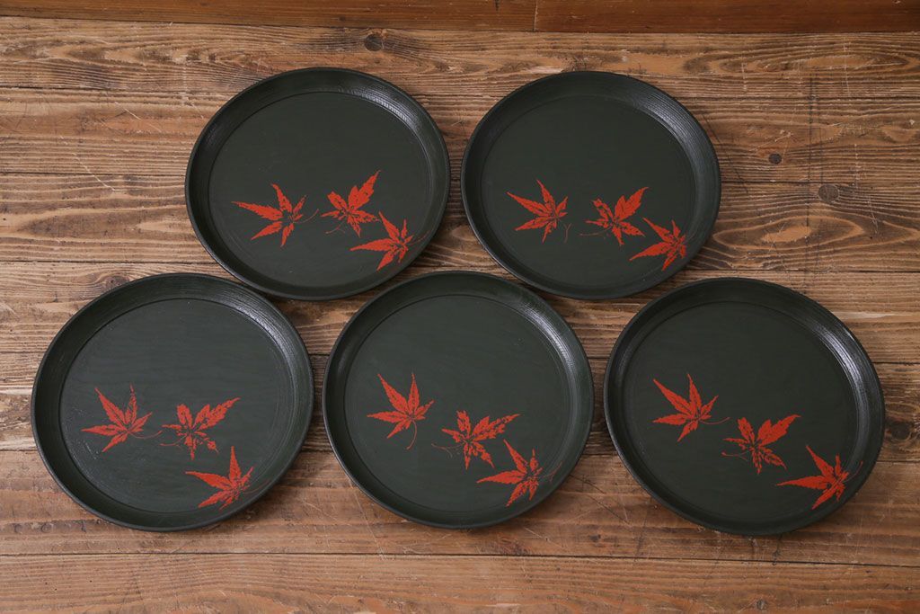 ラフジュ工房> 和食器・茶道具> お盆・お膳・お重 > 和製アンティーク 紅葉の図 共箱付き青漆丸型膳(お盆、漆器)5枚セット