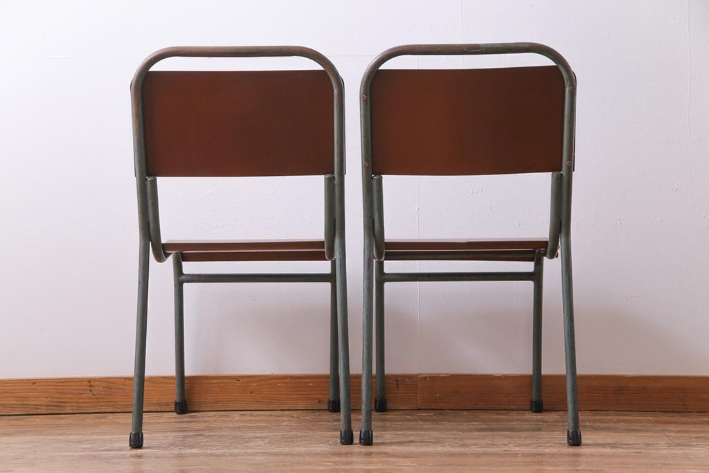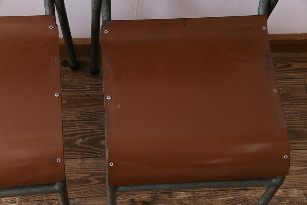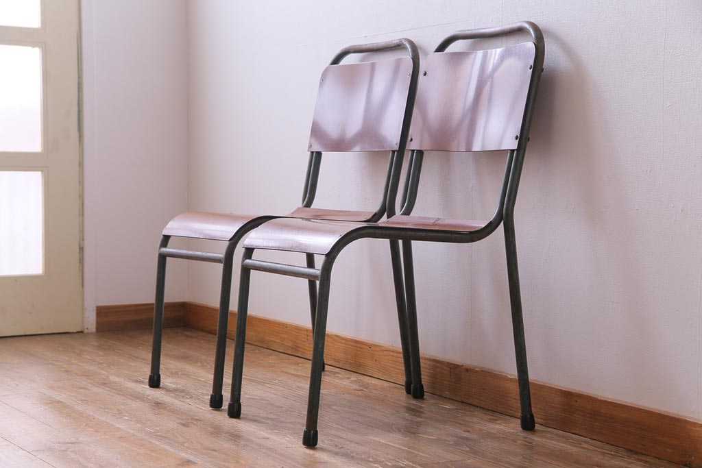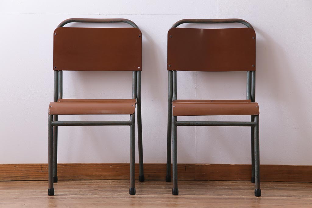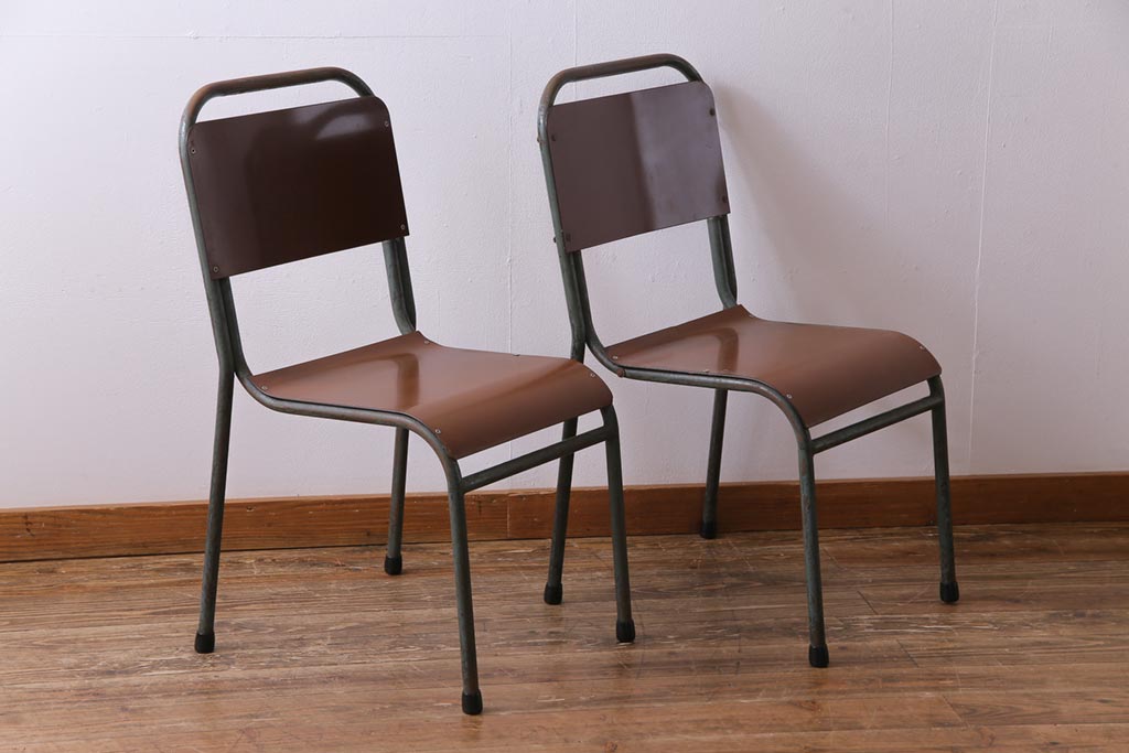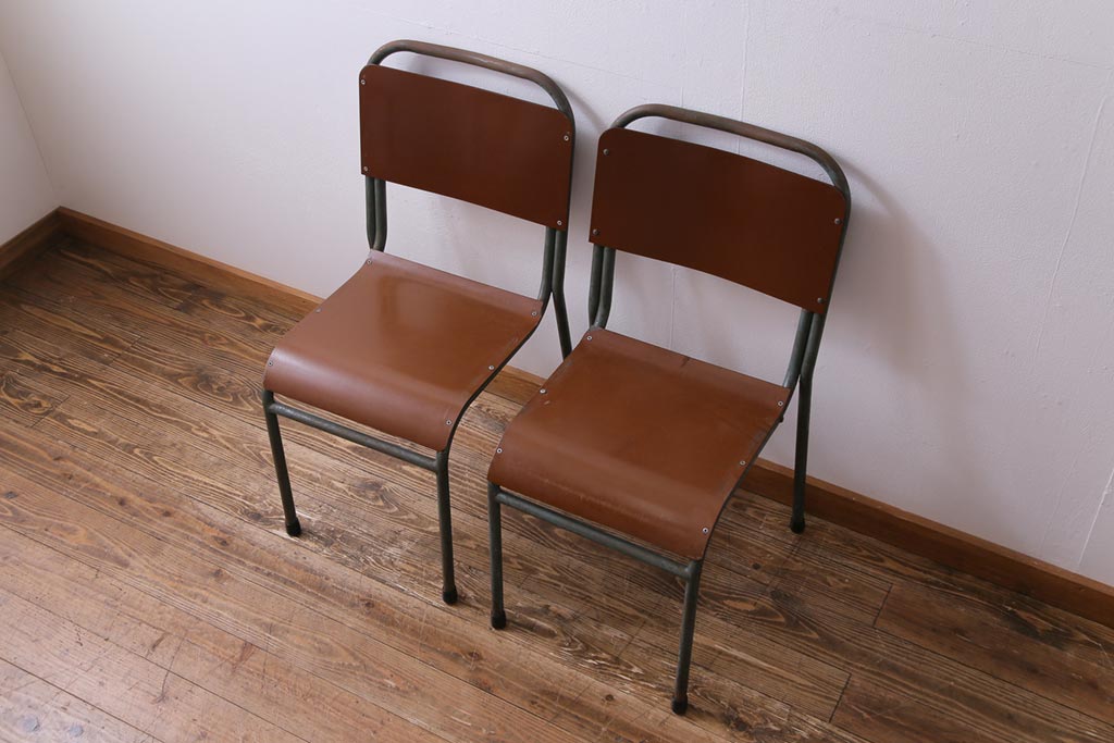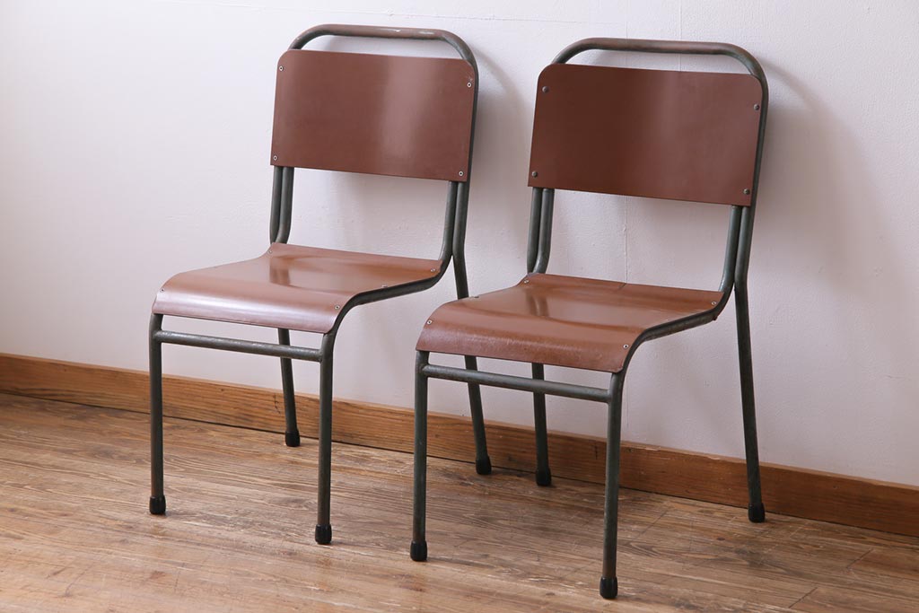 ヴィンテージ家具 イギリスビンテージ ベークライト 座面のカーブが特徴的なスクールチェア(鉄脚チェア、椅子)2脚セット