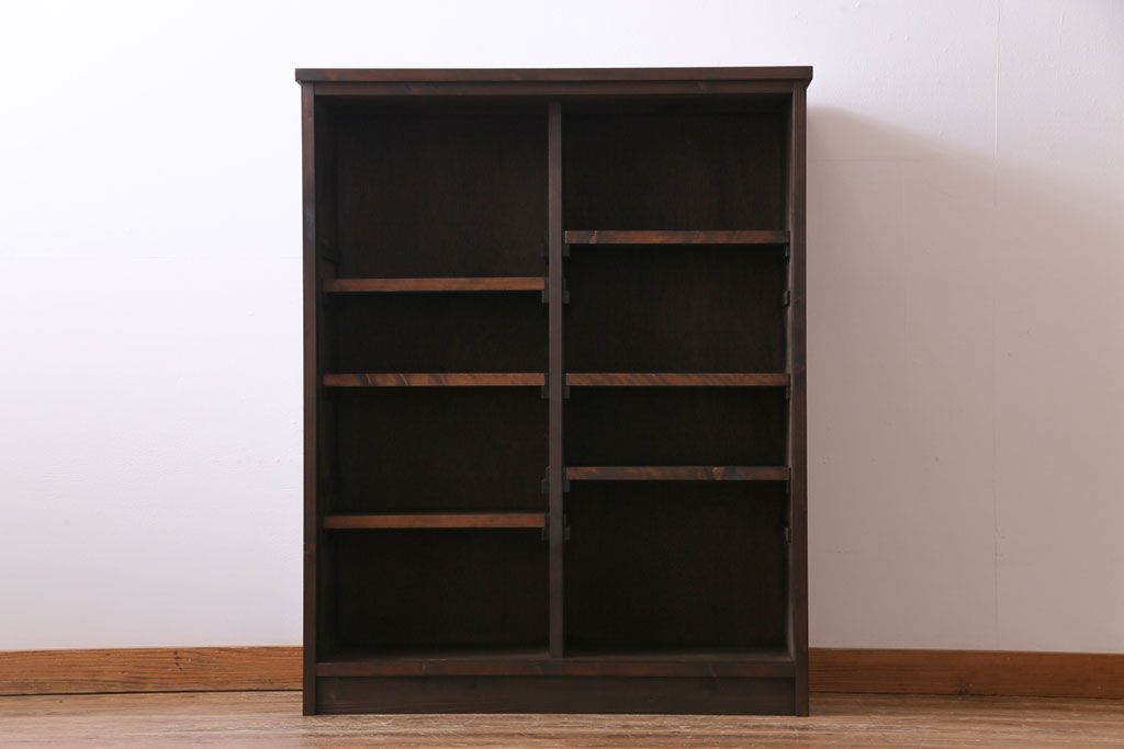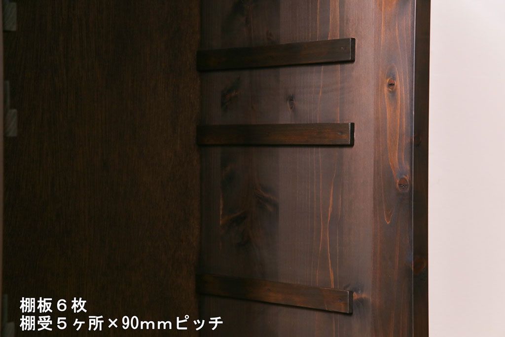 棚板は取り外しできます。棚板は6枚あります。棚受けは5ヶ所、90mmピッチで調整できます。棚幅サイズのものが1枚の作りです。