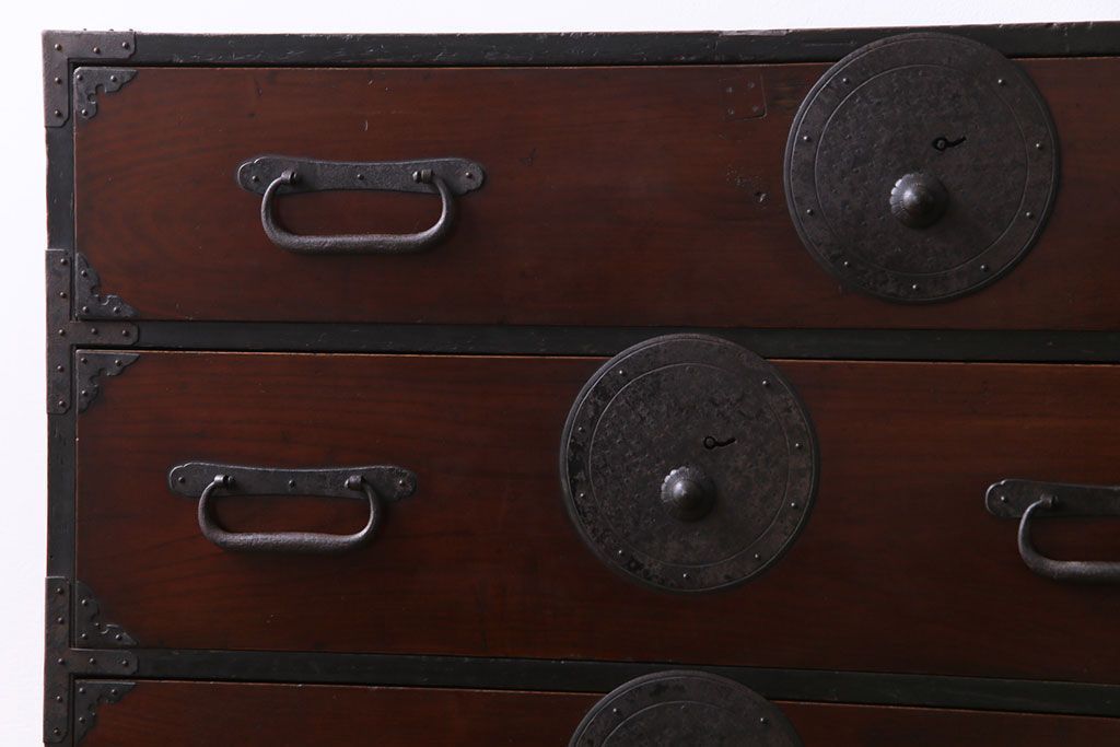 アンティーク家具 和製アンティーク 前面栗材 落ち着いた和の雰囲気が魅力の最上箪笥(衣装箪笥、引き出し)