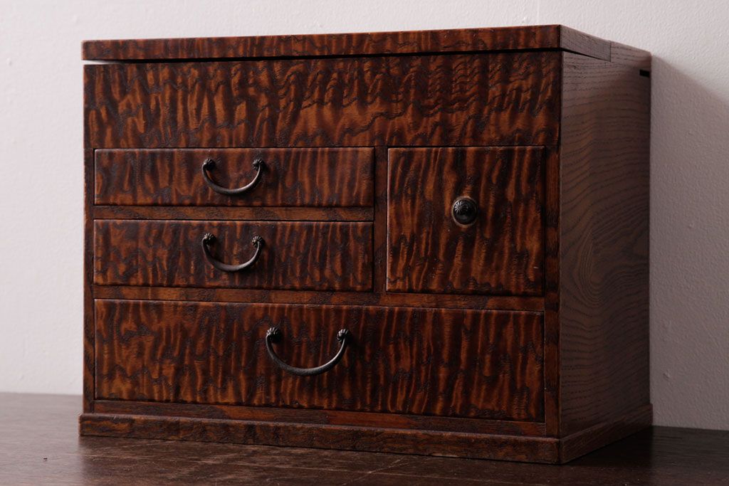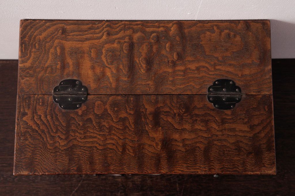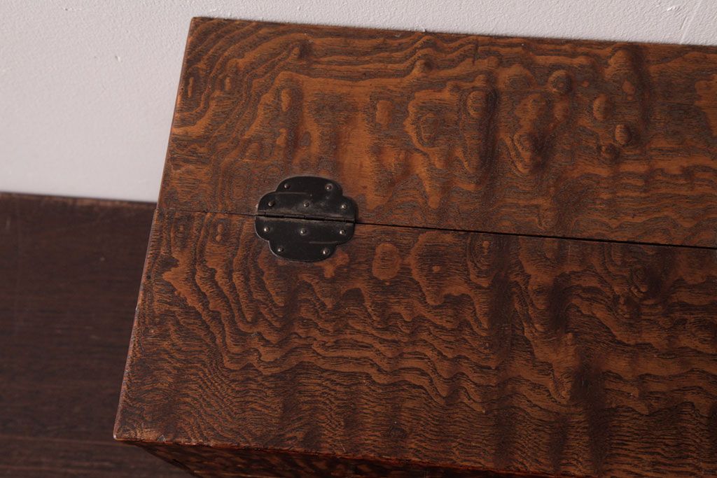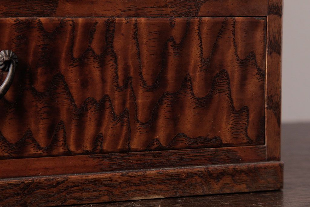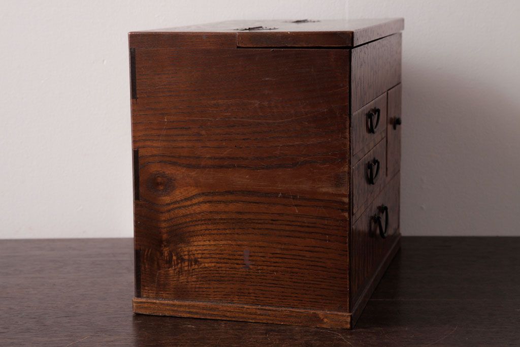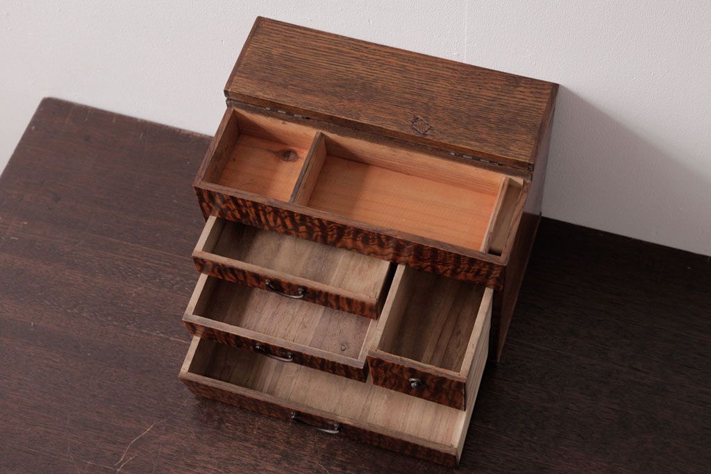 アンティーク雑貨 和製アンティーク タモ材 独特の杢目が存在感のあるソーイングボックス(裁縫箱、小引き出し)