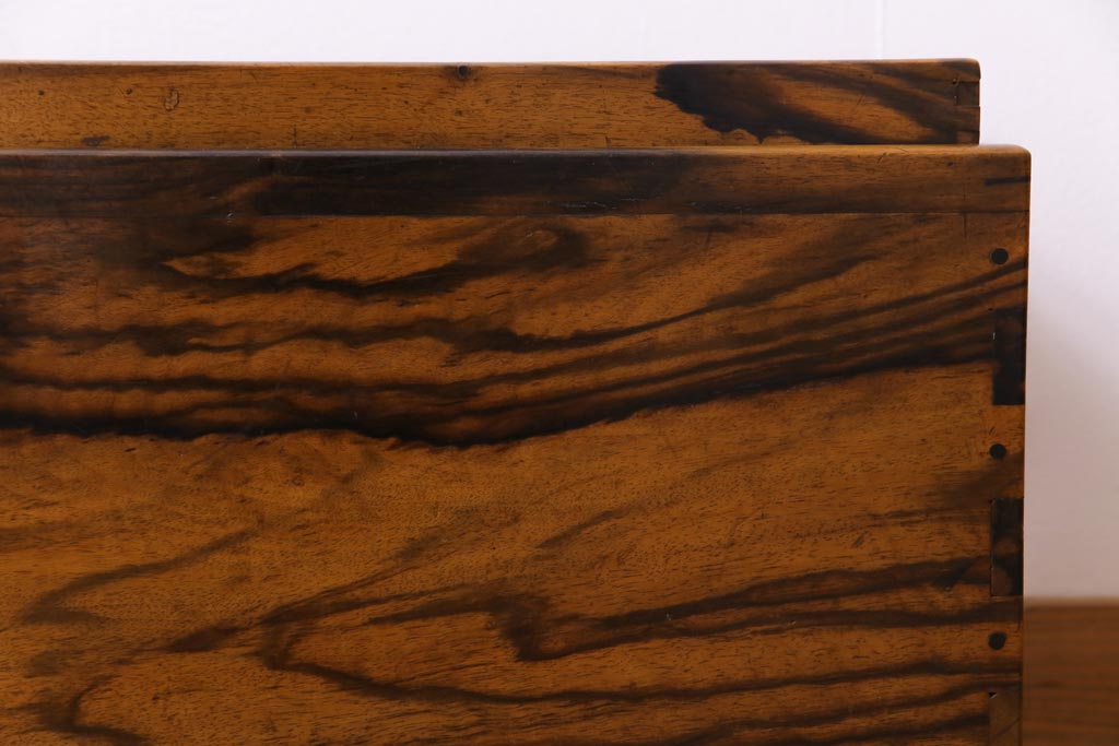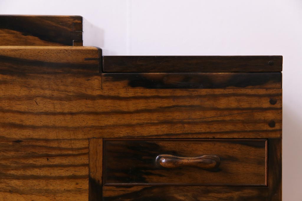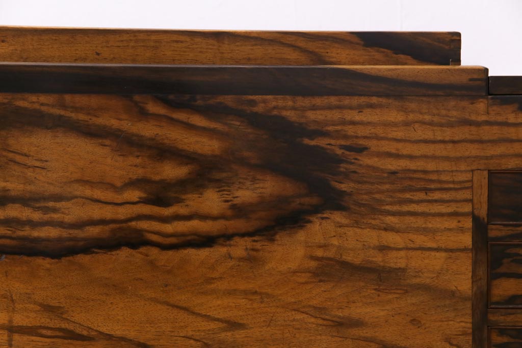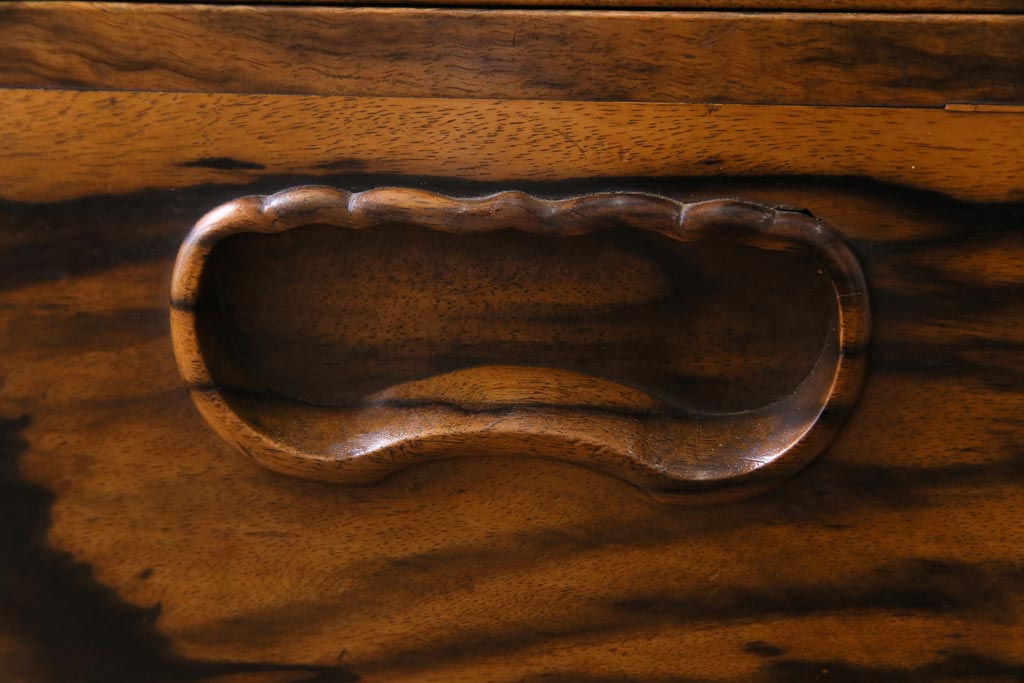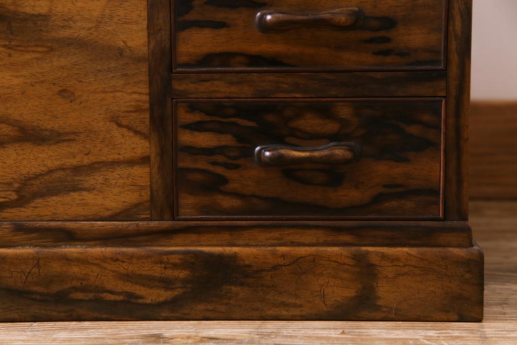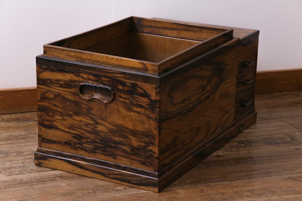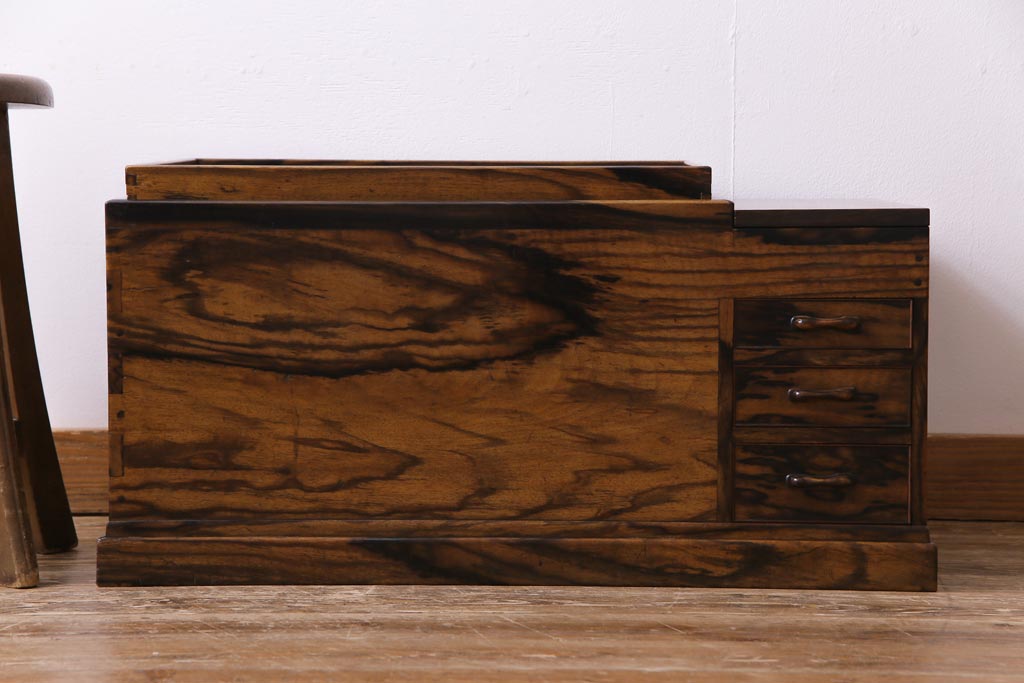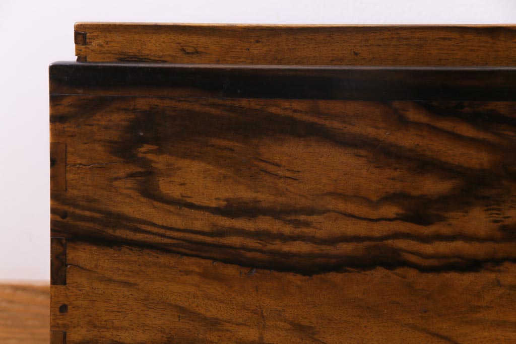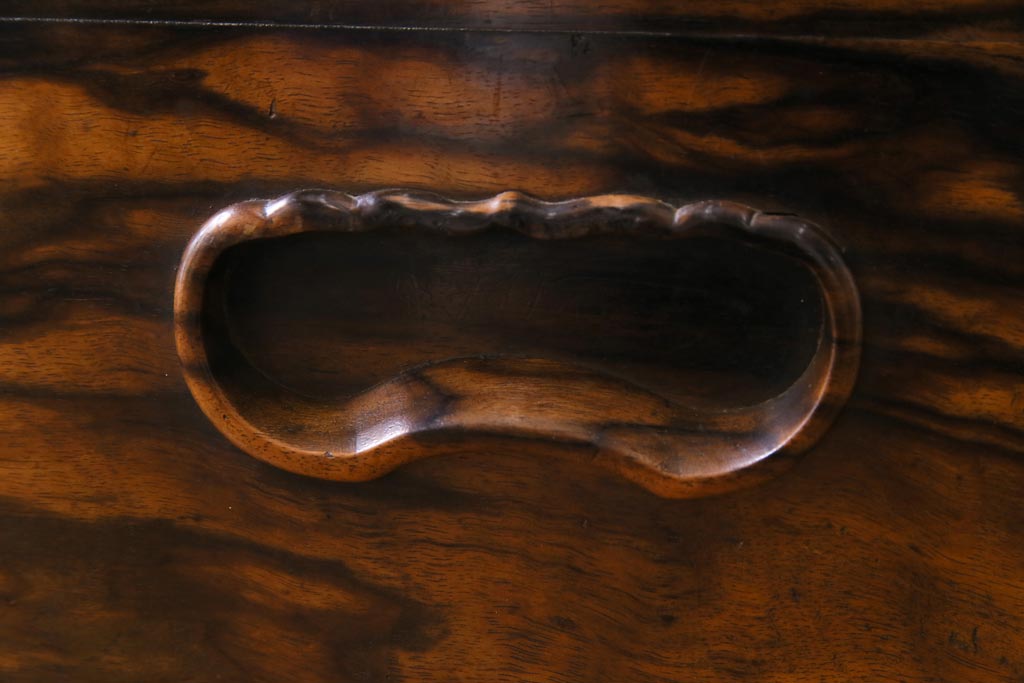ラフジュ工房> 火鉢> 木製火鉢 > アンティーク雑貨 和製アンティーク 最高級品!黒柿無垢材 独特の杢目が趣深い猫板付き長火鉢