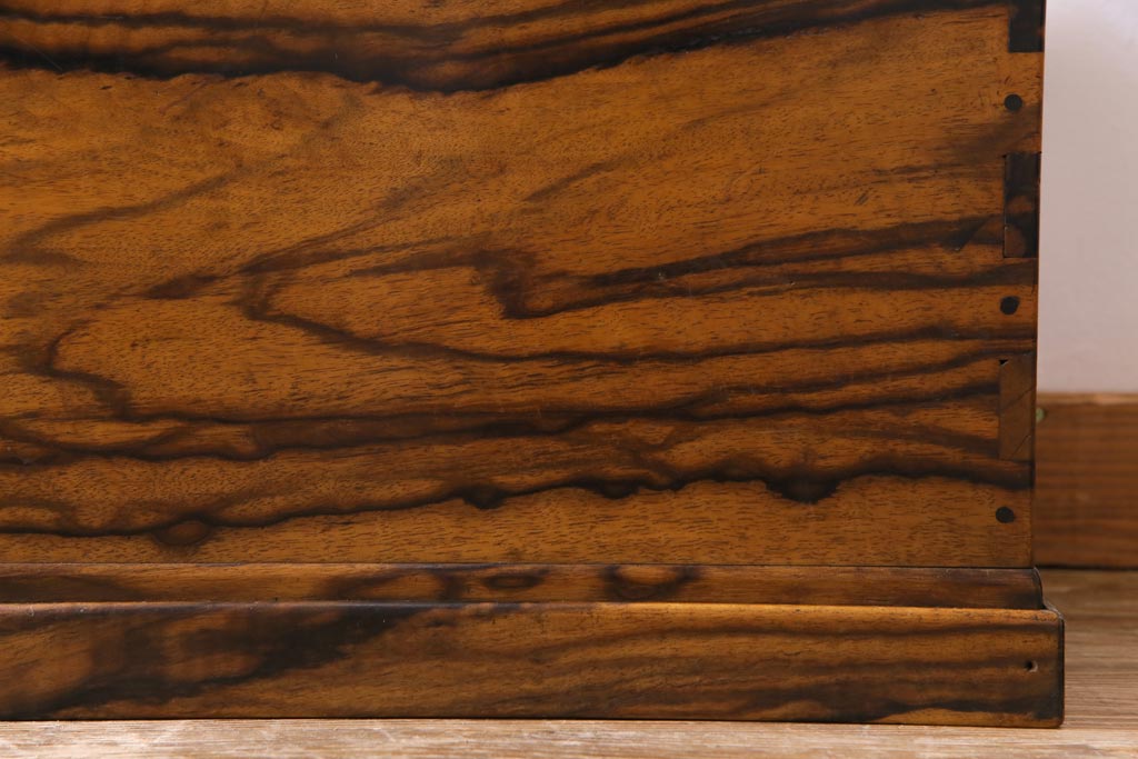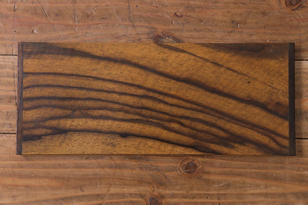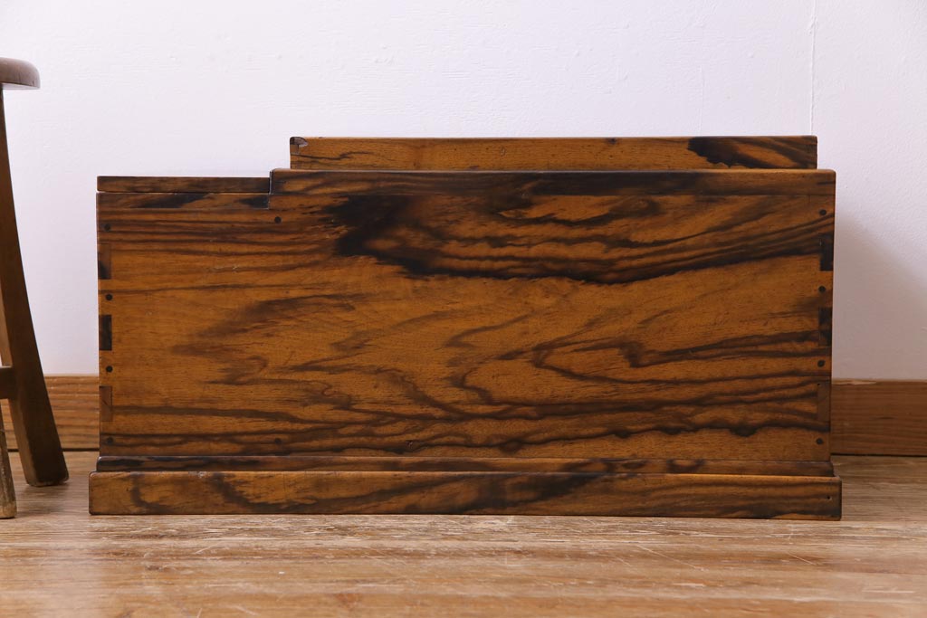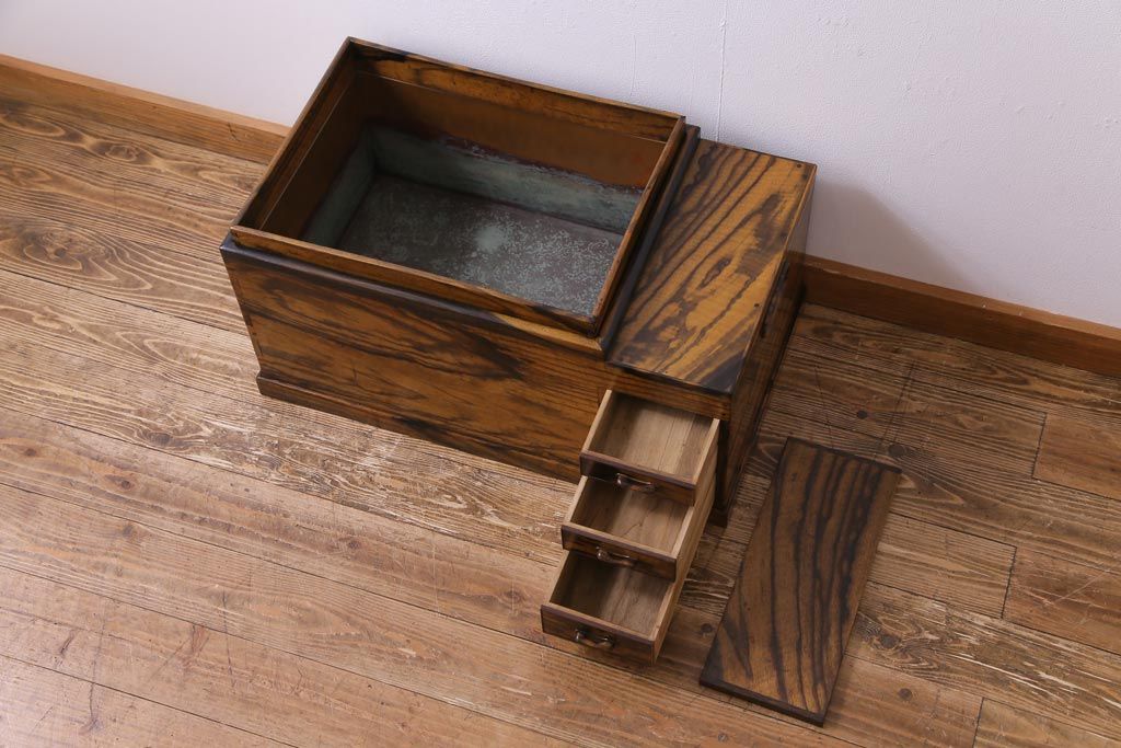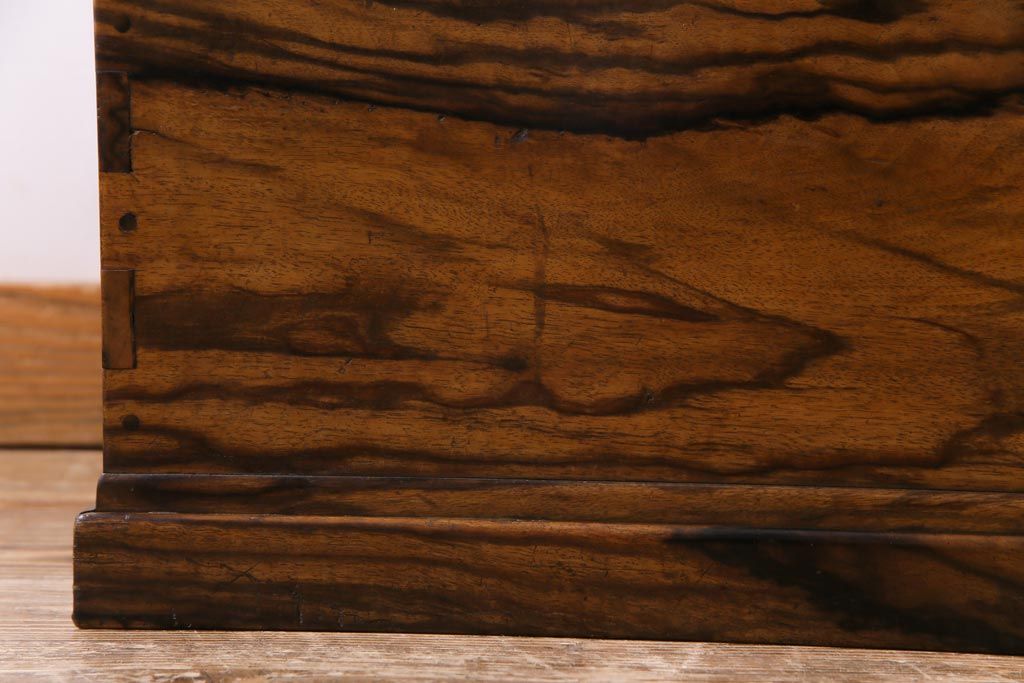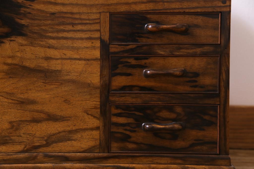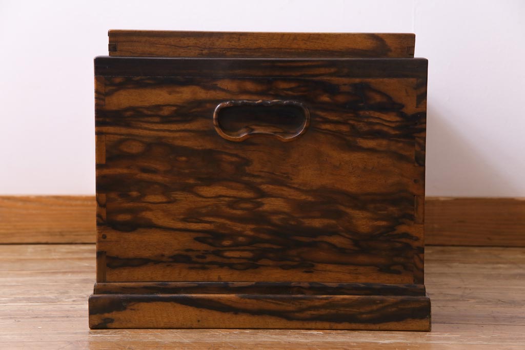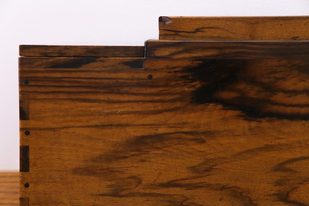 ラフジュ工房> 火鉢> 木製火鉢 > アンティーク雑貨 和製アンティーク 最高級品!黒柿無垢材 独特の杢目が趣深い猫板付き長火鉢
