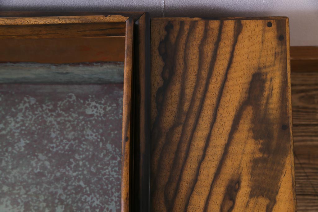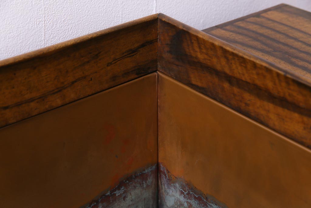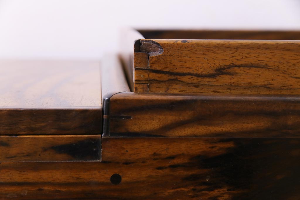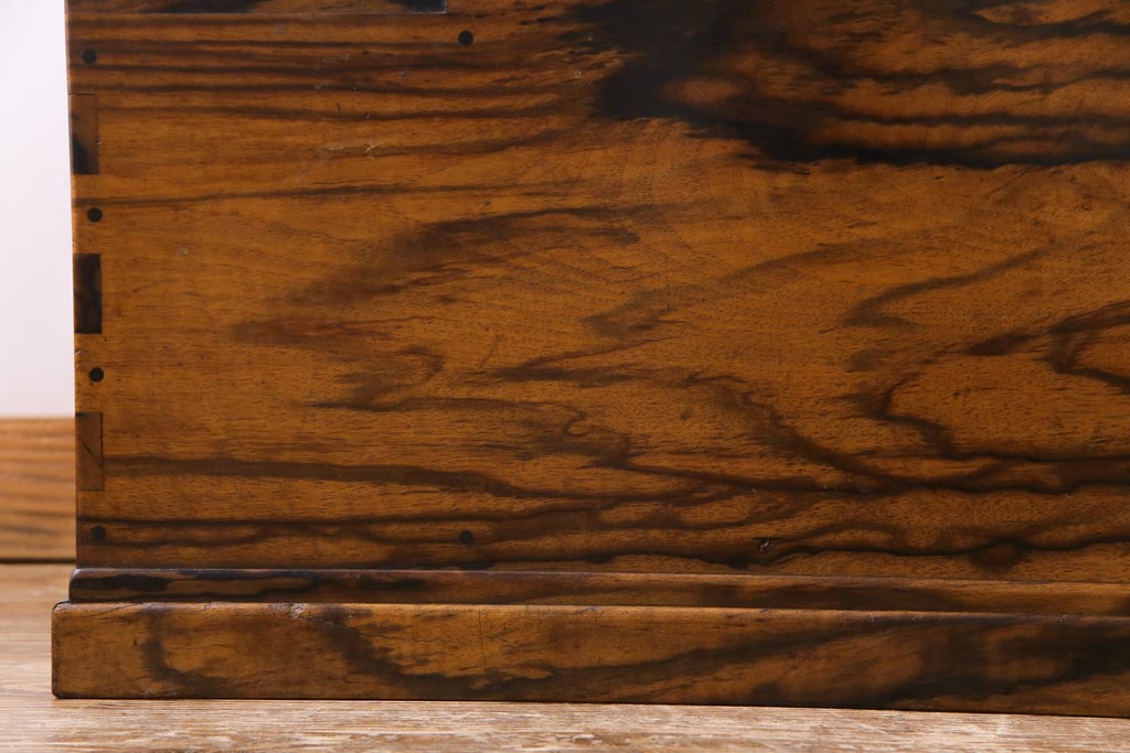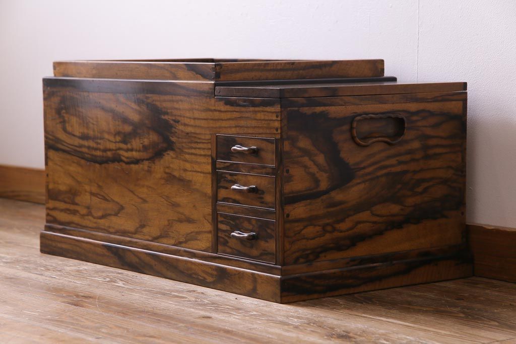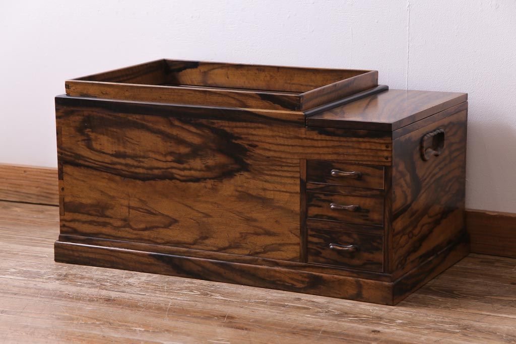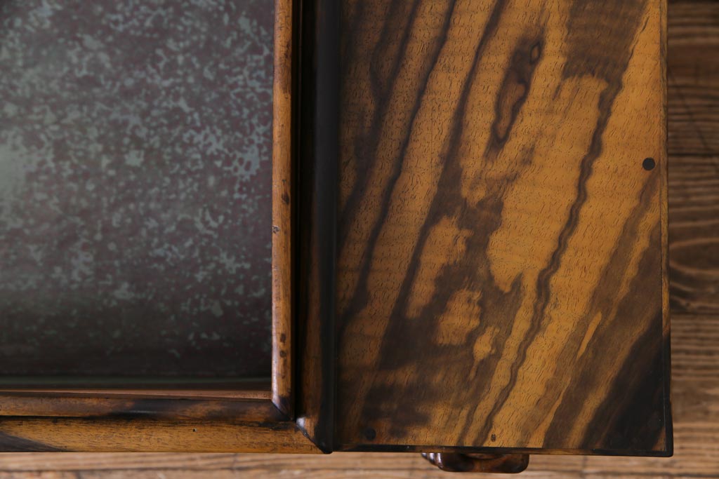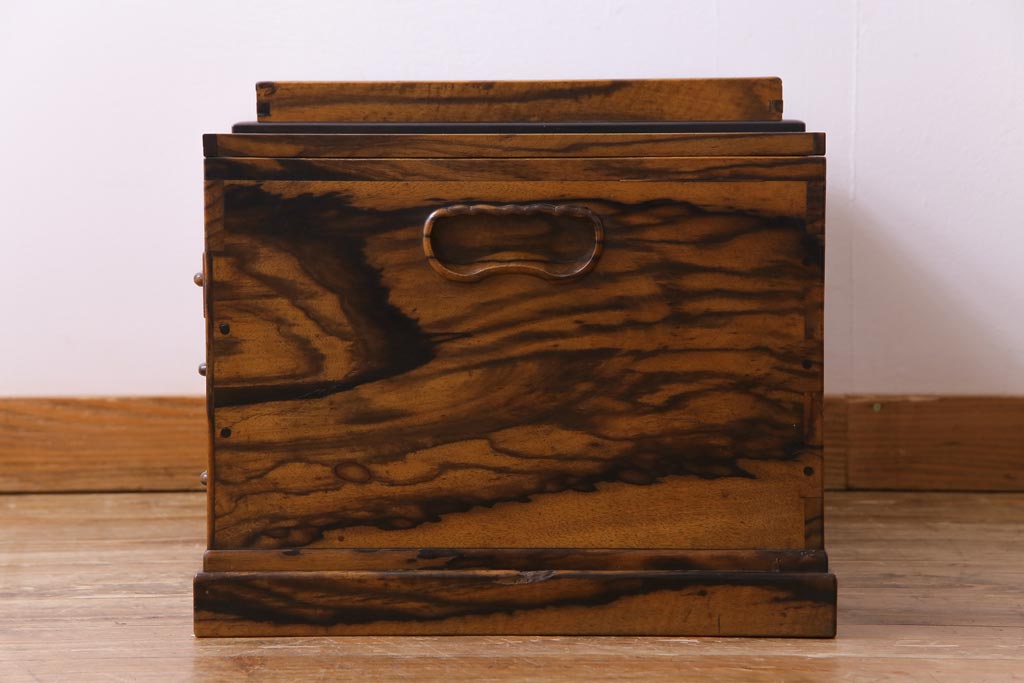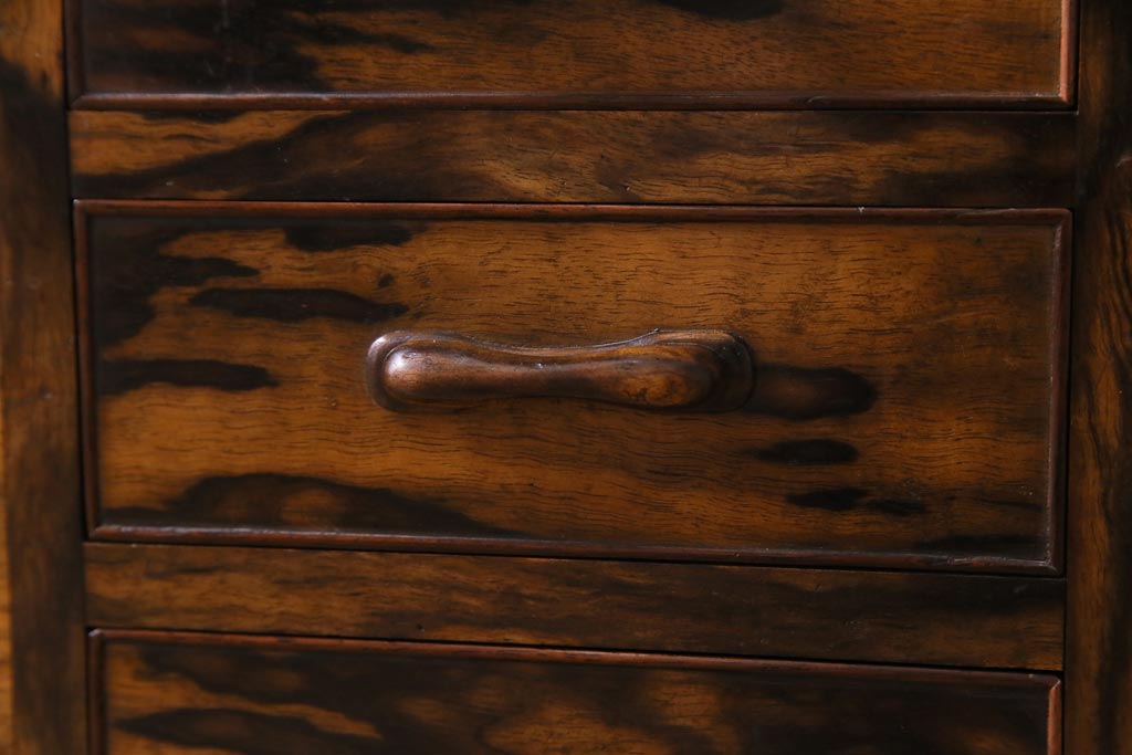 ラフジュ工房> 火鉢> 木製火鉢 > アンティーク雑貨 和製アンティーク 最高級品!黒柿無垢材 独特の杢目が趣深い猫板付き長火鉢