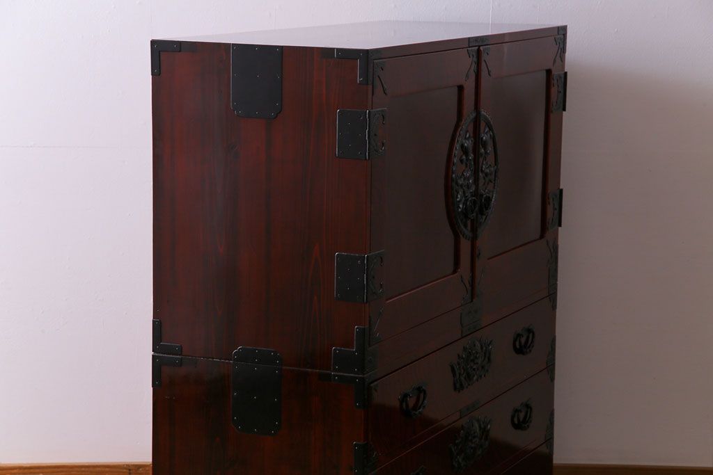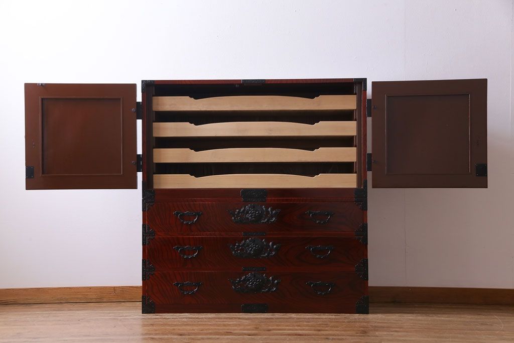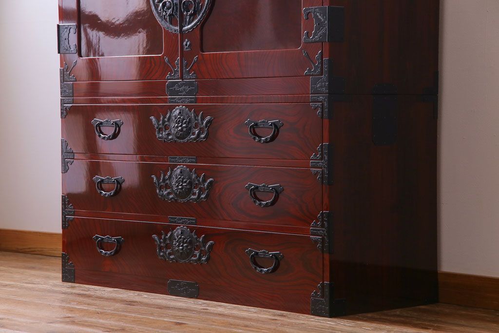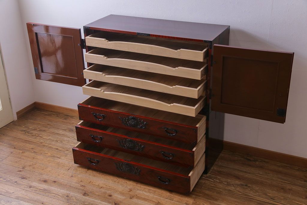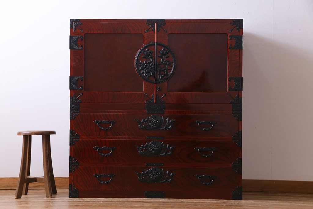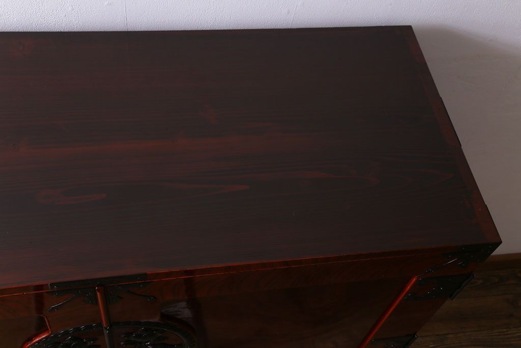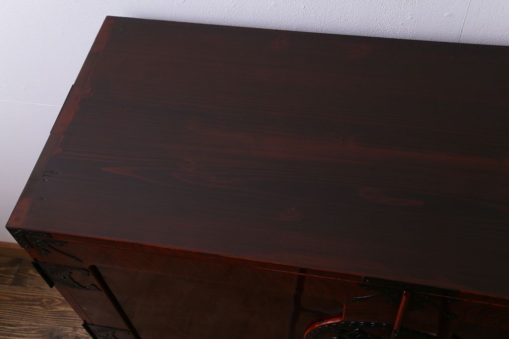 極美品 手打ち金具 厚みのある漆塗りが美しい観音開き戸付き仙台箪笥(衣装箪笥、和タンス)