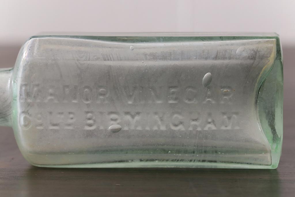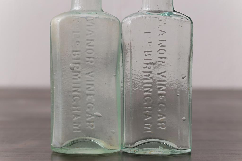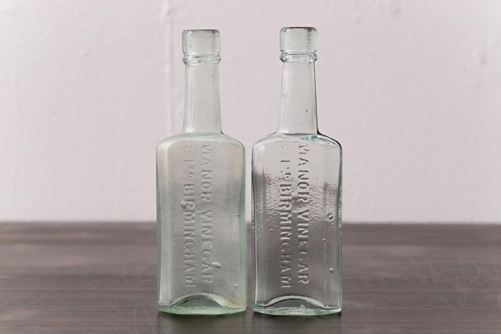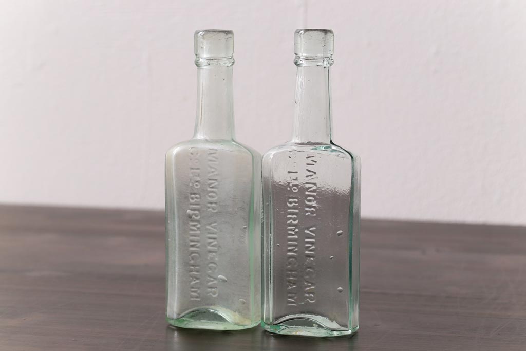 アンティーク雑貨 イギリスビンテージ MANOR VINEGAR エンボスが格好いいお酢のガラスビン(ボトル、瓶)2個セット