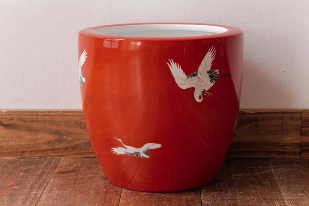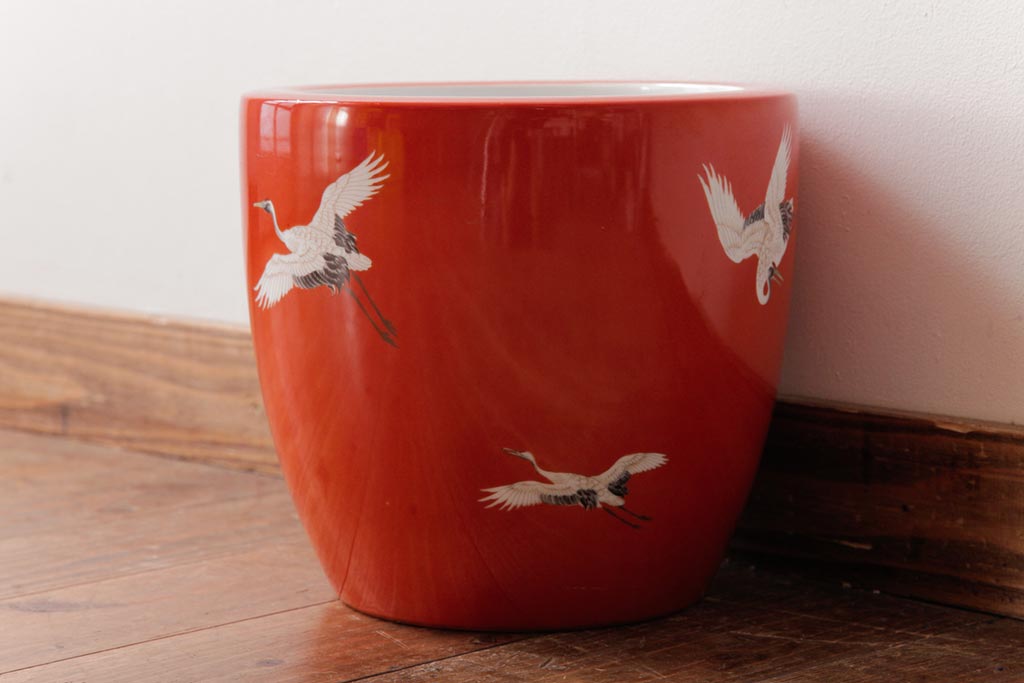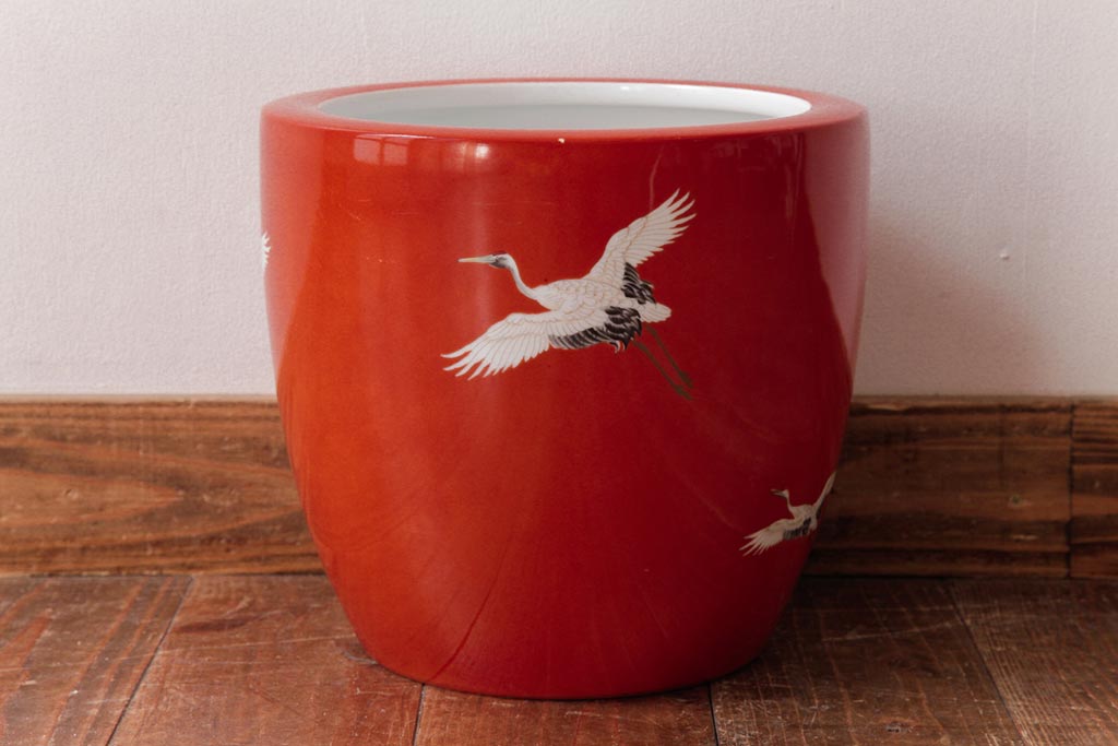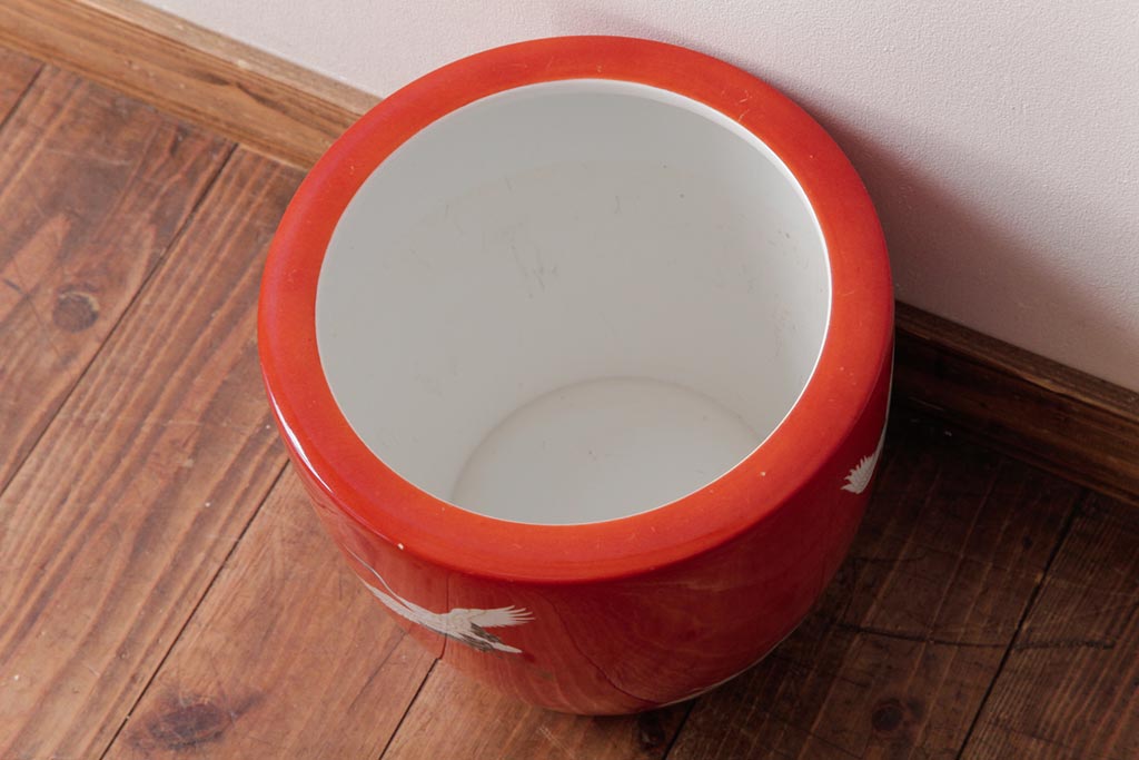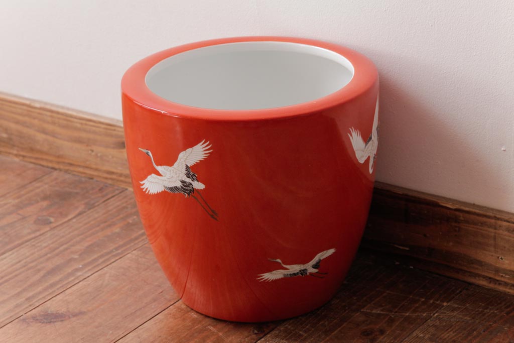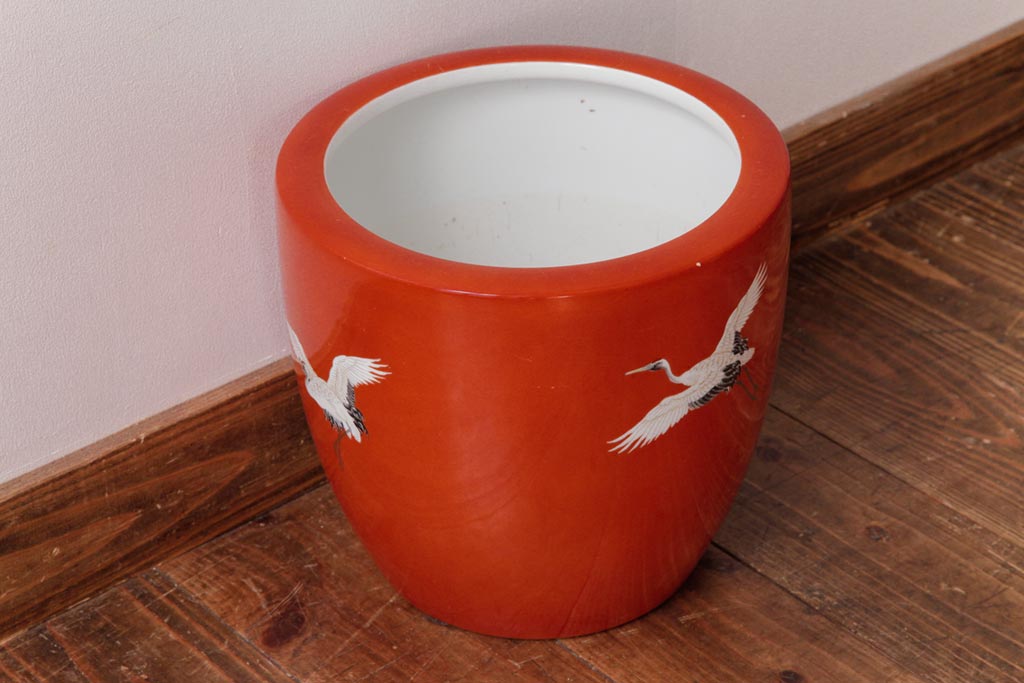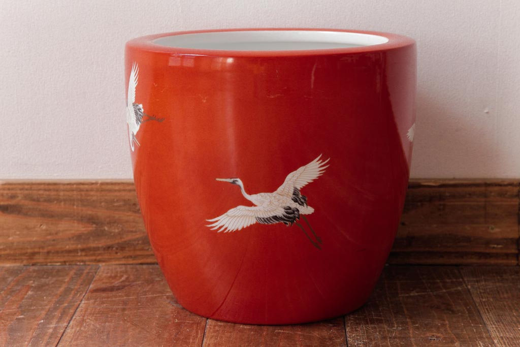 火鉢> 瀬戸火鉢 > アンティーク雑貨 ノリタケ・則武(日陶) 鶴の図 朱色が目を引く小振りの瀬戸火鉢(手あぶり、鉢カバー)(1)
