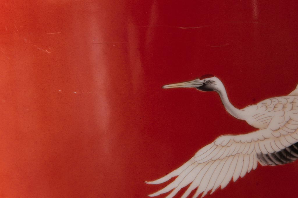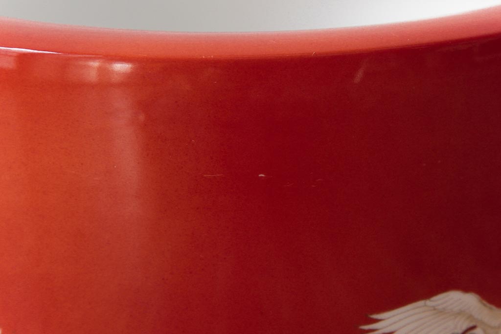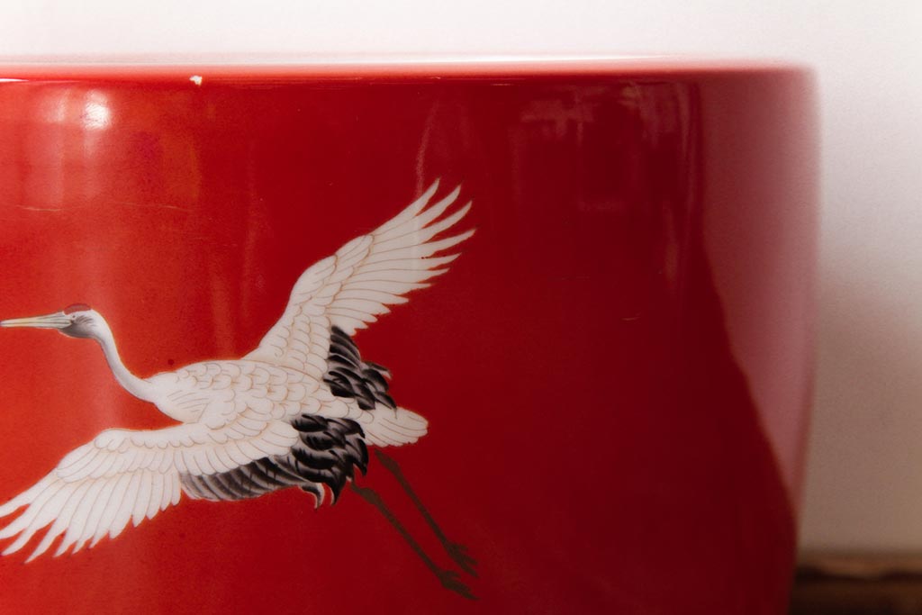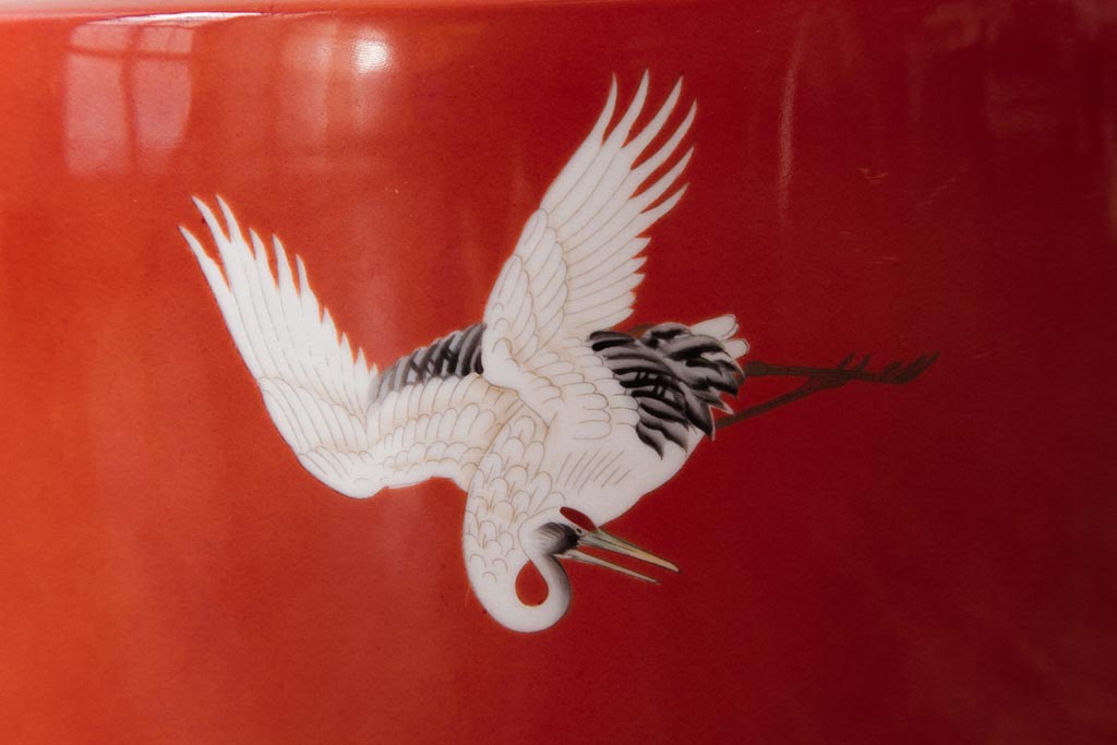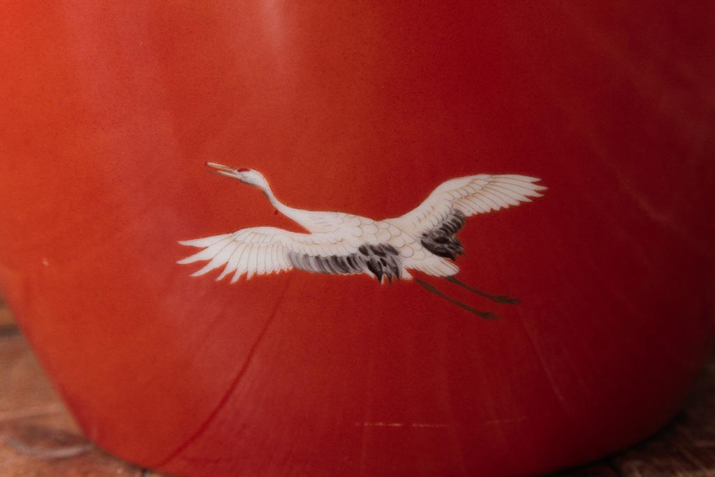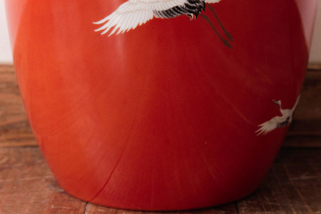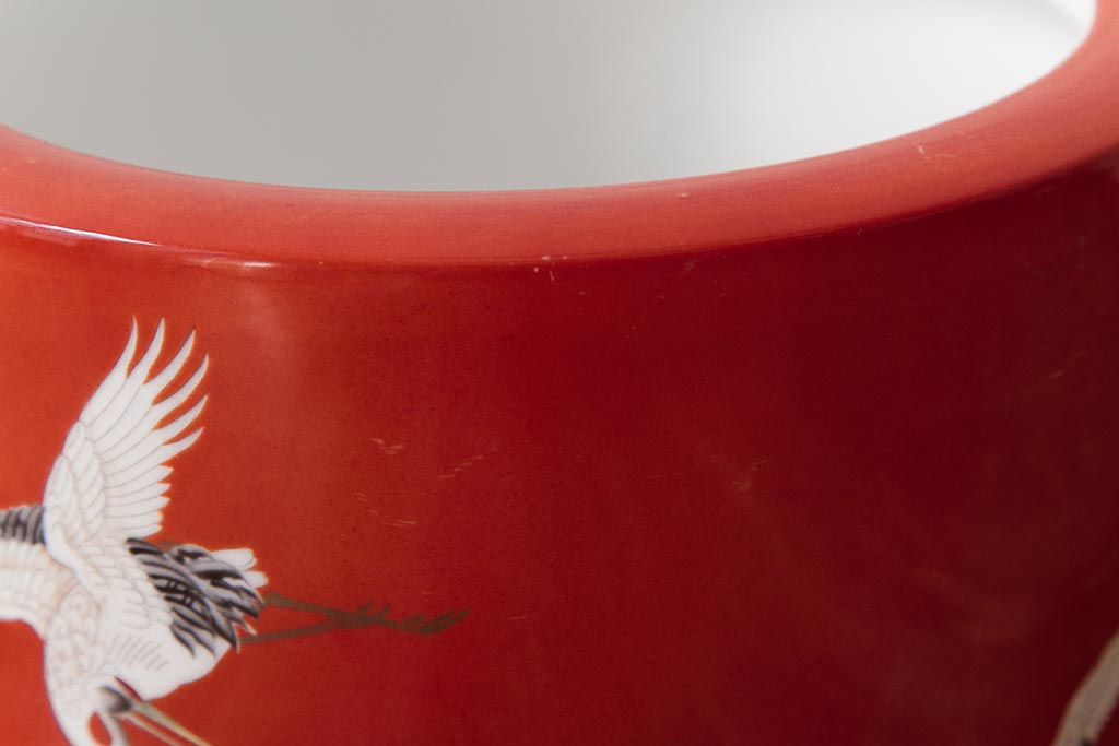 火鉢> 瀬戸火鉢 > アンティーク雑貨 ノリタケ・則武(日陶) 鶴の図 朱色が目を引く小振りの瀬戸火鉢(手あぶり、鉢カバー)(1)