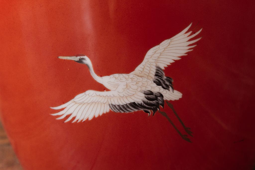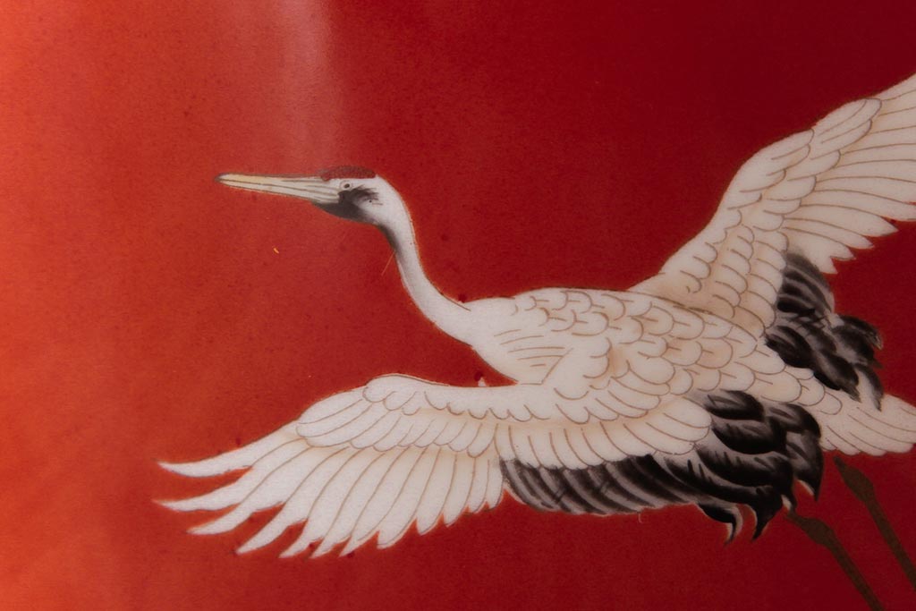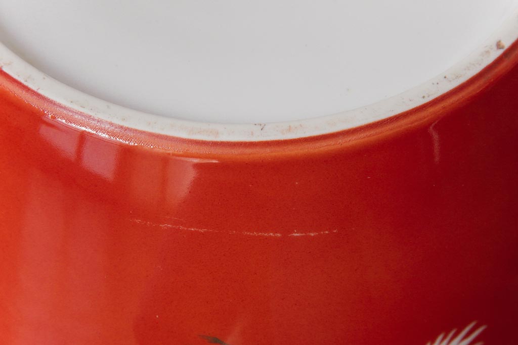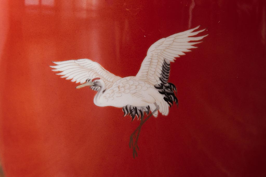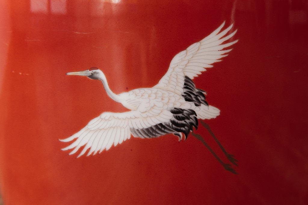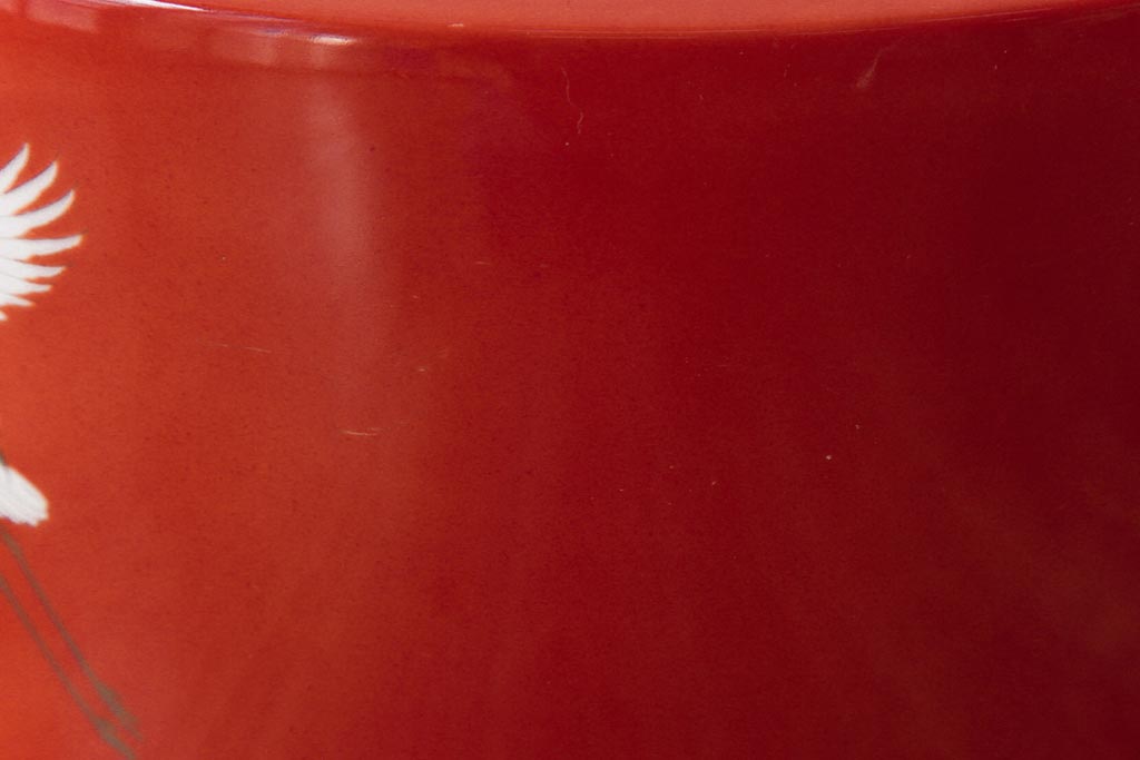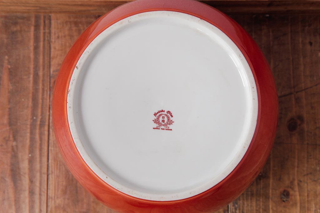 火鉢> 瀬戸火鉢 > アンティーク雑貨 ノリタケ・則武(日陶) 鶴の図 朱色が目を引く小振りの瀬戸火鉢(手あぶり、鉢カバー)(1)