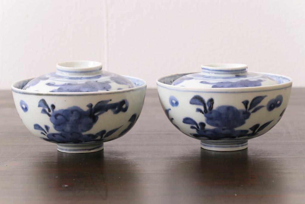 和製アンティーク 江戸期 染付 優しい色合いが親しみ感じる蓋茶碗2客セット(和食器)