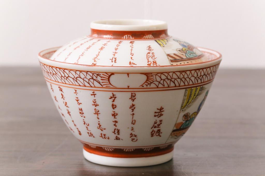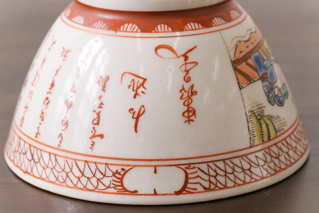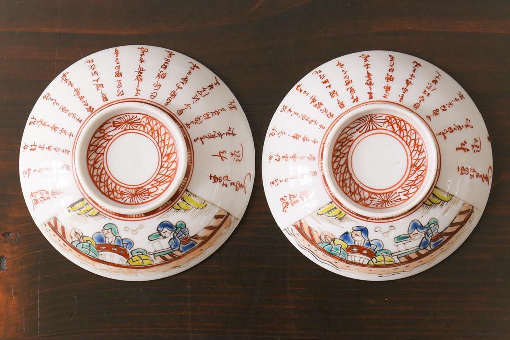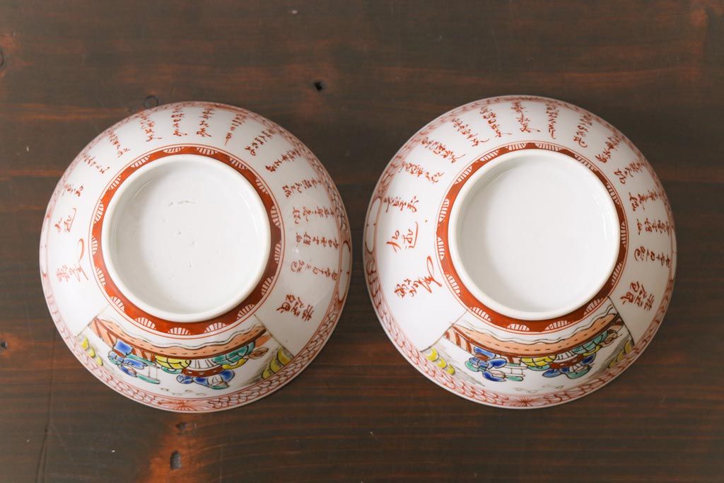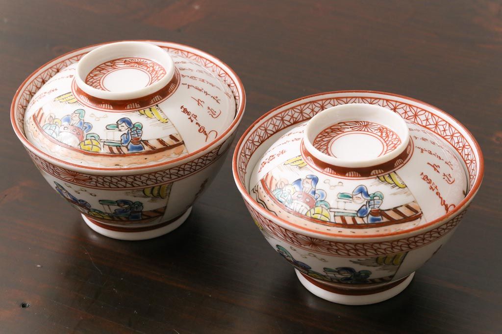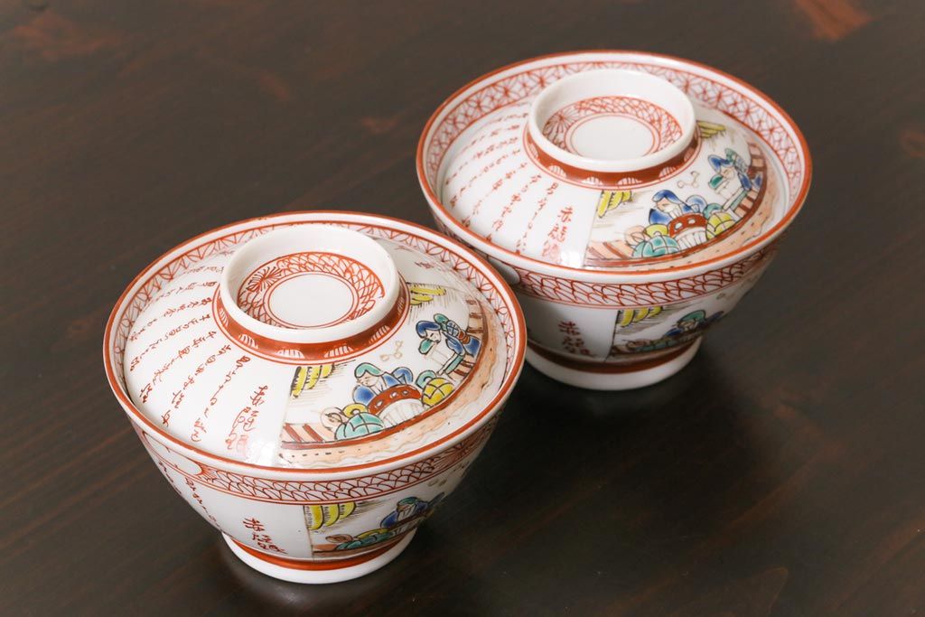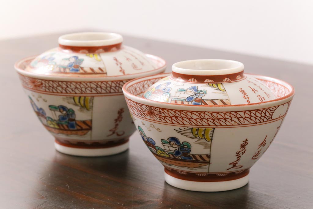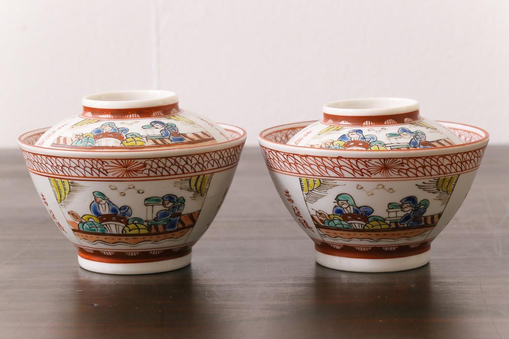 幕末明治期 赤絵染付 味わいある絵柄の蓋茶碗2客セット(和食器)(2)