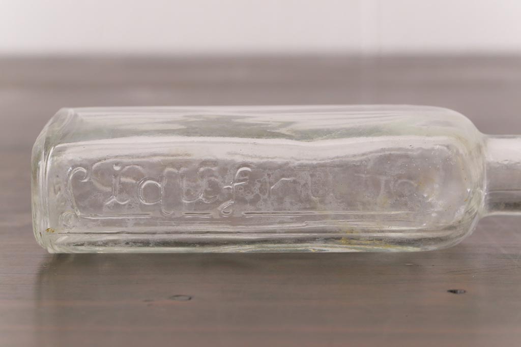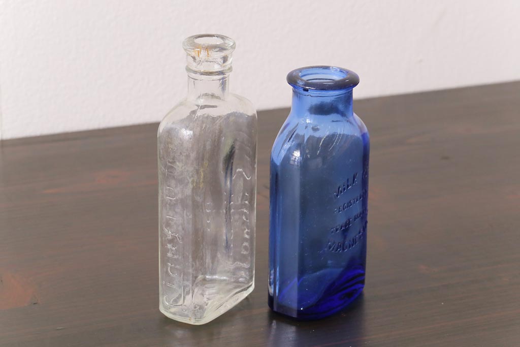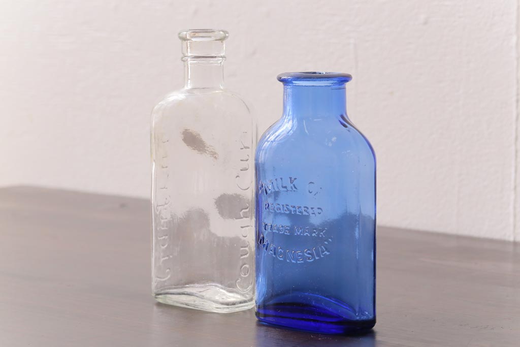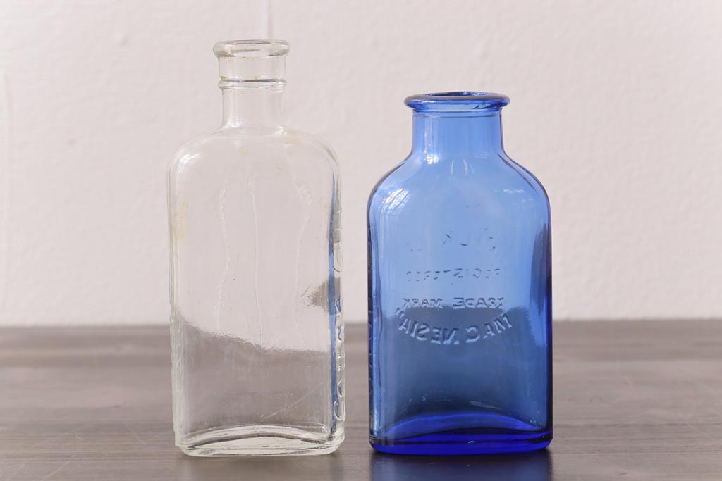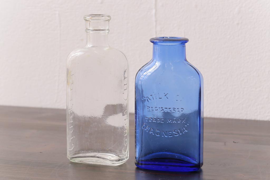 アンティーク雑貨 イギリスビンテージ レトロな雰囲気漂うエンボス入り薬瓶(ボトル、ガラスビン)2本セット