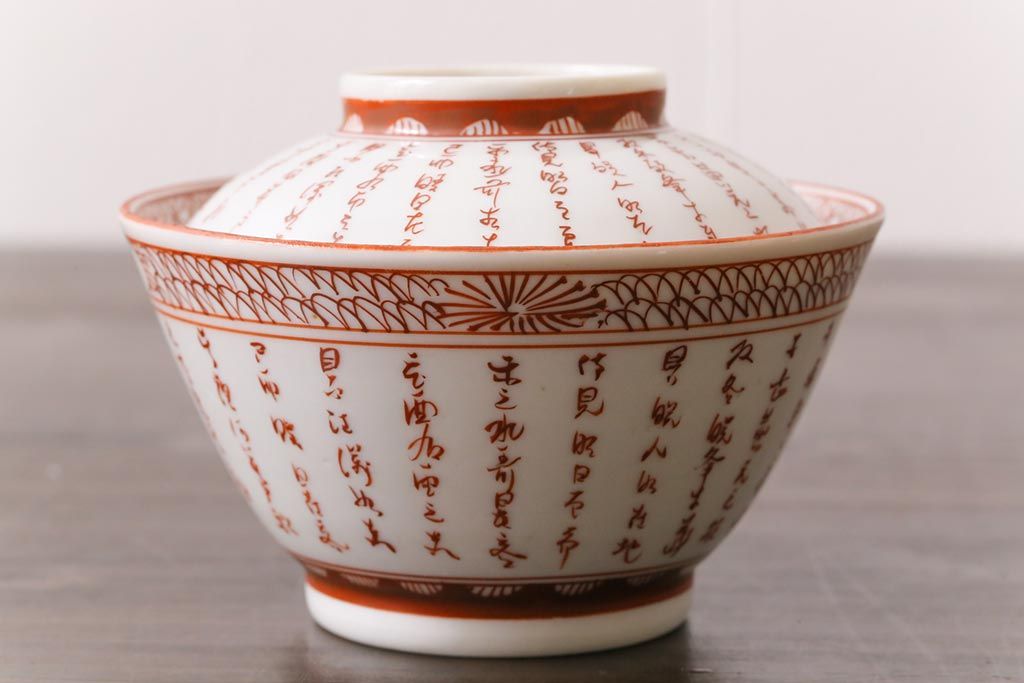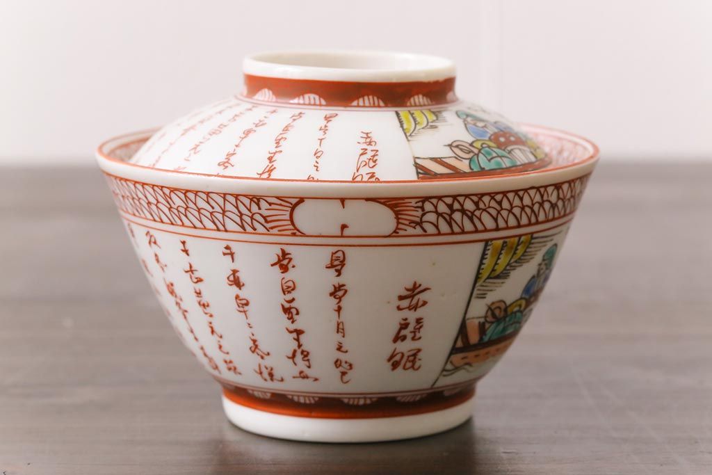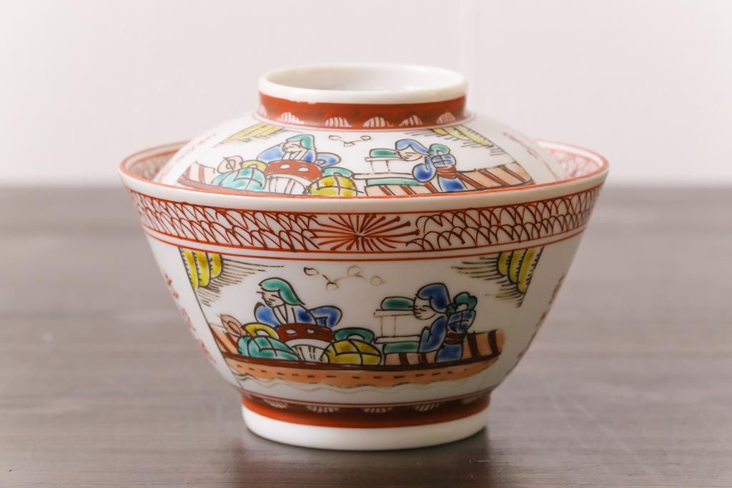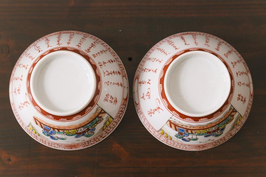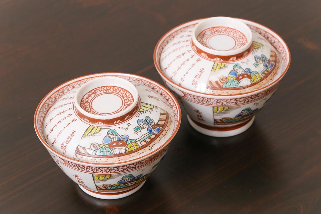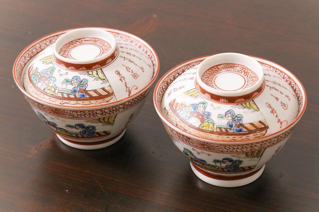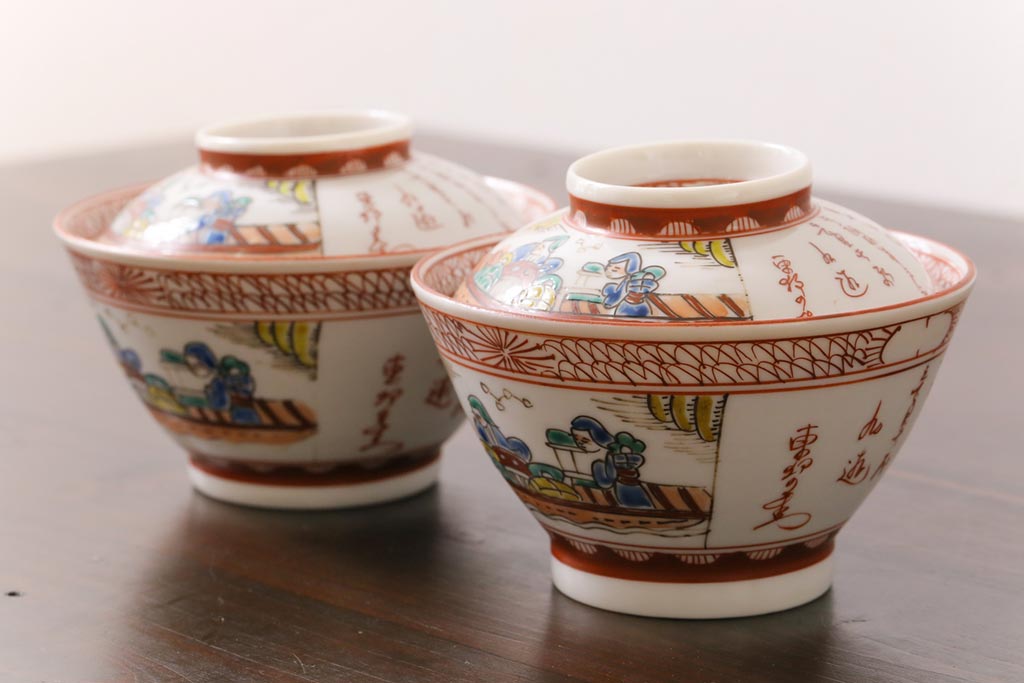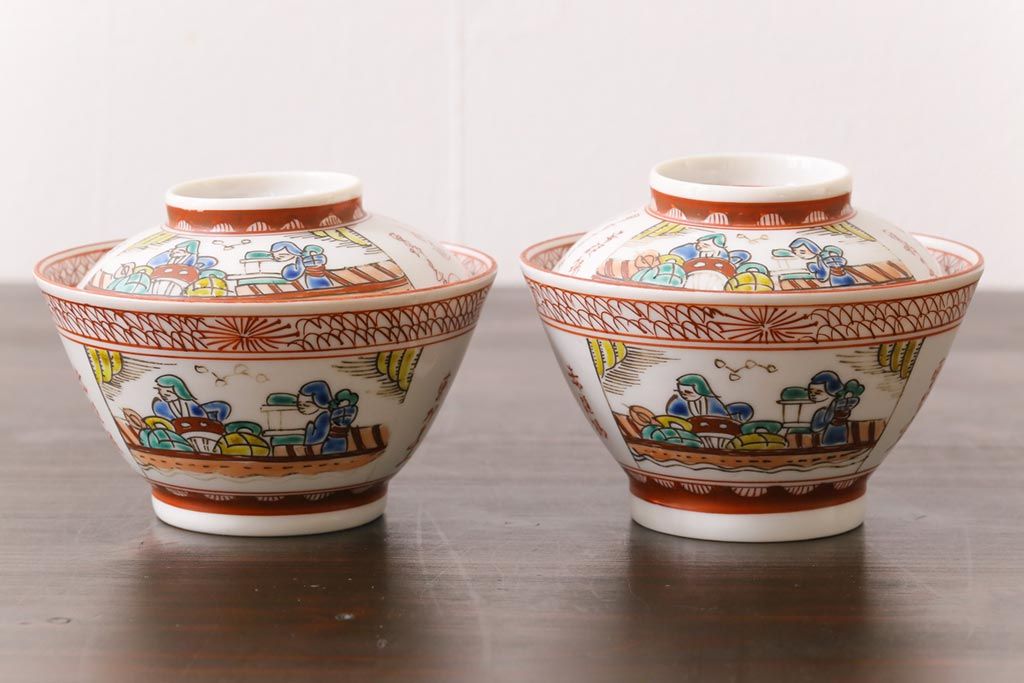 幕末明治期 赤絵染付 味わいある絵柄の蓋茶碗2客セット(和食器)(3)