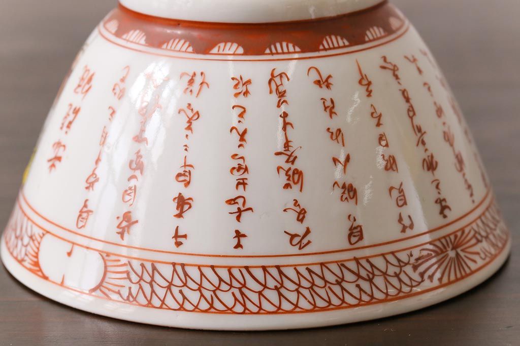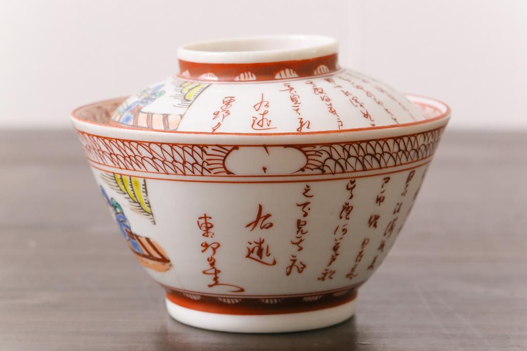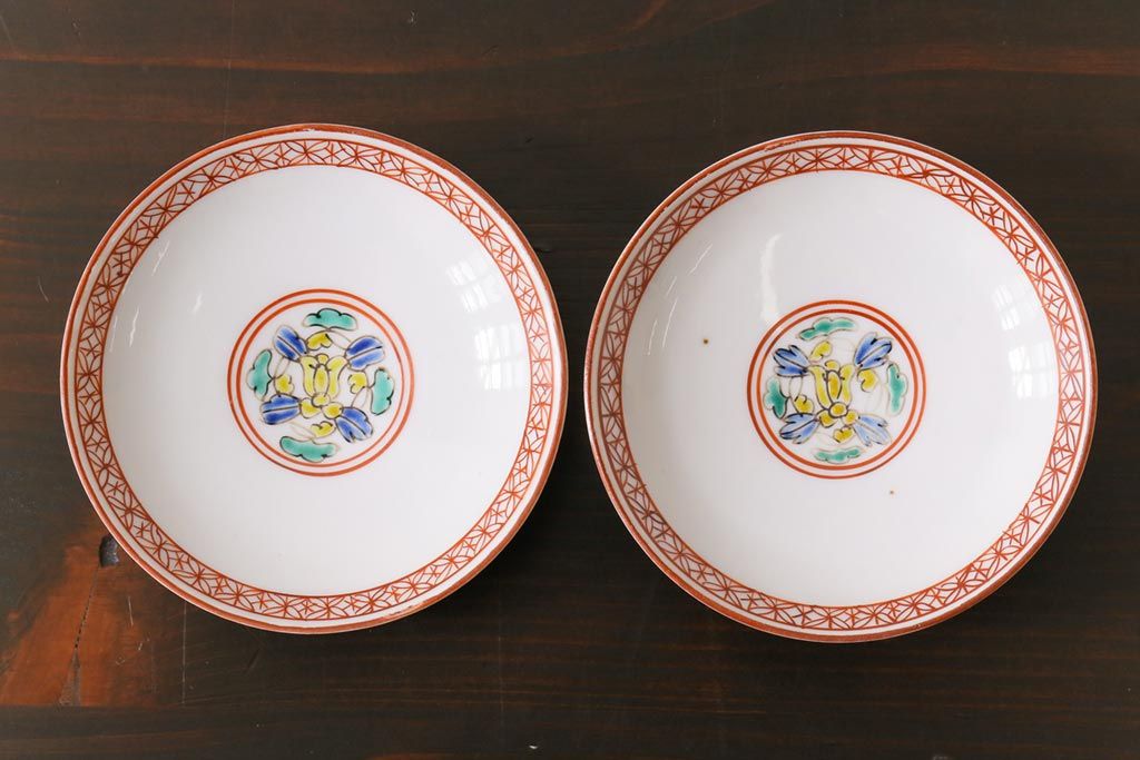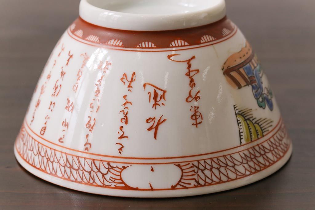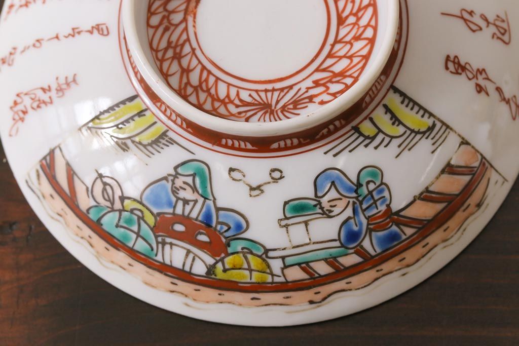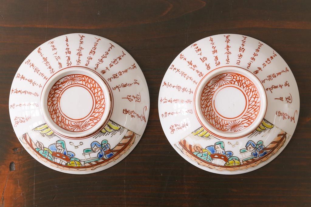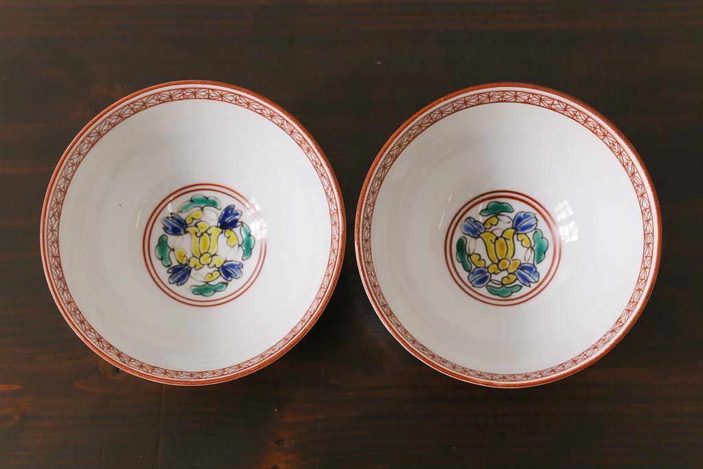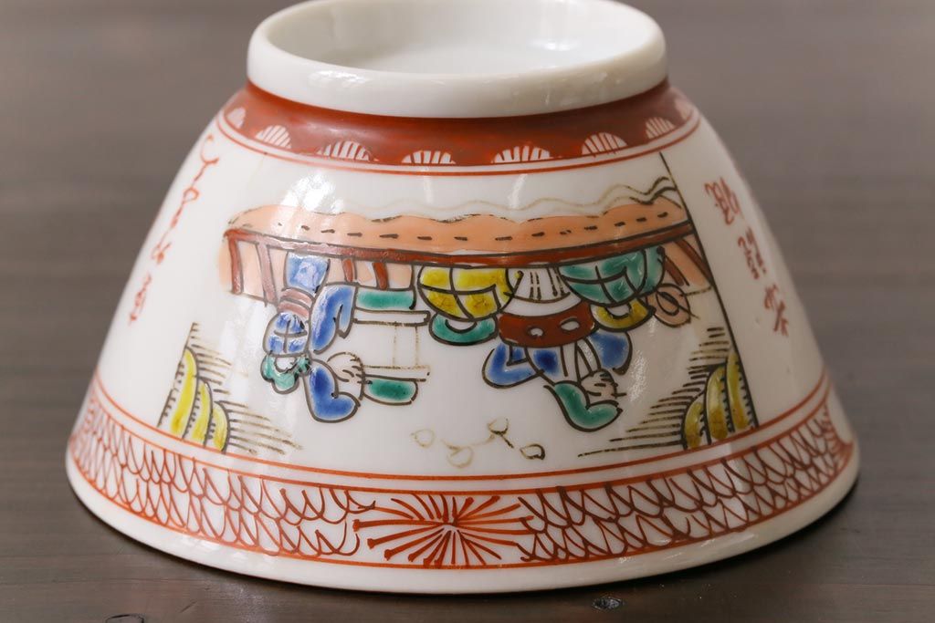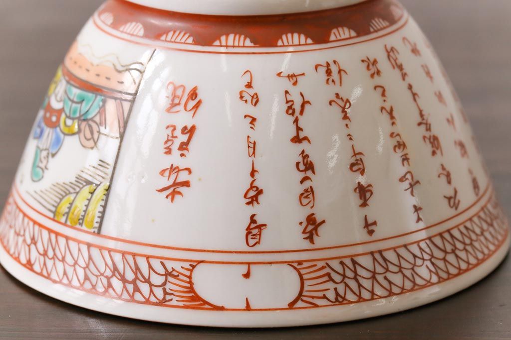 幕末明治期 赤絵染付 味わいある絵柄の蓋茶碗2客セット(和食器)(3)