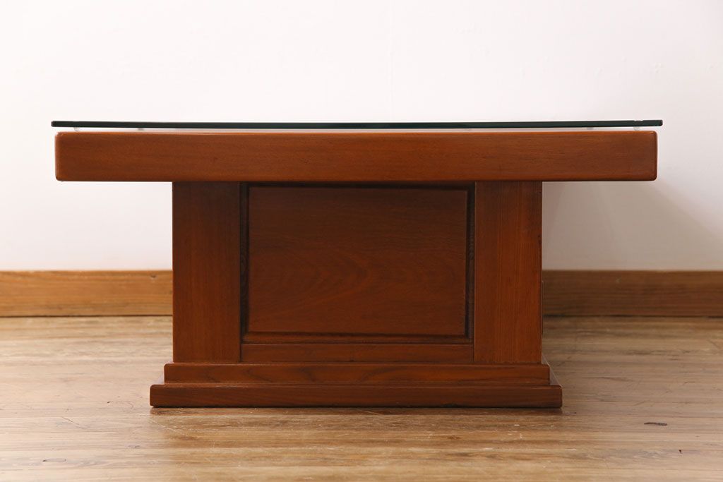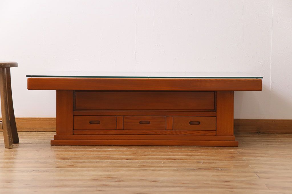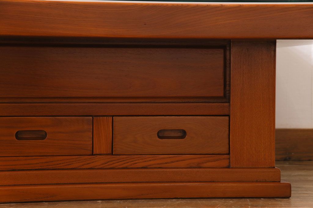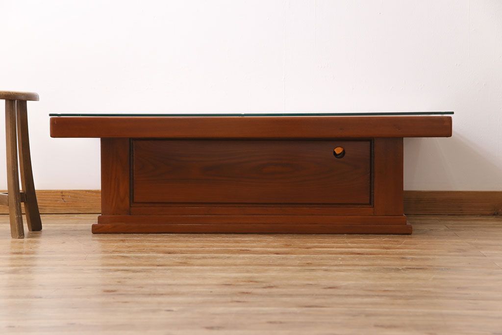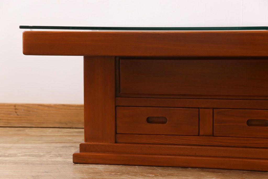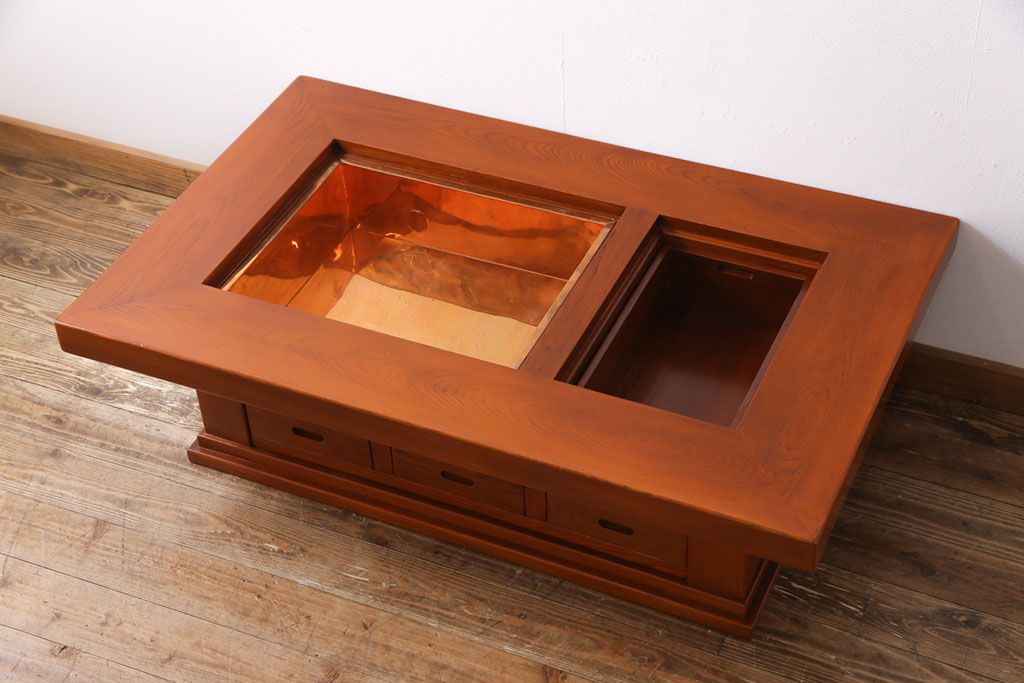 ラフジュ工房> テーブル> センターテーブル・ローテーブル > アンティーク雑貨 中古 総ケヤキ材 ガラス天板付き 四尺 杢目が美しい関西火鉢(長火鉢、囲炉裏、テーブル)(2)