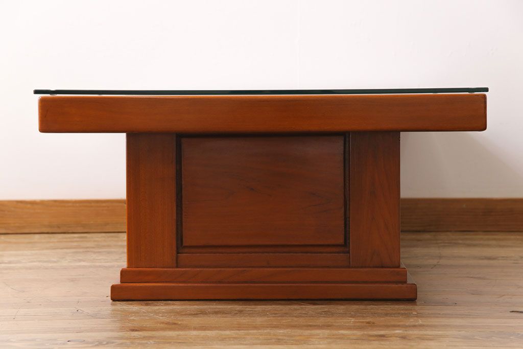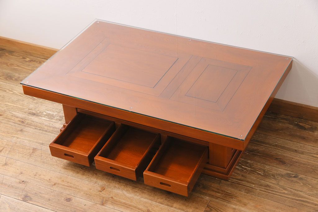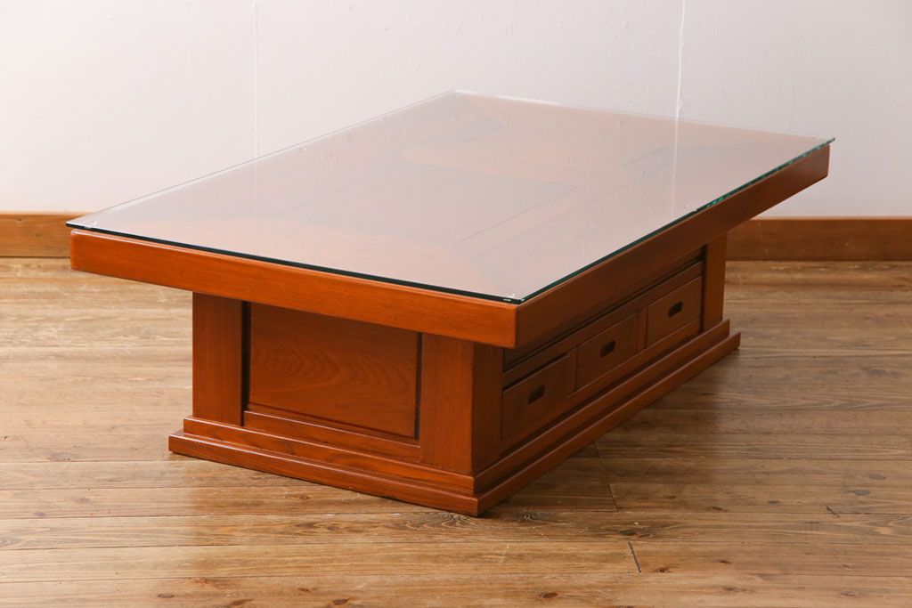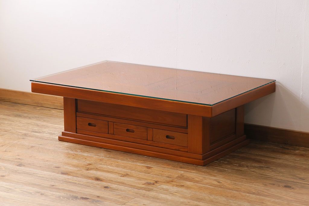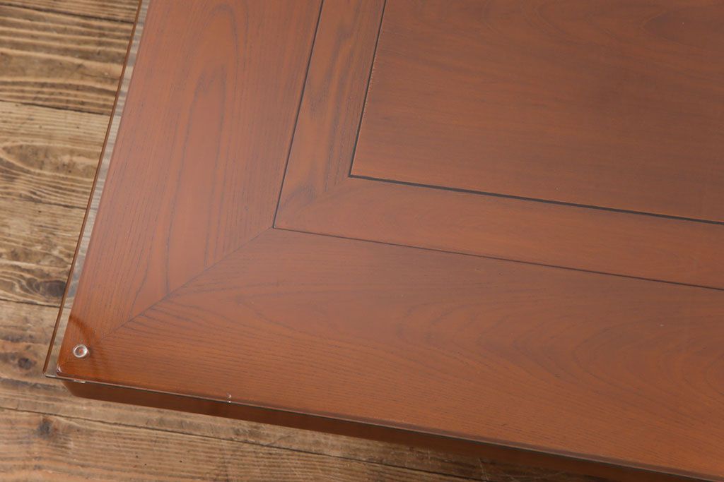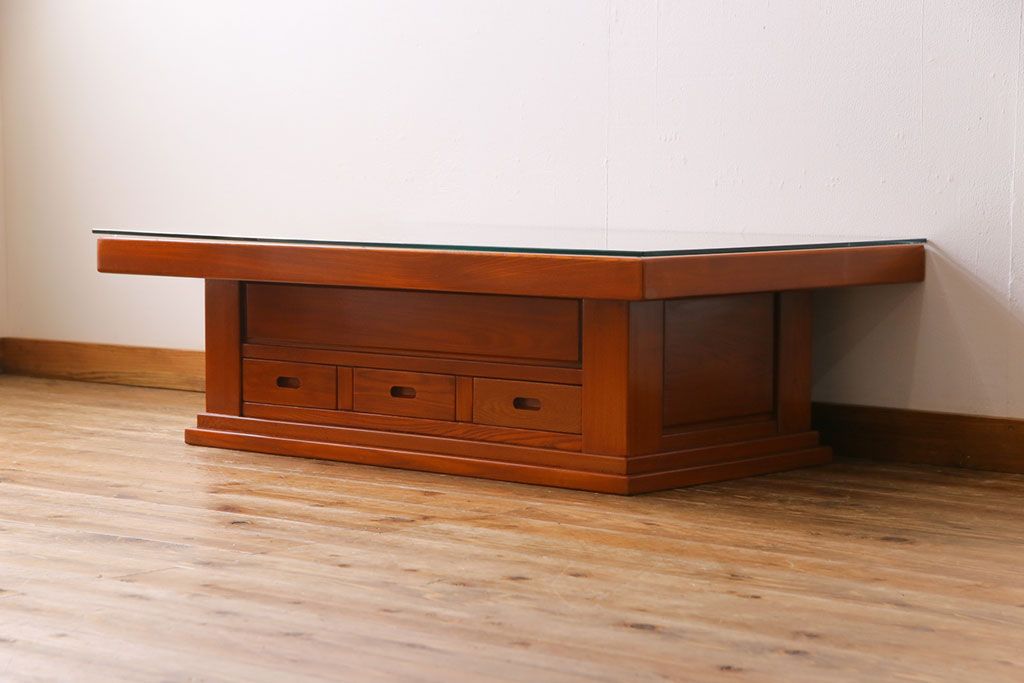 ラフジュ工房> テーブル> センターテーブル・ローテーブル > アンティーク雑貨 中古 総ケヤキ材 ガラス天板付き 四尺 杢目が美しい関西火鉢(長火鉢、囲炉裏、テーブル)(2)