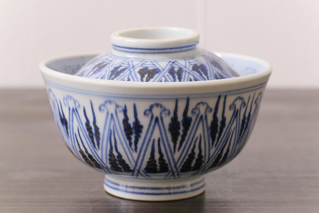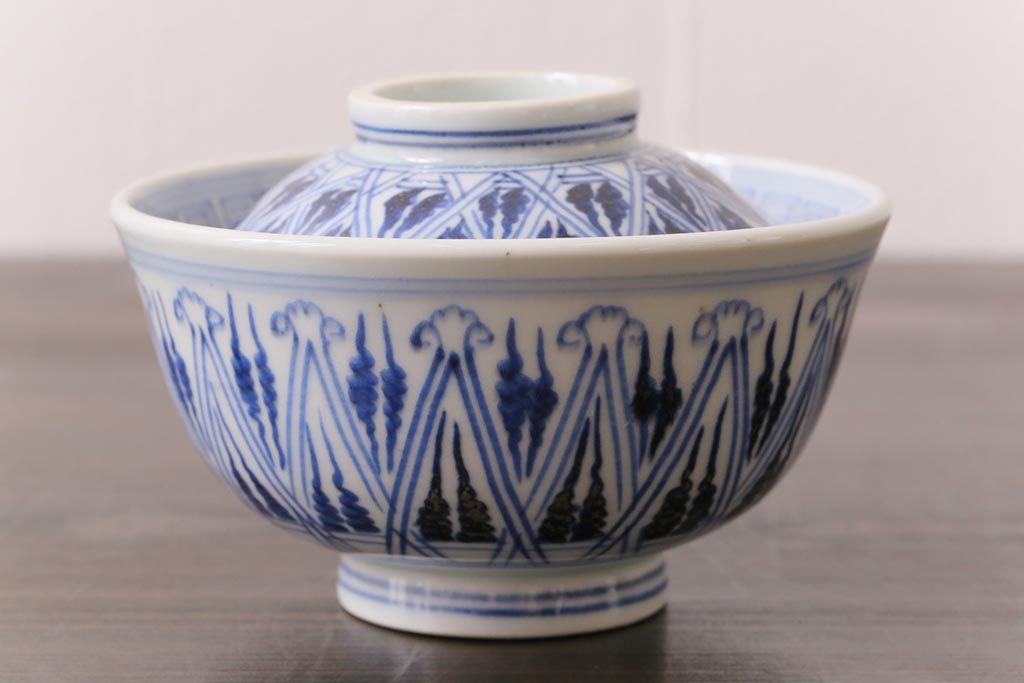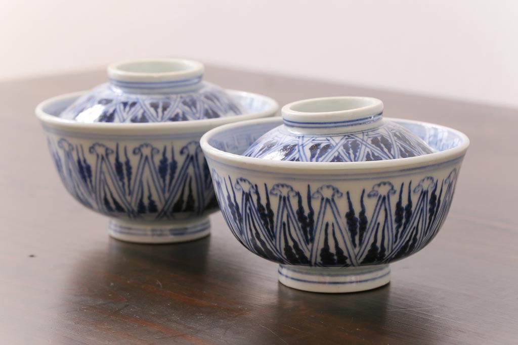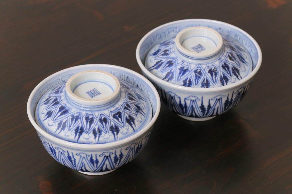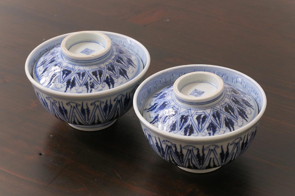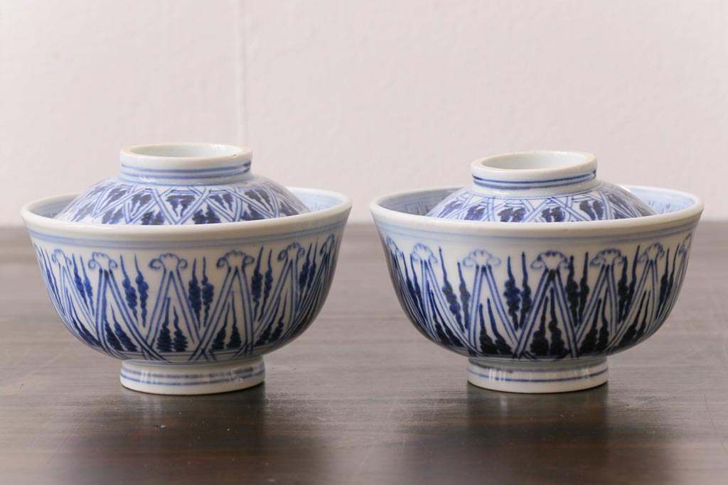 古民具・骨董 幕末明治期 味のある絵柄のアンティーク蓋付茶碗2客セット(和食器)(3)