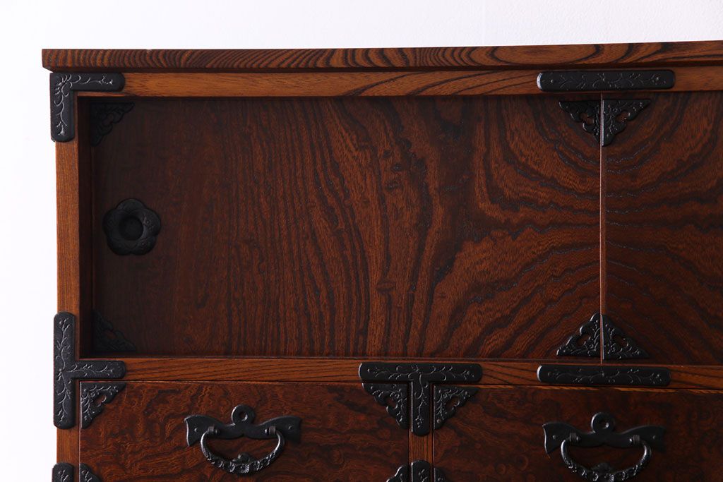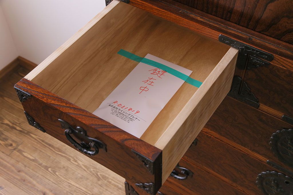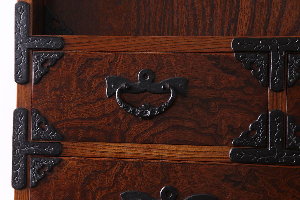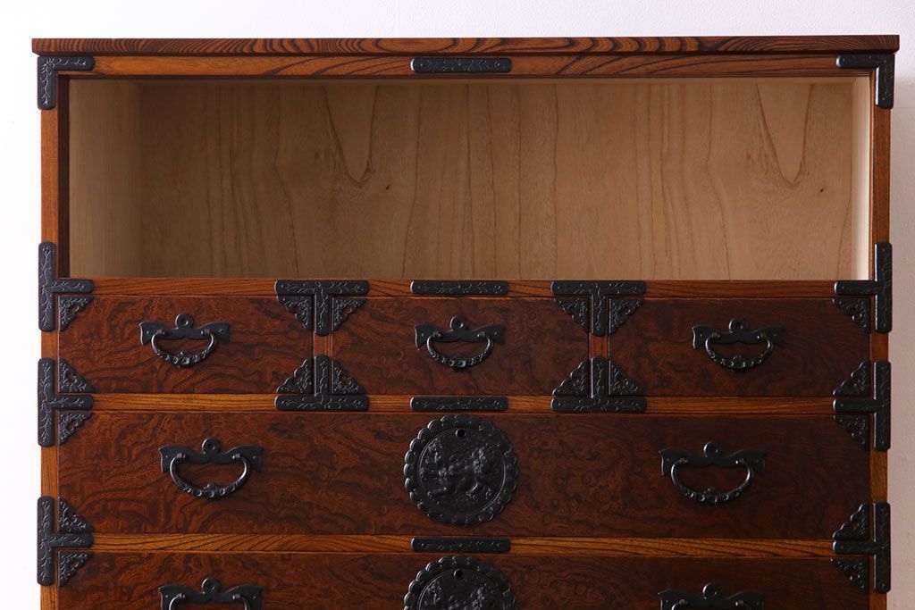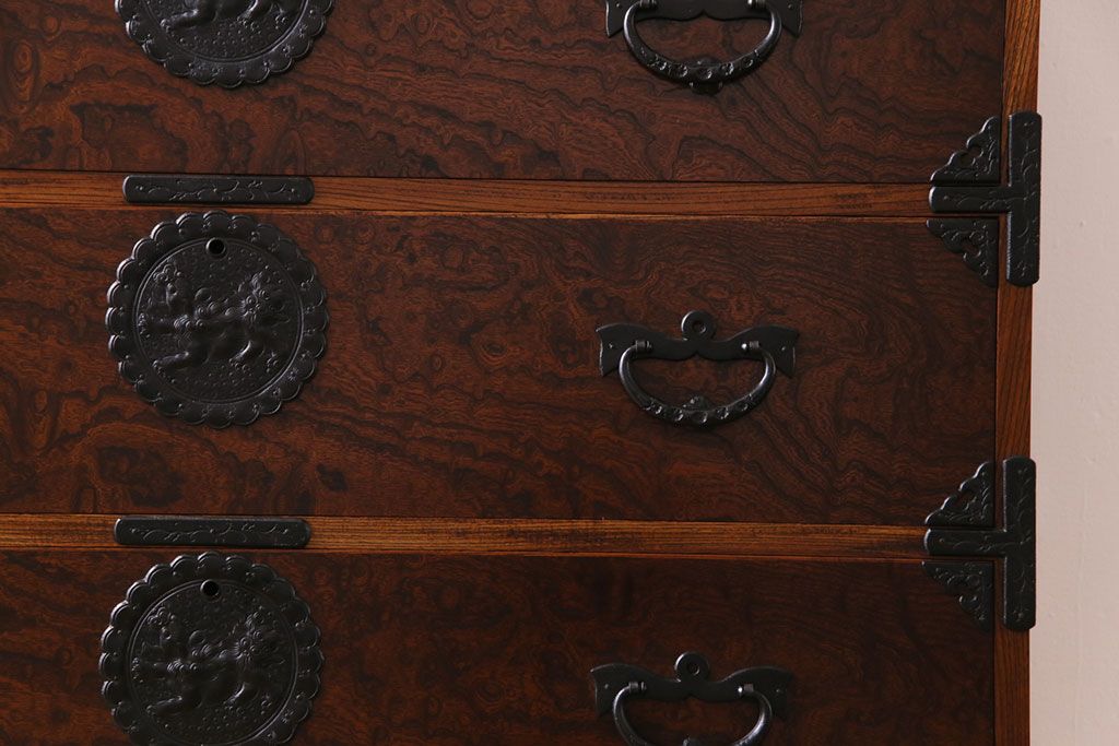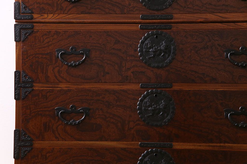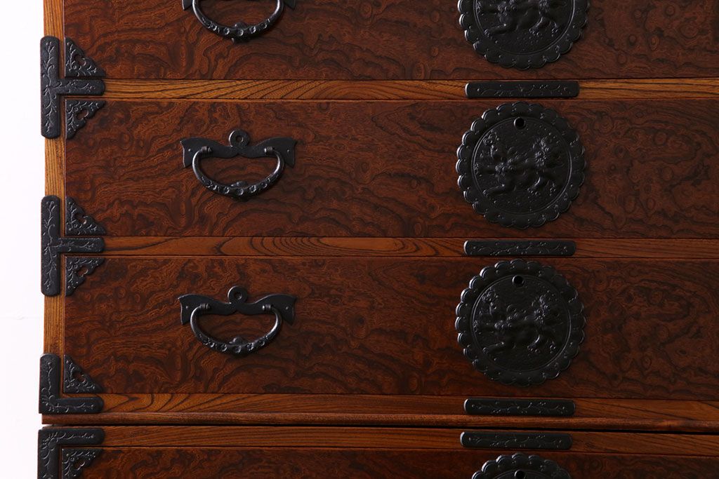 ラフジュ工房> 和箪笥> 衣装箪笥 > 中古美品 岩谷堂箪笥 獅子モチーフの金具が目を引く重ね箪笥(チェスト、整理箪笥)