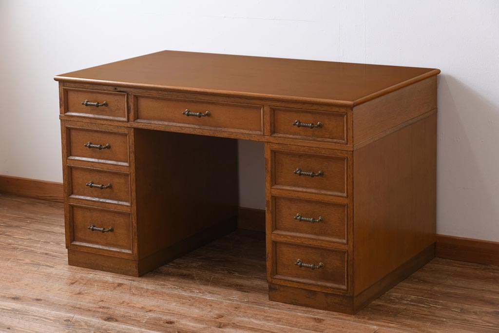デスク> ワークデスク > ビンテージ 神戸洋家具 組み立て式 凝った取っ手がシックな印象を与えるナラ材のワークデスク(両袖机、在宅ワーク、在宅用)