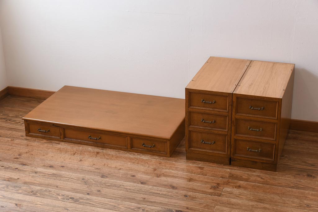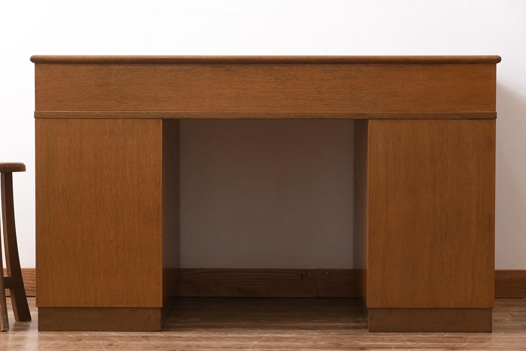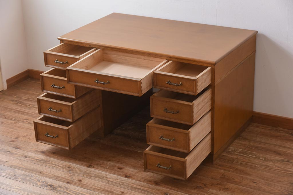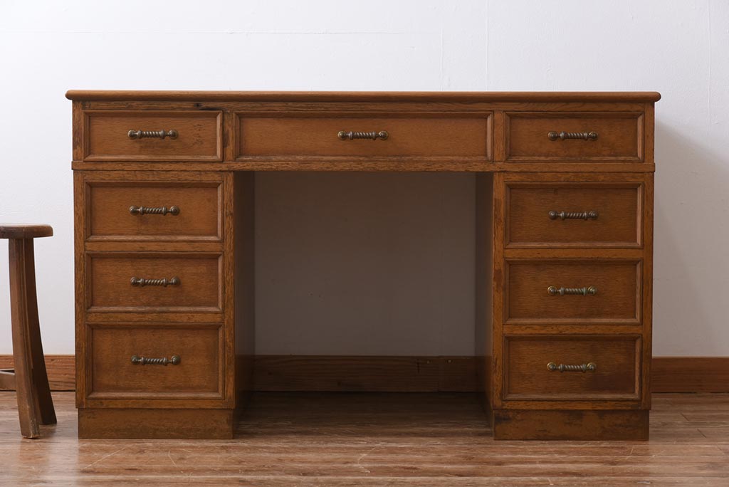 ビンテージ 神戸洋家具 組み立て式 凝った取っ手がシックな印象を与えるナラ材のワークデスク(両袖机)です。