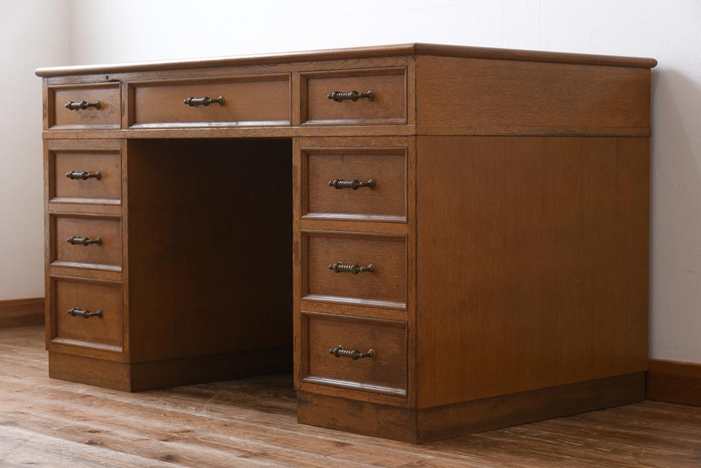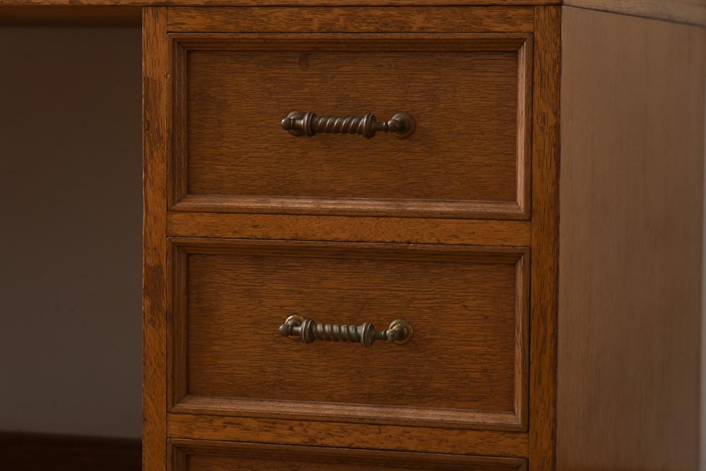 ビンテージ 神戸洋家具 組み立て式 凝った取っ手がシックな印象を与えるナラ材のワークデスク(両袖机、在宅ワーク、在宅用)